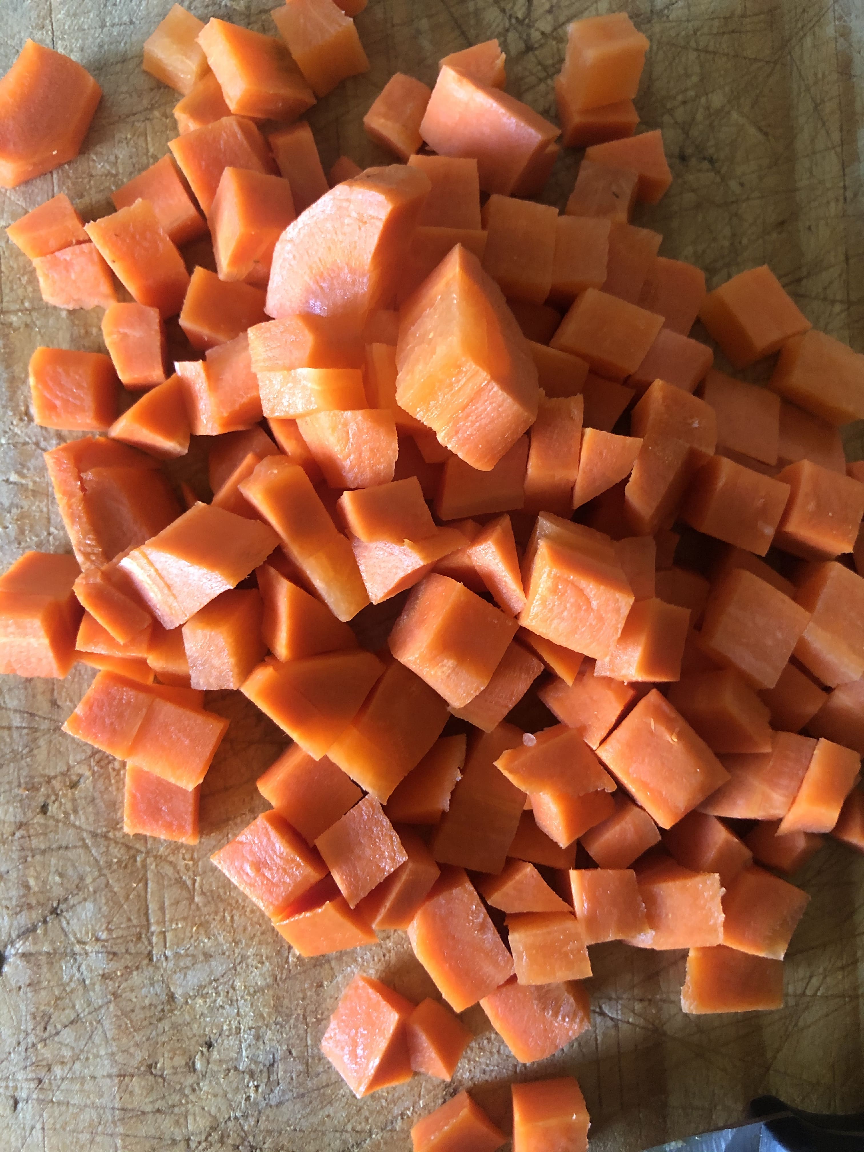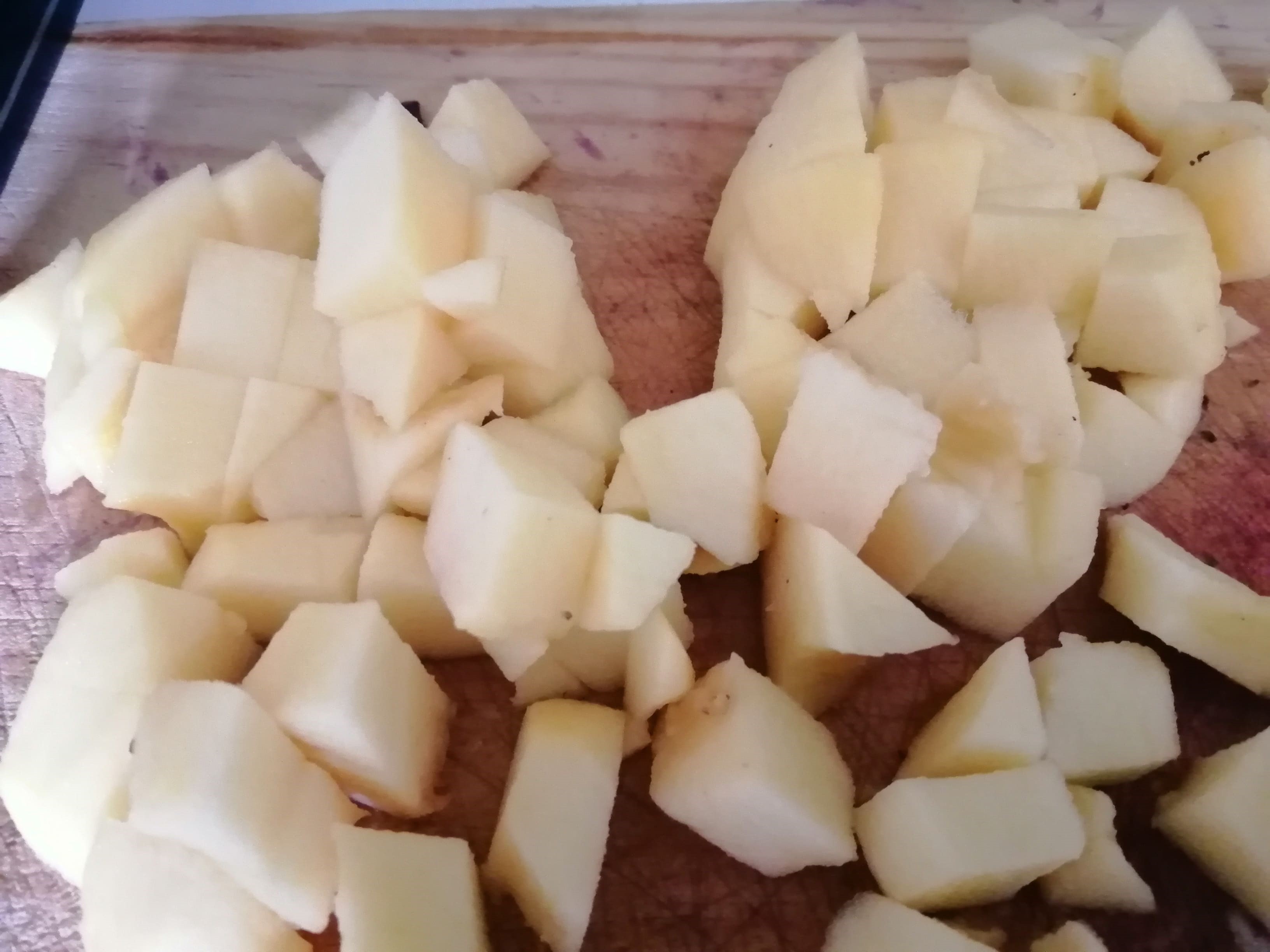Pela las patatas y las zanahorias y córtalas en dados pequeños. Corta la cebolla finamente.