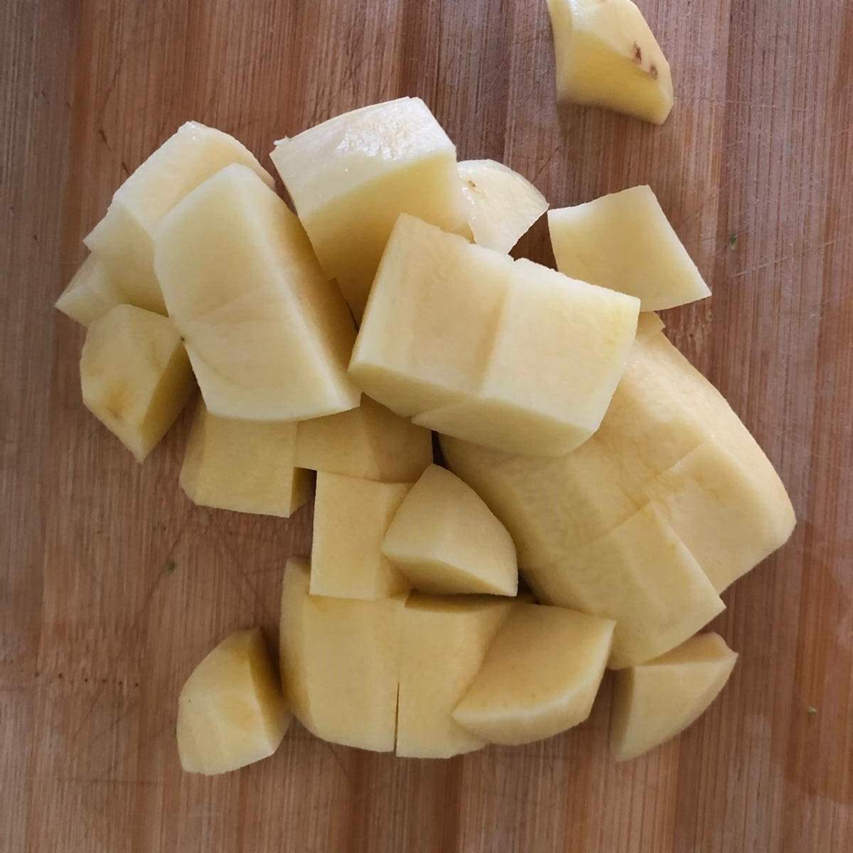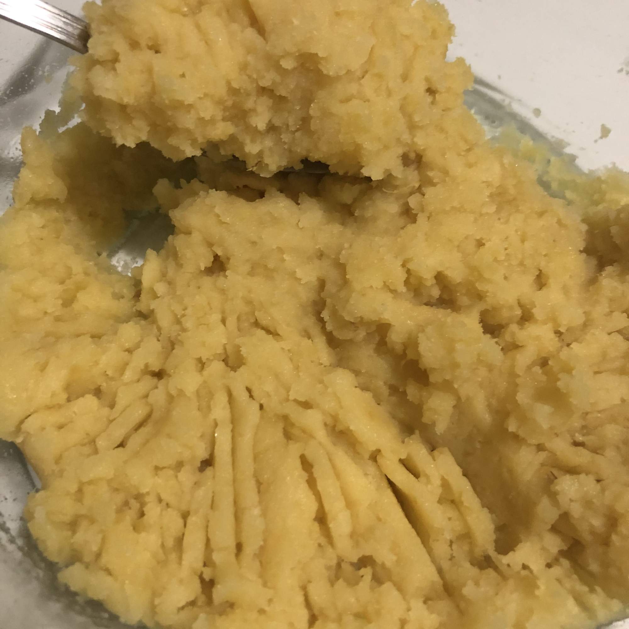 Pela las patatas, lava y corta en dados medianos. Pon agua en una cazuela con un poco de sal y lleva a ebullición. Cuece las patatas durante 30 minutos o hasta que estén tiernas. Una vez cocidas, escurre con un colador y deja enfriar. Después, aplástalas con un tenedor. Rectifica el punto de sal y añade un par de cucharadas de aceite de oliva para que ligue mejor.