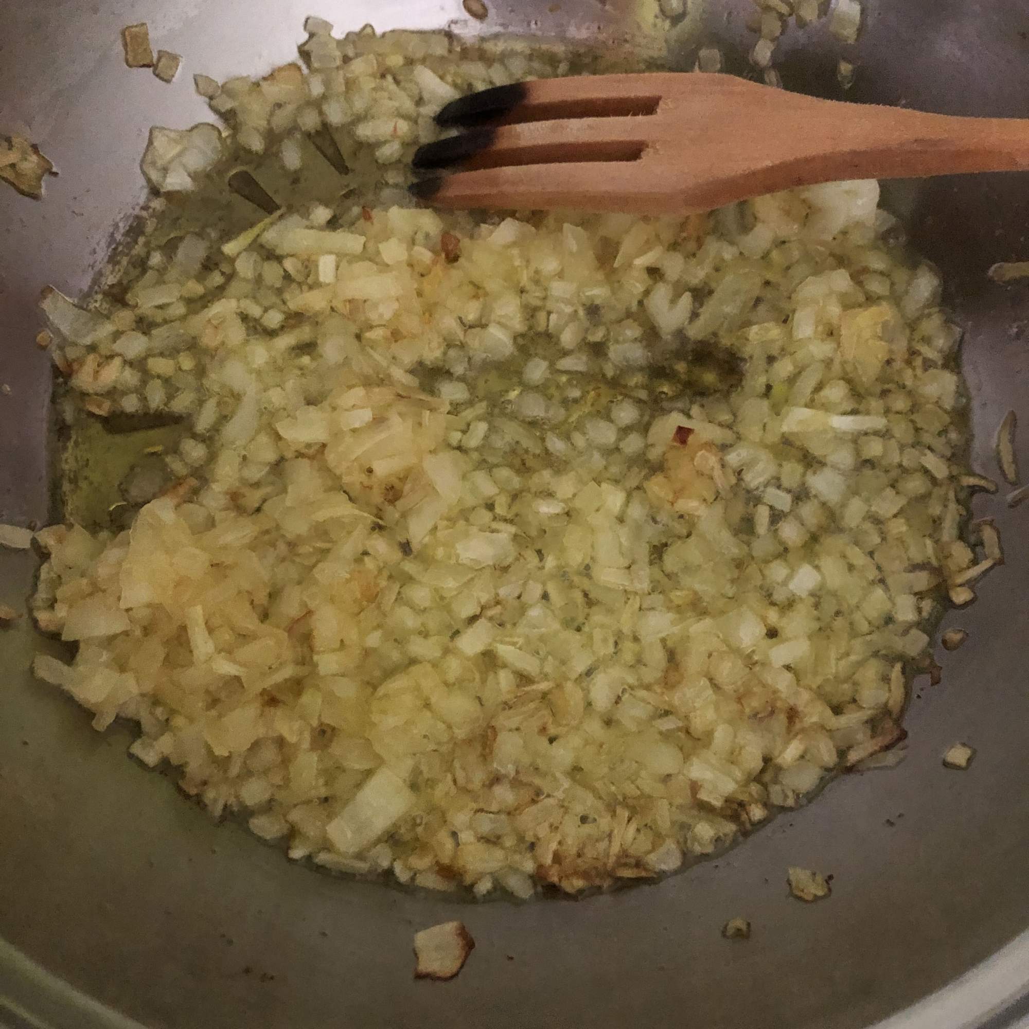 Pica la cebolla finamente. En una sartén con un poco de aceite, pocha la cebolla a fuego bajo. Cuando esté un poco transparente, añade la soja (no la vamos a hidratar porque se va a cocinar junto con la salsa). Salpimenta al gusto y remueve de vez en cuando.