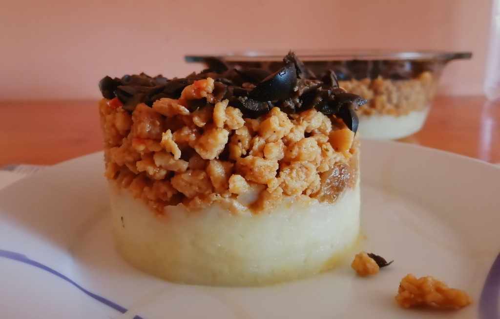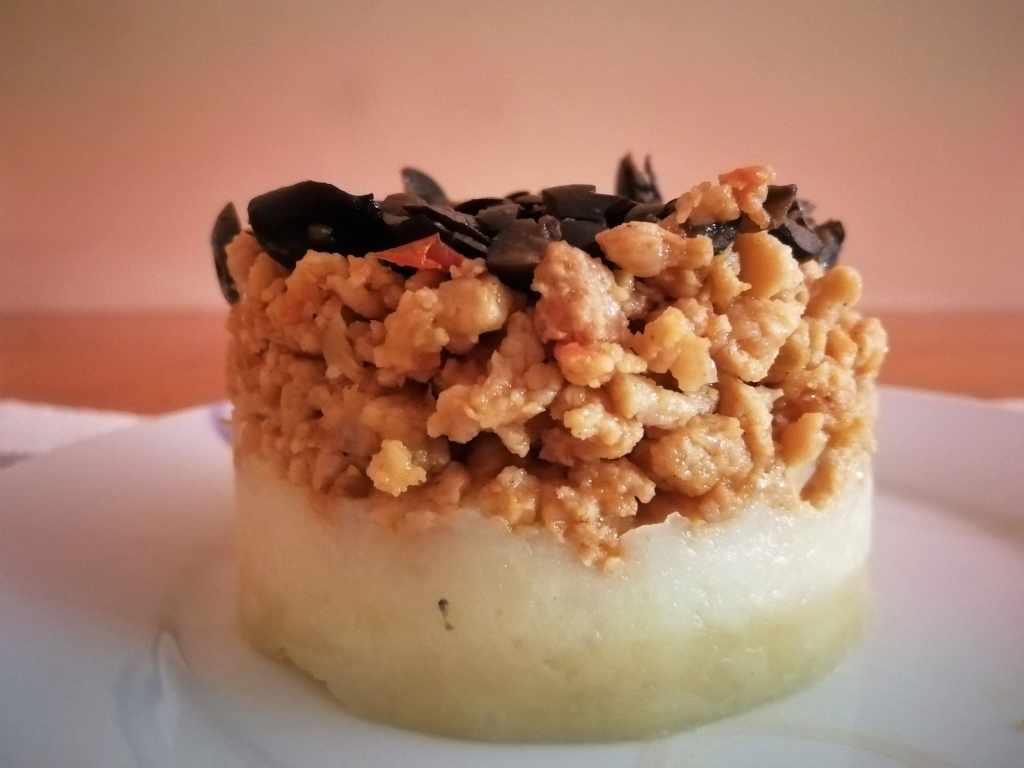 Para montar el plato utiliza un molde para emplatar. Coloca una capa de patata en la base y presiona. Encima, coloca la «carne» y, por último, las aceitunas cortadas en rodajas. Sirve bien caliente y disfruta.