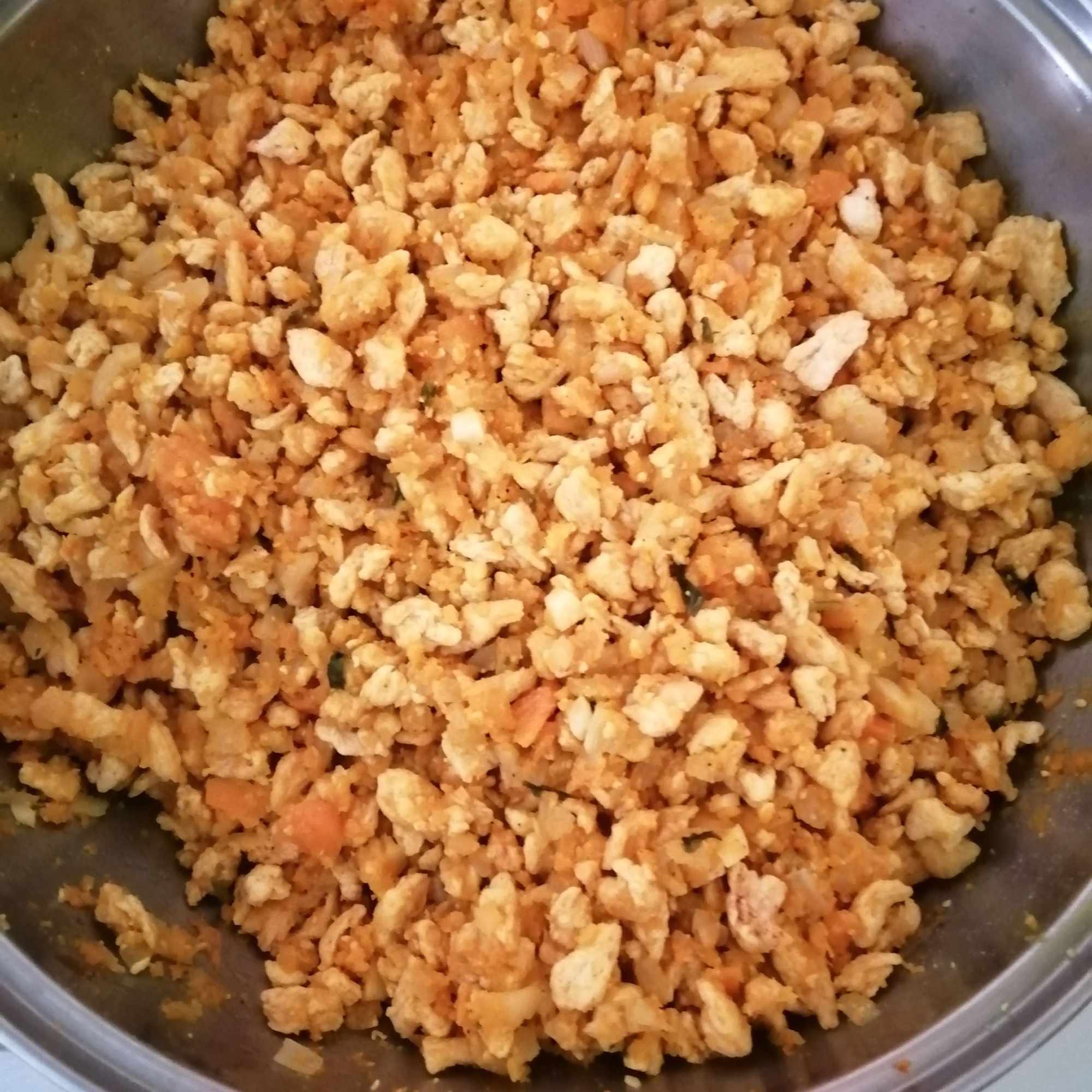 Me he decidido a hacerla porque mi última adquisición ha sido la soja texturizada. !Madre mía, qué descubrimiento! No sabéis la de veces que he visto este ingrediente en diferentes recetas, pero no sé por qué, no me decidía a comprarla… ¿Sabéis qué? Me ha abierto un mundo de posibilidades. De hecho, estoy pensando dedicar una entrada al mes a versionar recetas con soja texturizada. Me ha encantado. Lo mejor de todo es que a mi madre también, y es de las que dicen «hija, qué cosas más raras comes» jajajaaj.
