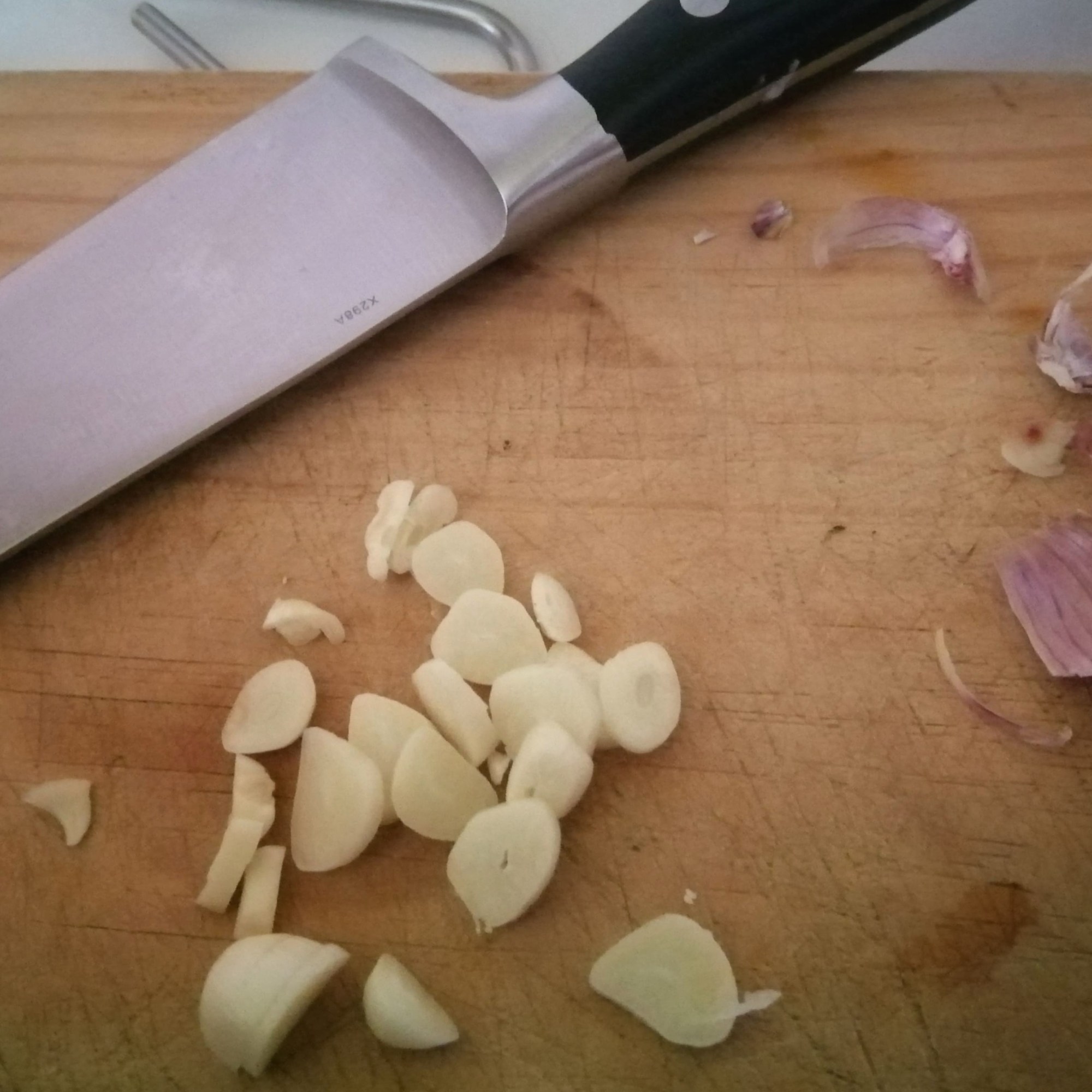 Por último, pica tres dientes de ajo en láminas. Sofríe en un poco de aceite y, cuando estén un poco dorados, añade el pimentón. Remueve unos segundos, sin que llegue a quemarse. Rocía por encima de la coliflor y sirve.