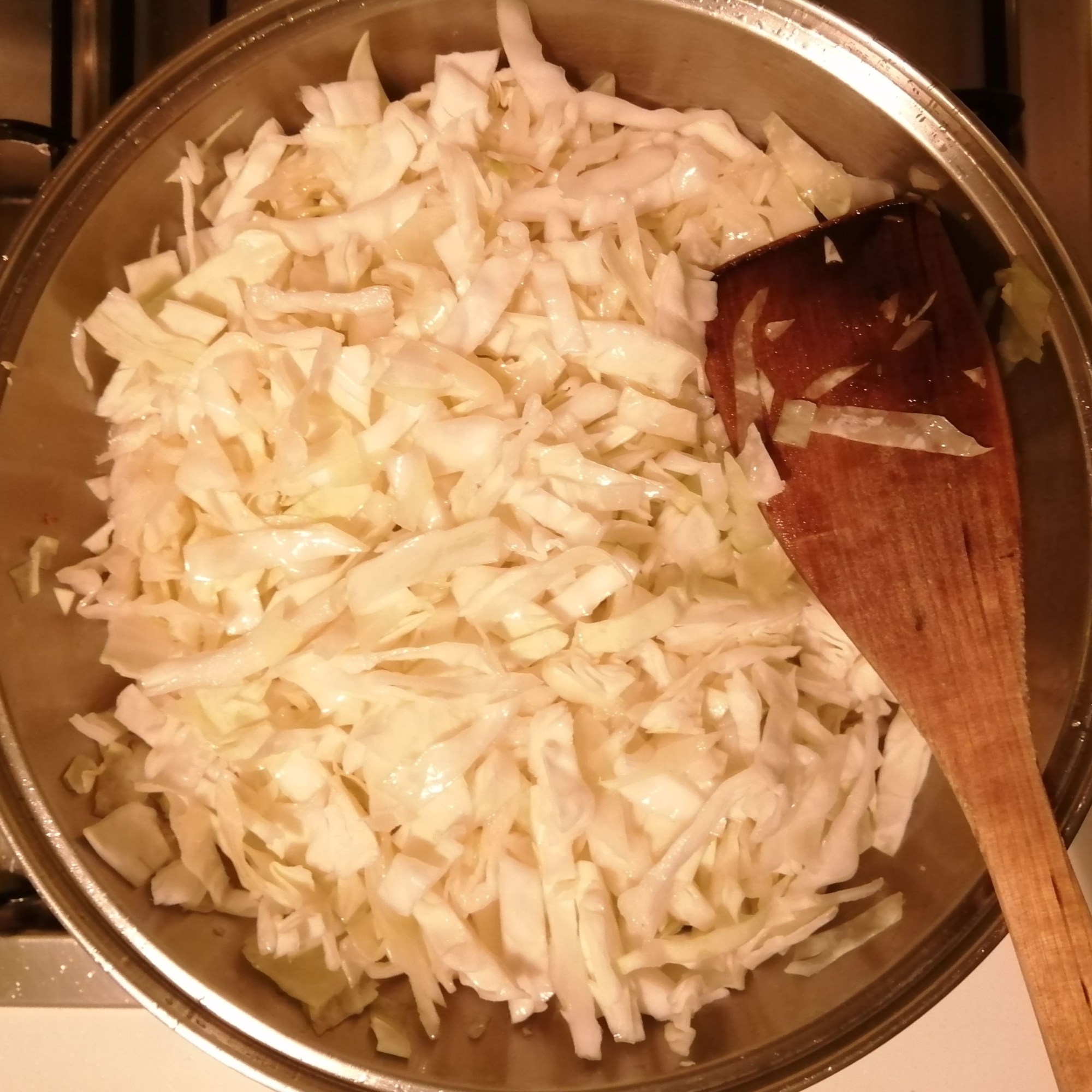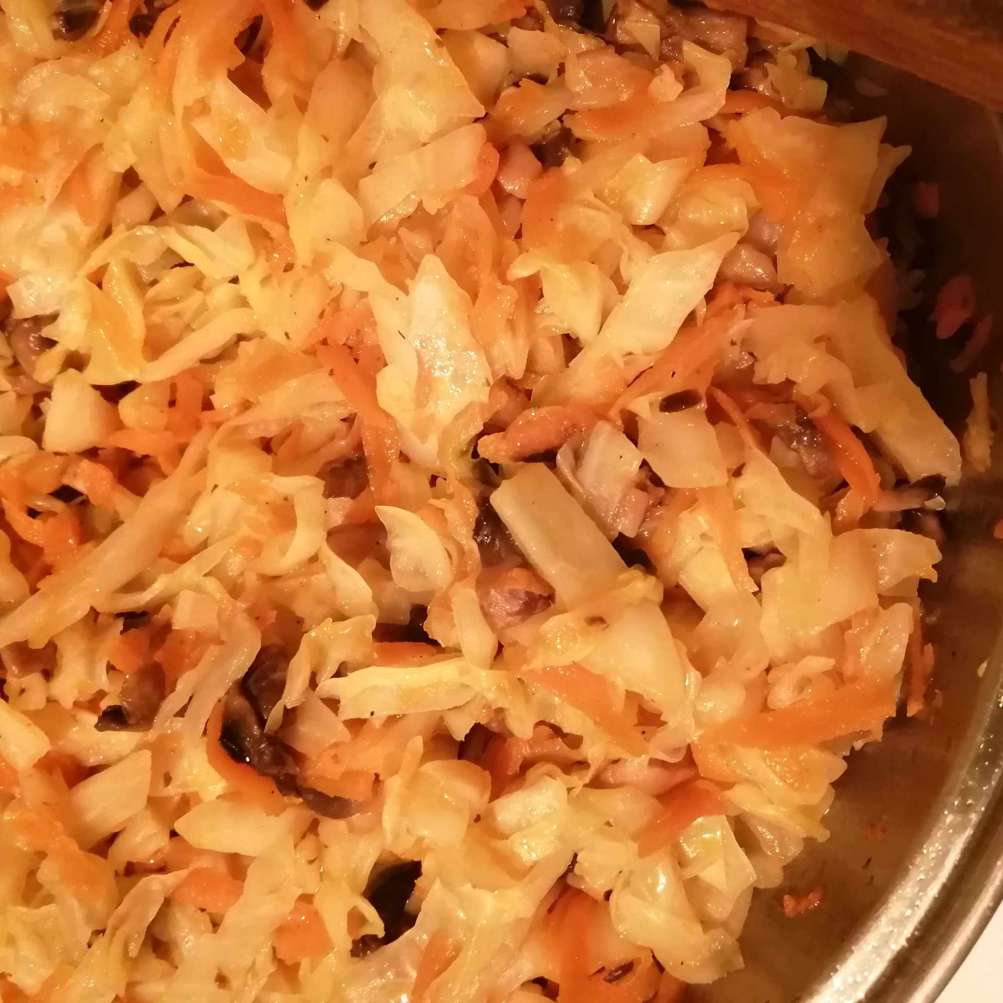 Si tienes un wok, ideal. En caso contrario, vierte un poco de aceite en una sartén y sofríe a fuego bajo el ajo y el jengibre. Cuando empiece a dorarse, añade el repollo y cocina a fuego bajo-medio. Una vez comience a tomar un color transparente añade la zanahoria rallada, remueve y cocina por unos minutos. Por último, añade las setas y champiñones, salpimenta y termina de cocinar. Puedes hacer las verduras al dente o cocinarlas un poco más (yo opto por cocinarlas más). Retira del fuego y reserva.