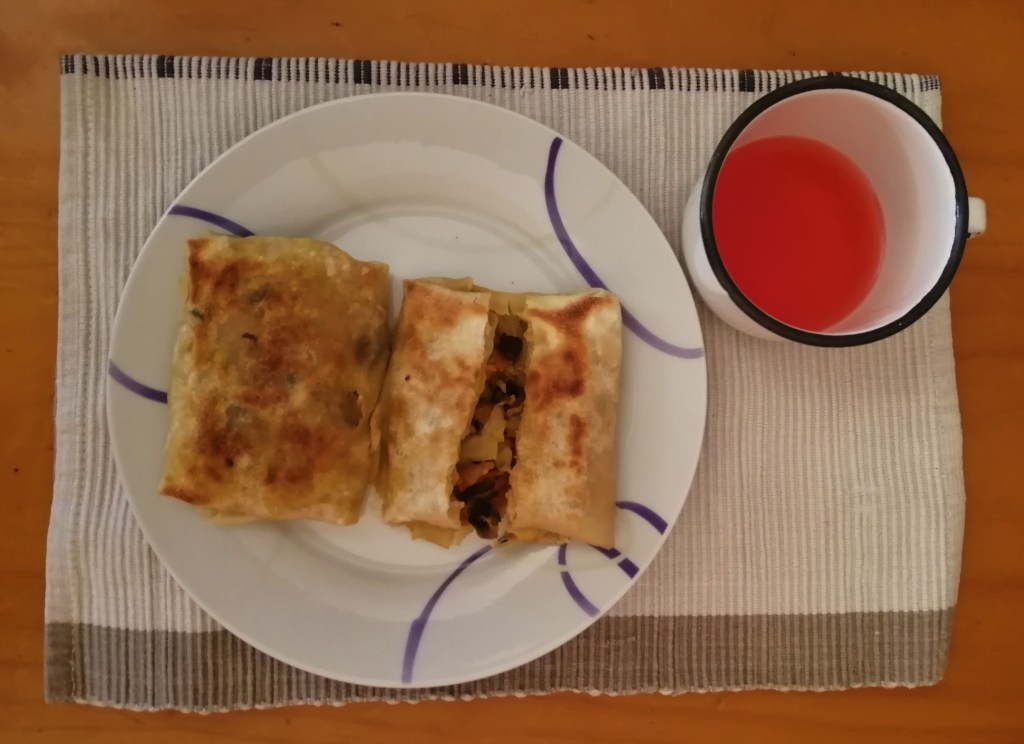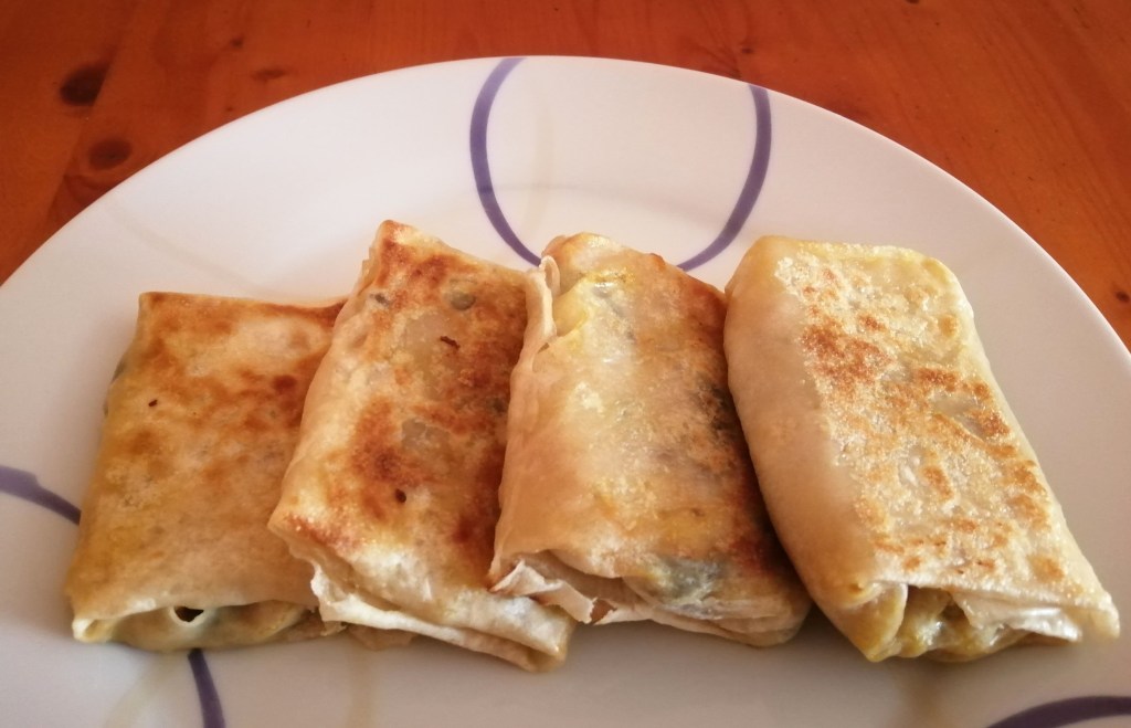 Calienta una sartén antiadherente y retira del fuego. Con un pincel de cocina !de pelo! ve «pintando» el fondo, cubriendo todos los huecos. Intenta obtener una lámina fina. Lleva la sartén al fuego (bajo) y cocina hasta que la lámina se despegue. Da la vuelta con los dedos y cocina medio minuto más.