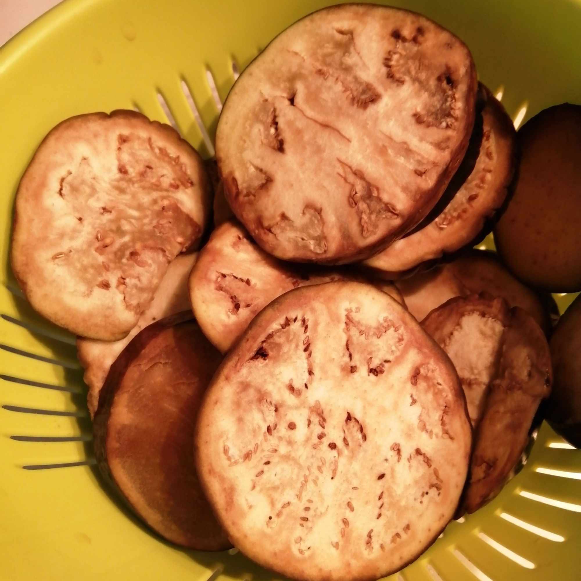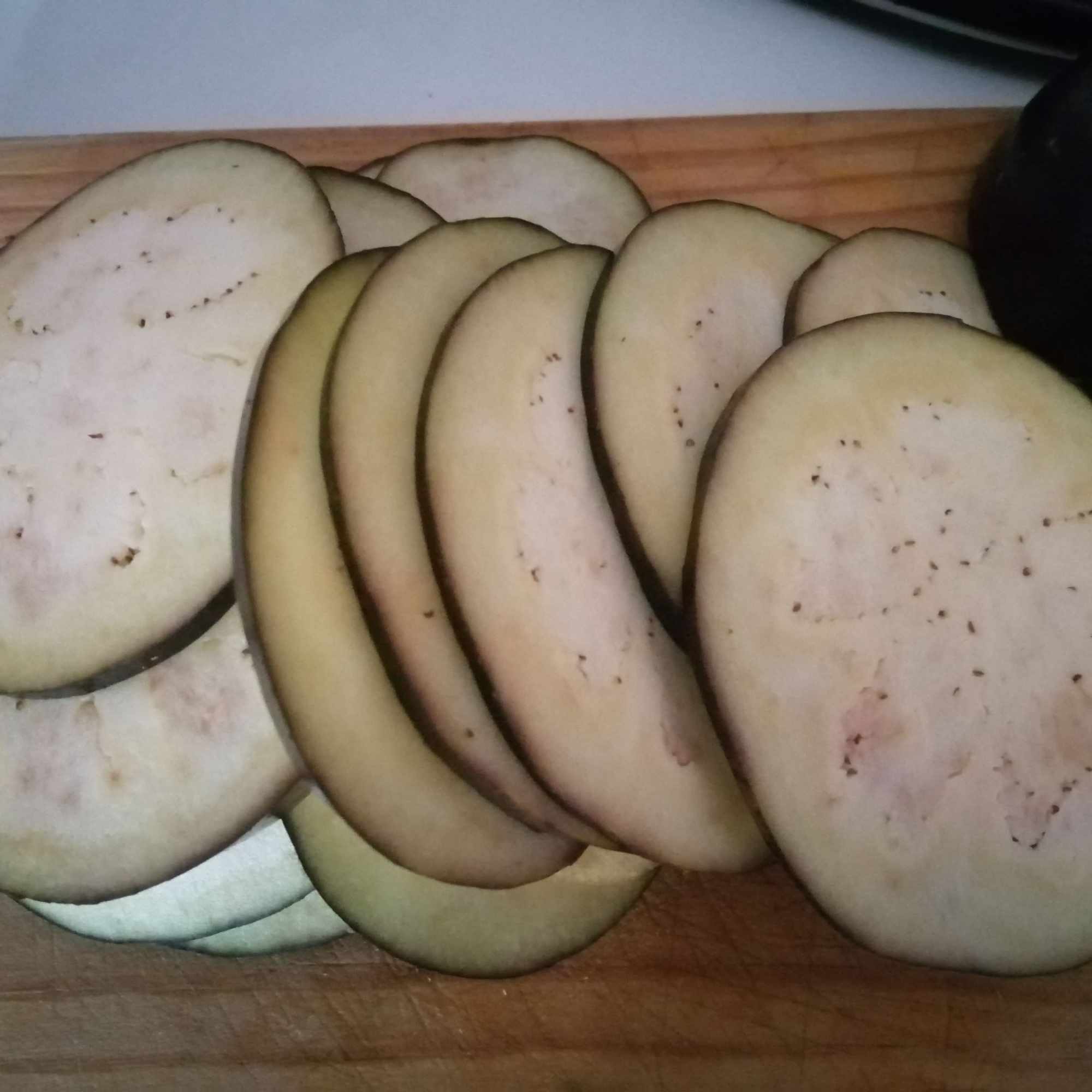 Lava bien la berenjena, ya que vamos a mantener la piel, y seca con papel de cocina. Córtala en láminas finas con una mandolina o un cuchillo grande, intentando mantener un grosor uniforme. Para quitar el amargor, pon un escurridor sobre un plato, coloca una capa de berenjenas y sala. Repite el proceso hasta terminar con la berenjena. Deja reposar unos 30 minutos. Elimina el exceso de agua y sal de las berenjenas, secando con papel de cocina.