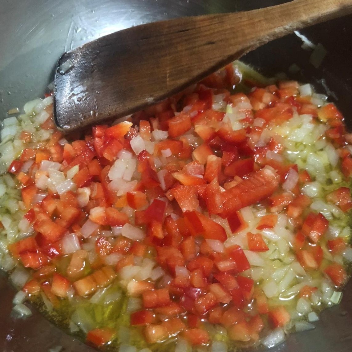 En una sartén con un poco de aceite, pocha la cebolla. Cuando esté transparente, añade el pimiento y cocina unos minutos. Agrega el ajo y, antes de que se dore demasiado, añade las setas y champiñones y cocina unos minutos más. Salpimenta.