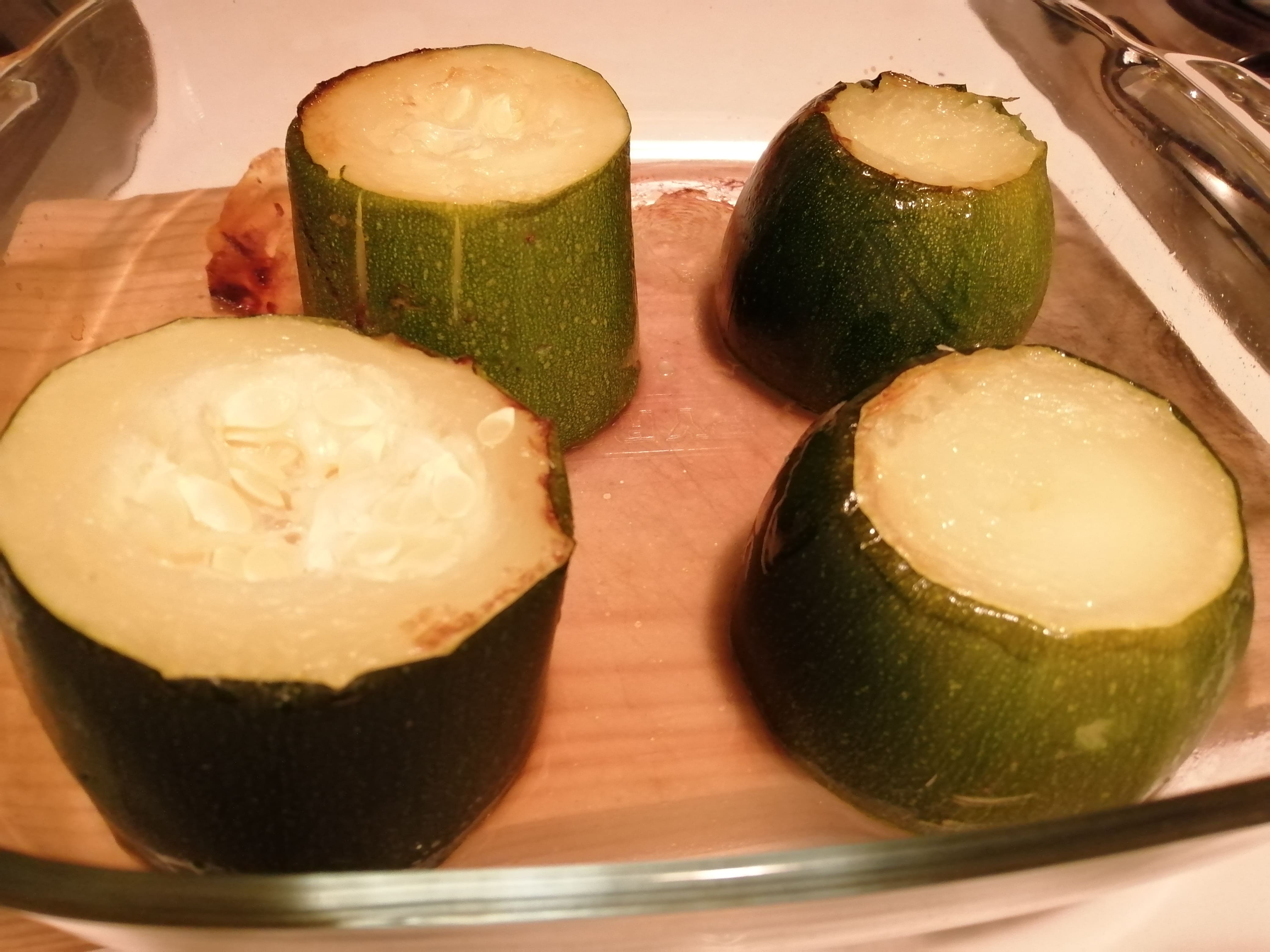 Corta el calabacín en 4 trozos de tamaño y grosor similar. Colócalos en un recipiente apto para horno y haz unos cortes en la superficie. Agrega un poco de aceite y sal. Asa los calabacines hasta que estén tiernos (en mi horno he tardado unos 40 minutos). Puedes hacer este paso al microondas o hervirlos en agua con sal. Se tarda menos pero mantienen más agua. Deja enfriar.