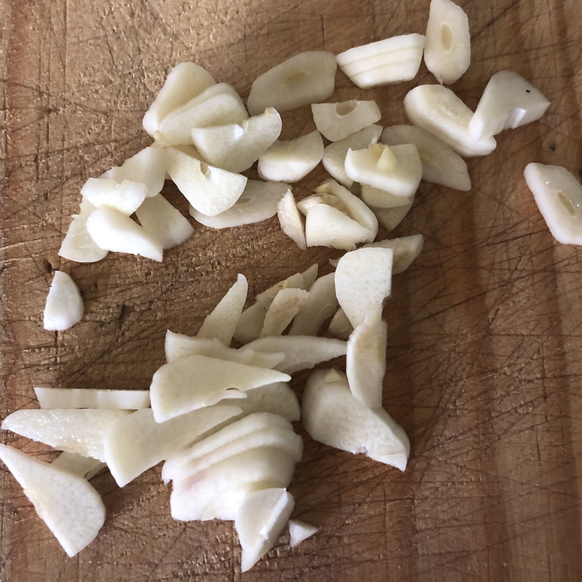 Mientras tanto, pon las gambas a descongelar. Puedes hacerlo a temperatura ambiente o utilizando un recipiente con agua fría. Pela los ajos y pícalos en láminas. Igualmente, pica la guindilla en trocitos (cuidado con llevarte las manos a los ojos después).