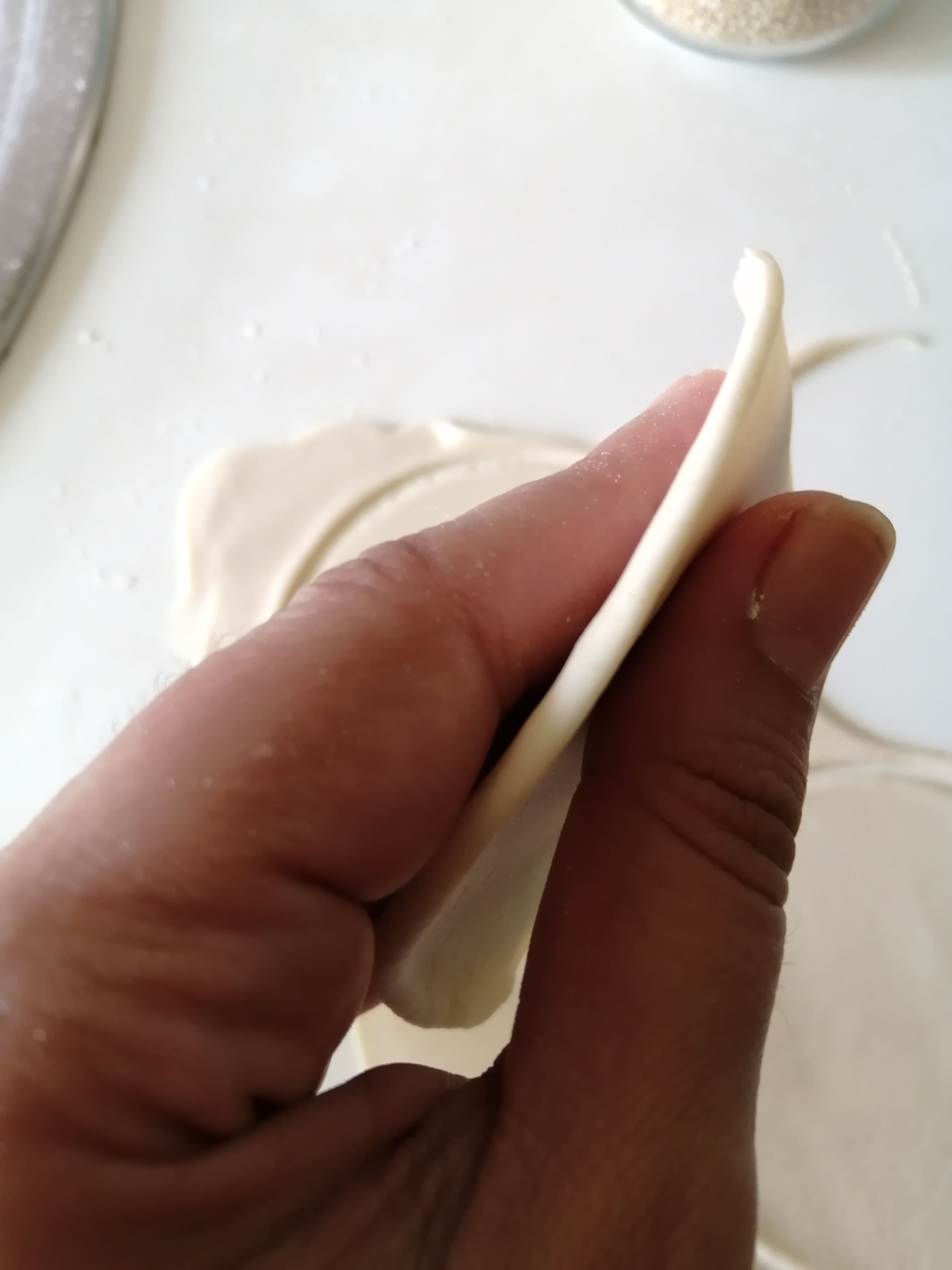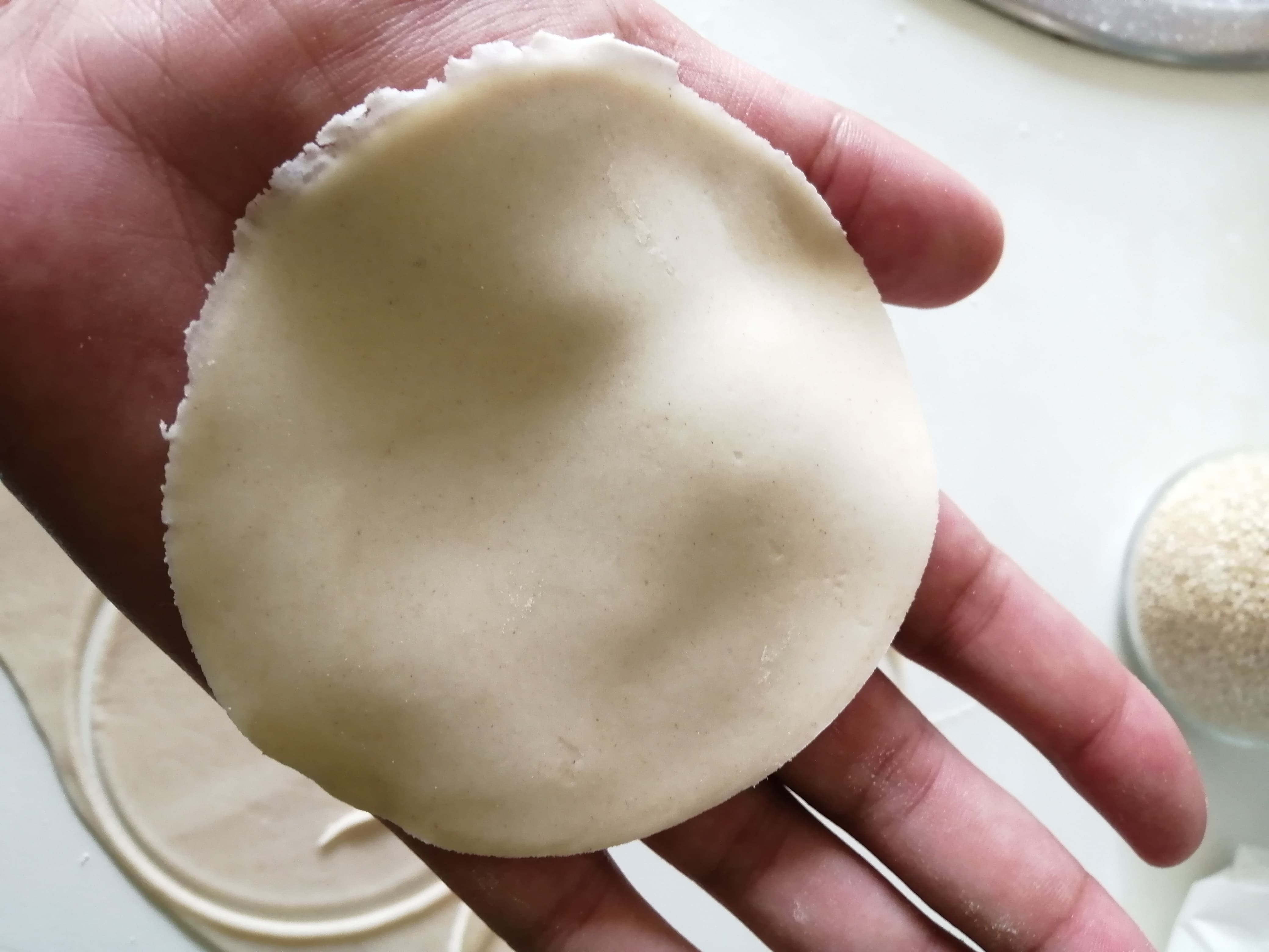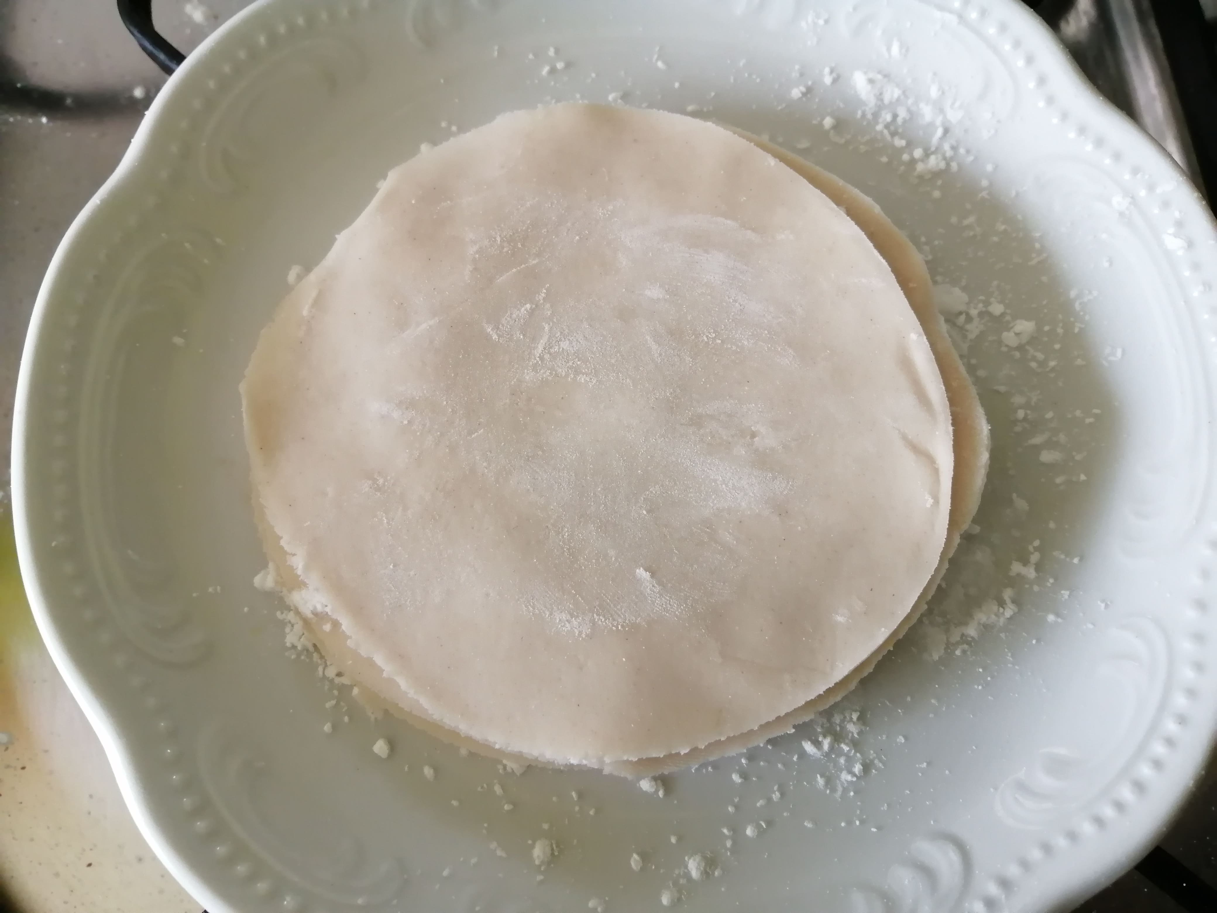 Coge la masa y córtala en 4 trozos. Estira la masa hasta dejar un grosor de medio centímetro (con un rodillo o una máquina de hacer pasta). Con ayuda de un molde o un vaso grande en su defecto, corta la masa en círculos.