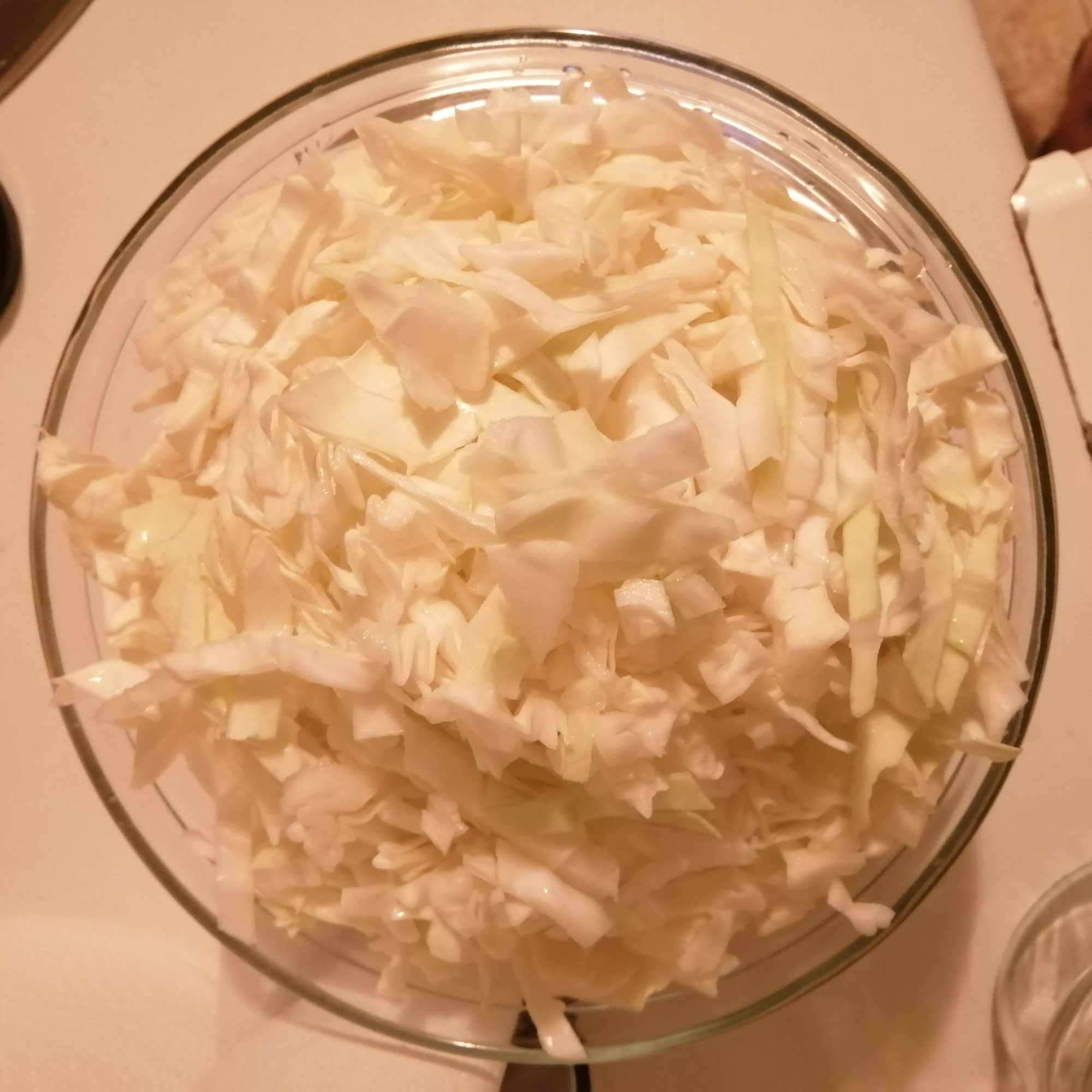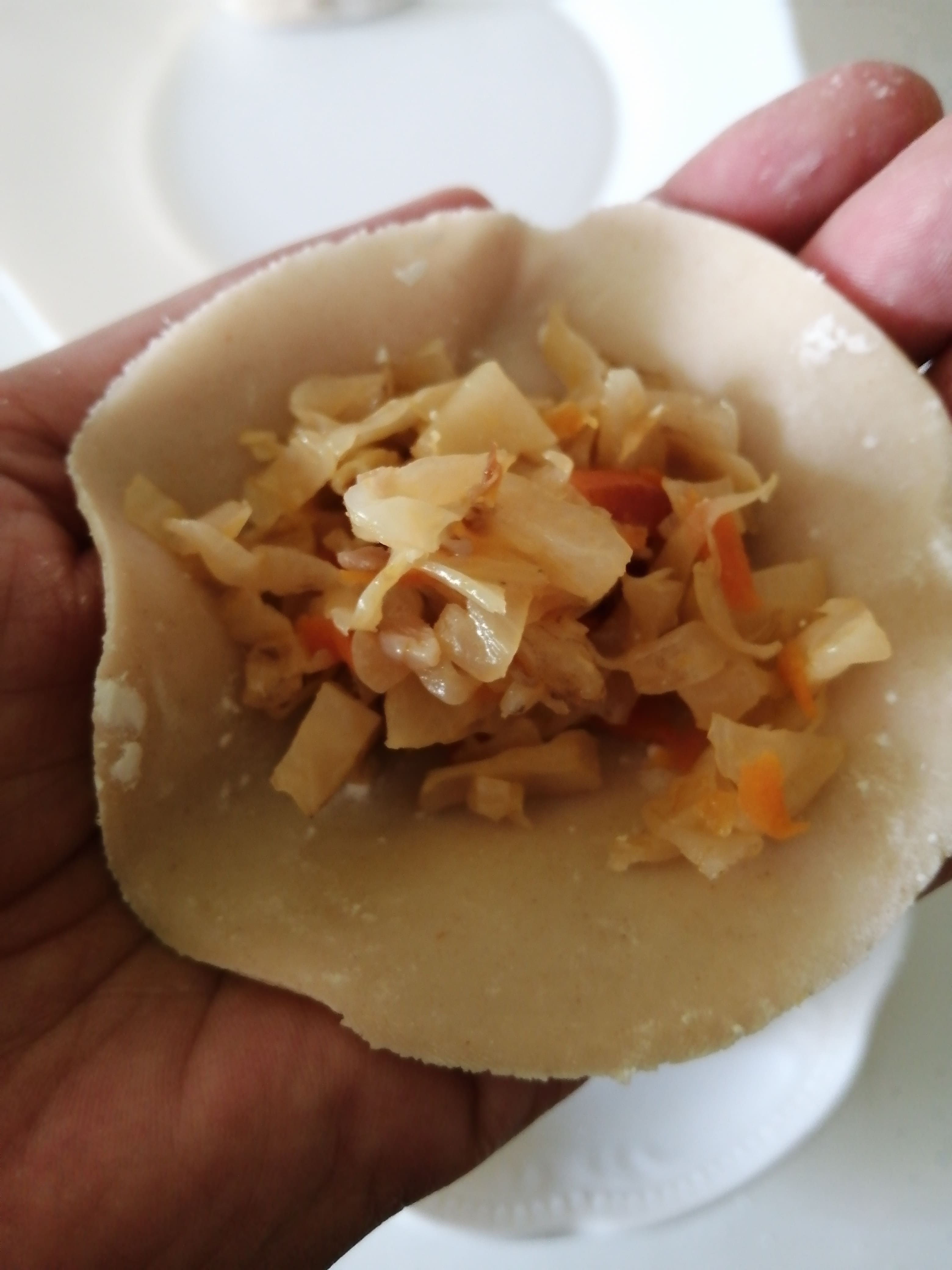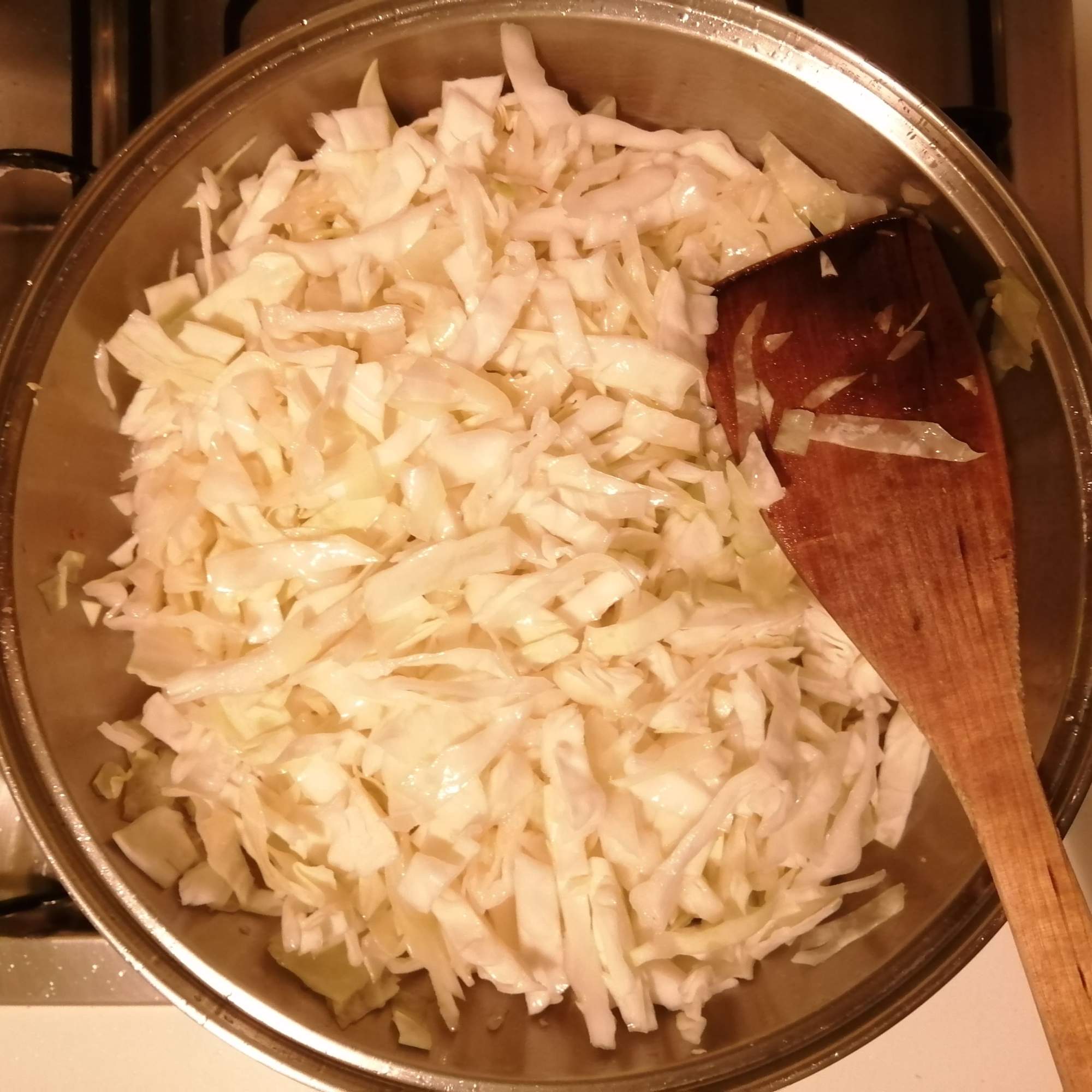 En una sartén vierte un poco de aceite y cocina a fuego lento. Añade la zanahoria cuando el repollo comience a estar transparente y, después, los champiñones (en cocina asiática las verduras se suelen cocinar al dente, yo prefiero cocinarlas un poco más). Por último, pica finamente el ajo y el jengibre y añade a lo anterior. Cocina unos minutos más, apaga el fuego y deja enfriar.