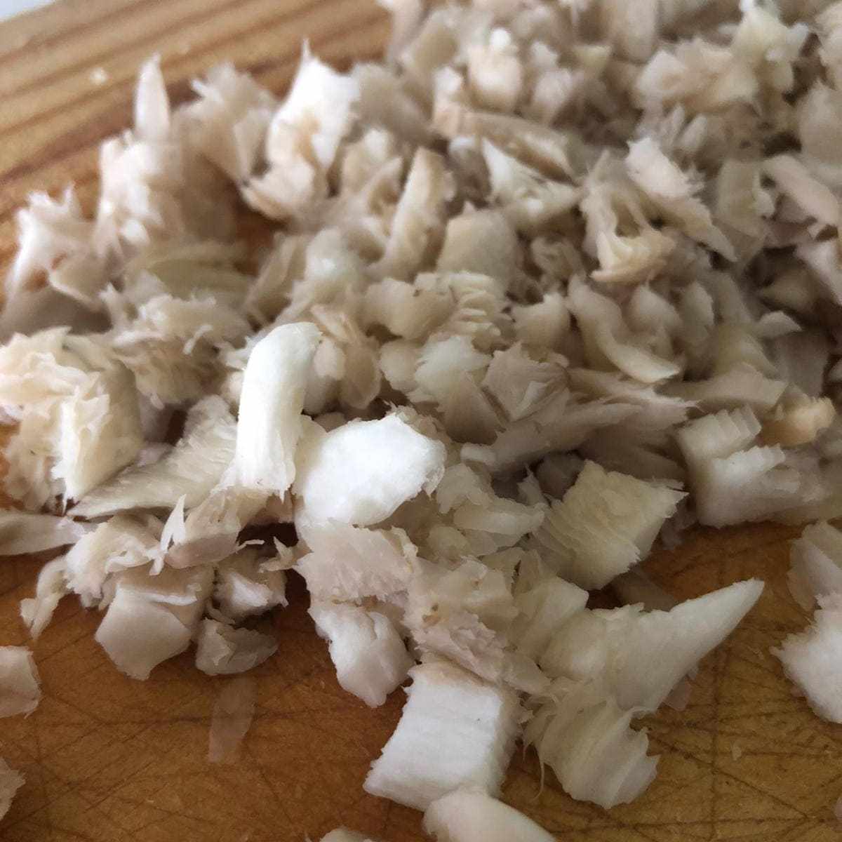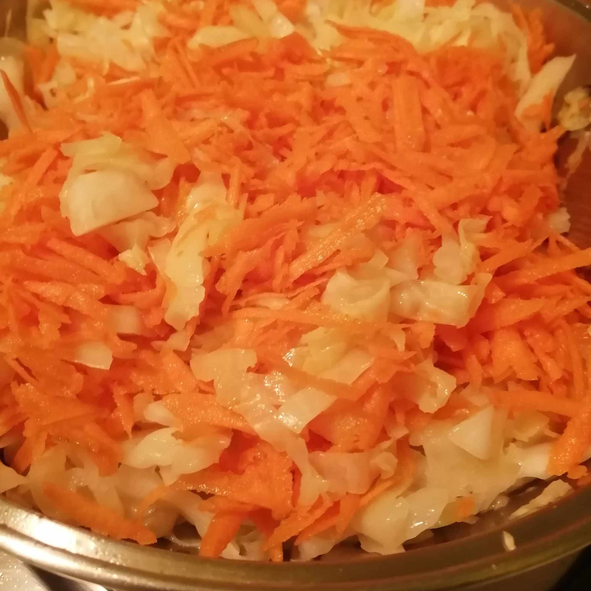 Mientras tanto prepara el relleno (te llevará unos 40 minutos). Lava y pica el repollo en láminas. Ralla la zanahoria y corta los champiñones en brunoise.
