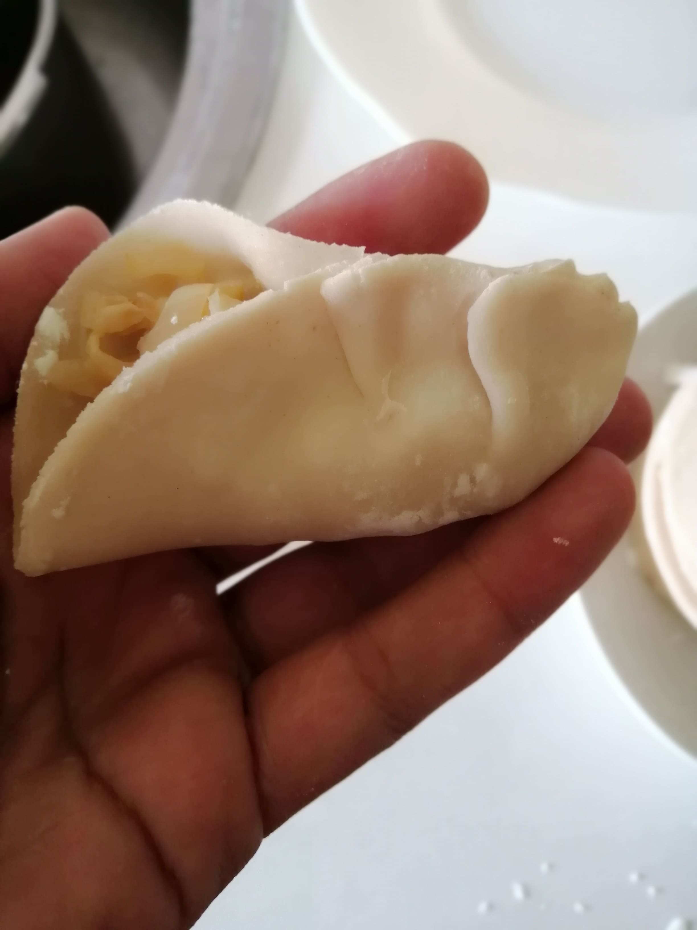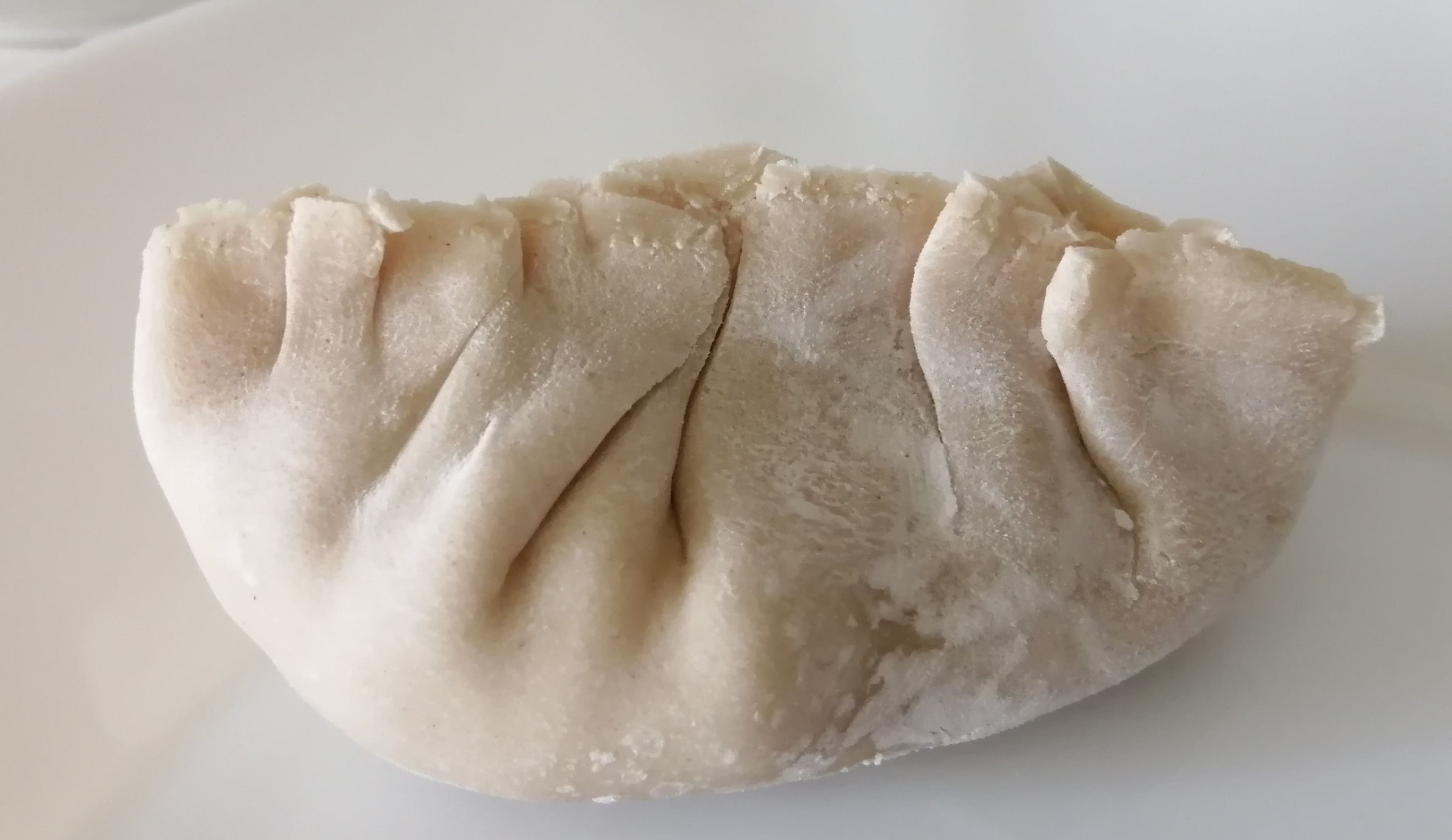 Toma una empanadilla, pon un poco del relleno en el centro con ayuda de una cucharita. Aprieta con los dedos el borde superior. Después repliega la masa de la parte derecha sobre sí misma y haz lo mismo con la otra parte. Puedes utilizar un poco de agua para pegar la masa (aunque yo no utilizo nada y queda perfectamente cerrada). Espolvorea harina sobre una bandeja y ve colocando los dumplings, dejando un espacio entre ellos.