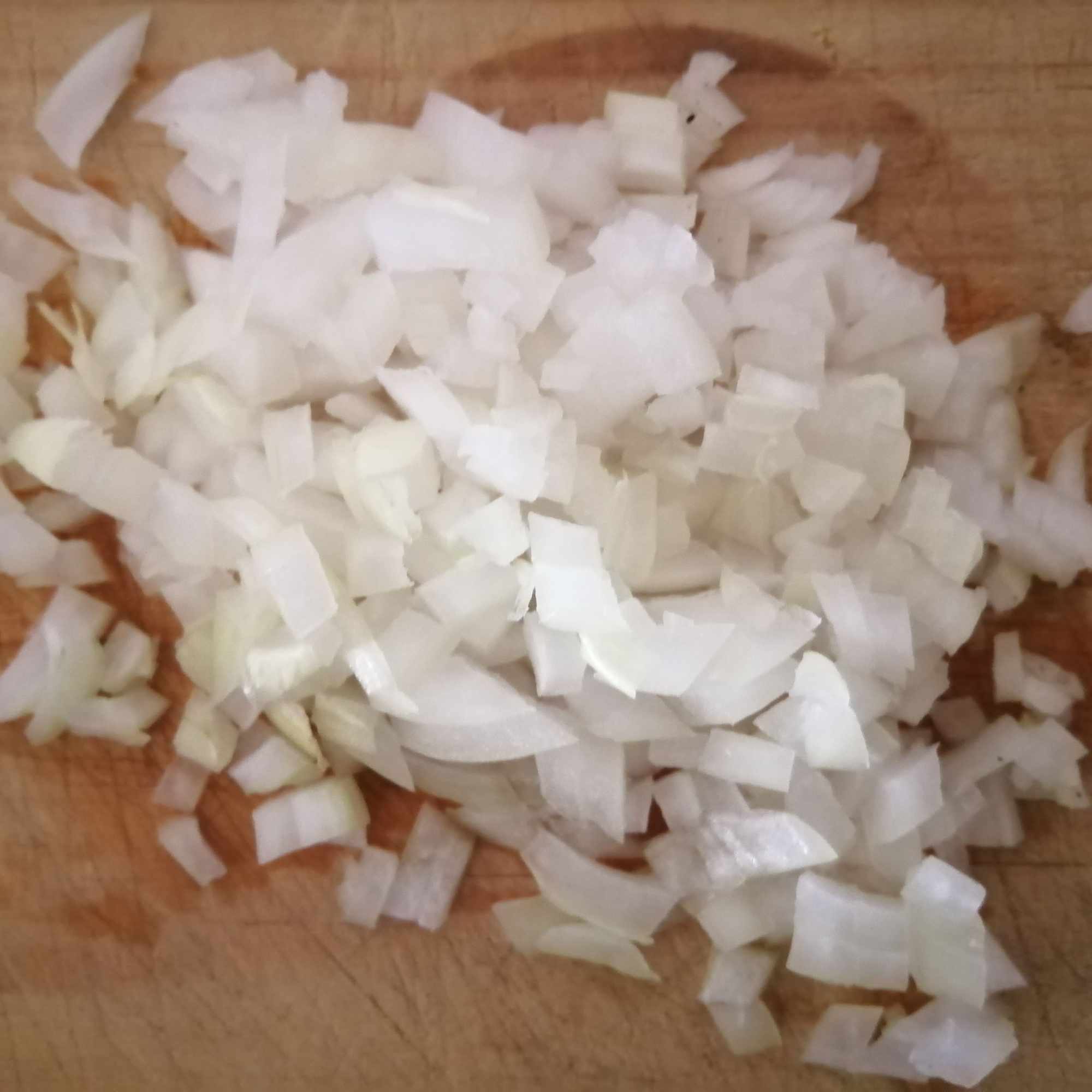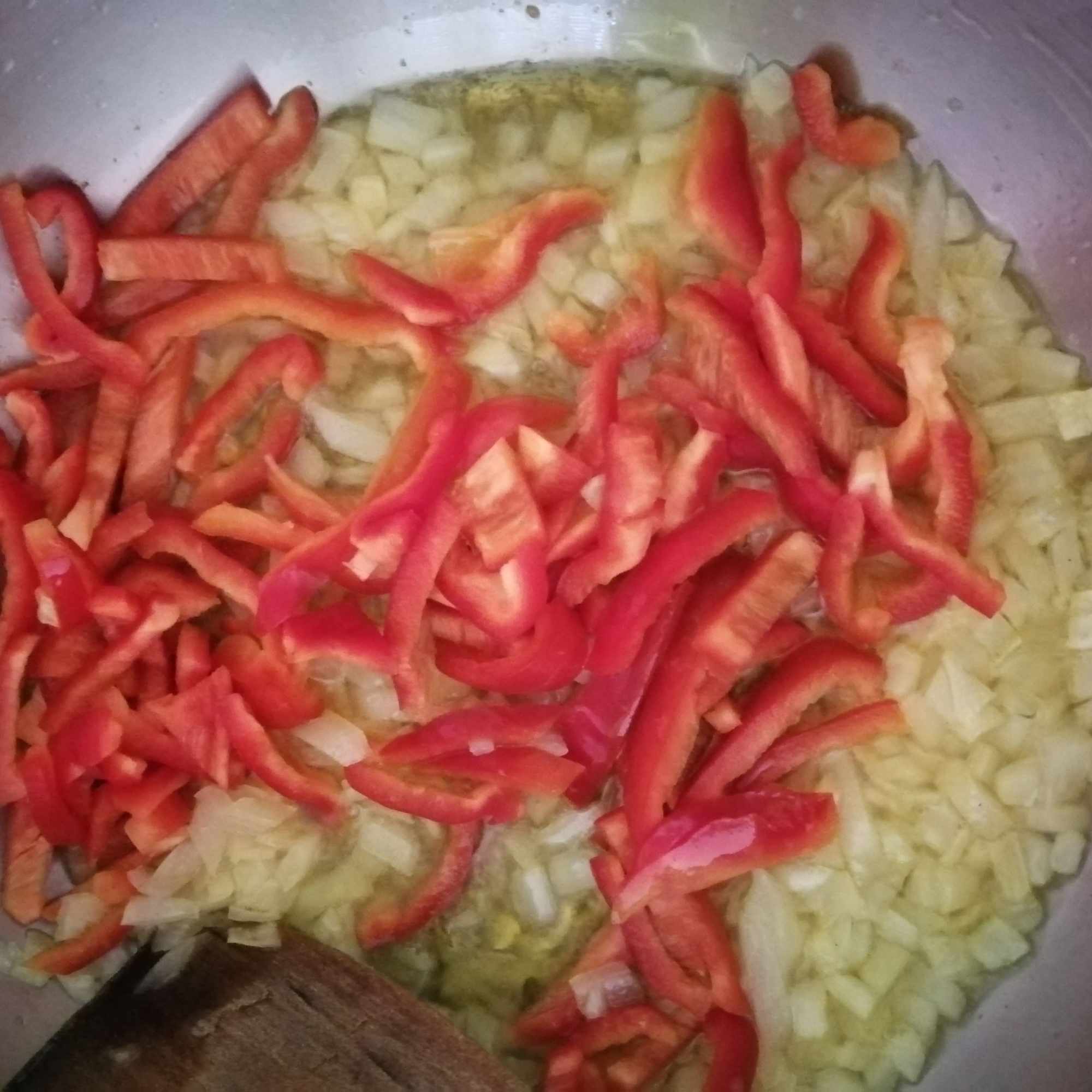 En una cazuela pequeña o una sartén honda calienta un poco de aceite de oliva. Lava bien las hortalizas. Corta la cebolla en juliana y pocha a fuego suave. Corta el pimiento en tiras finas y añade cuando la cebolla comience a estar transparente.