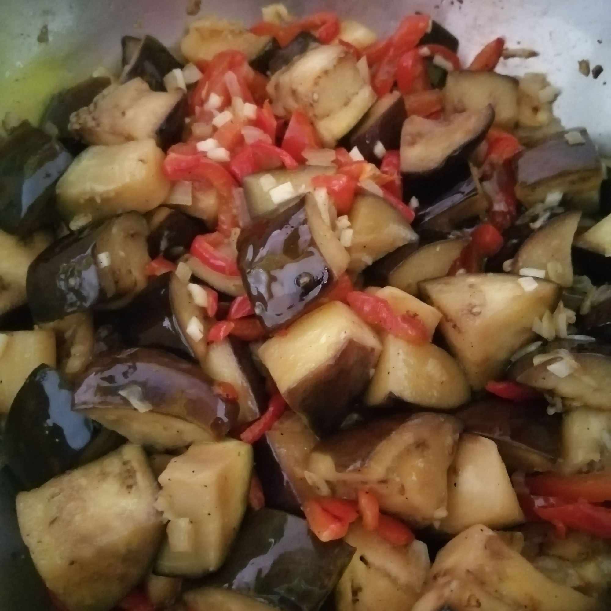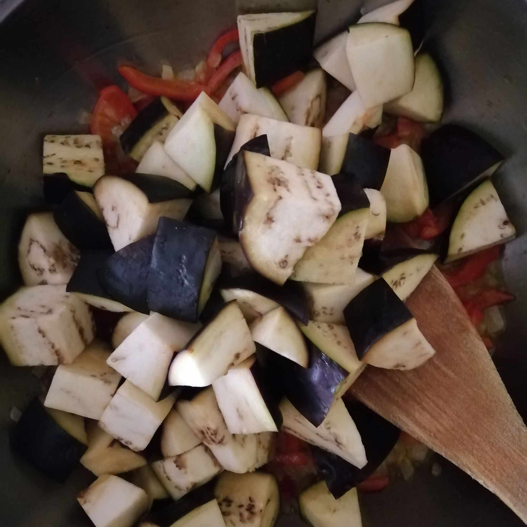 Corta la berenjena en dados medianos y añade al resto de verduras. Pica el ajo finalmente y agrega también. Mezcla bien, evitando que el ajo se queme. Ralla el tomate y agrega a la sartén. Salpimenta, añade la pimienta cayena y el medio vaso de vino y cubre la sartén con una tapadera.