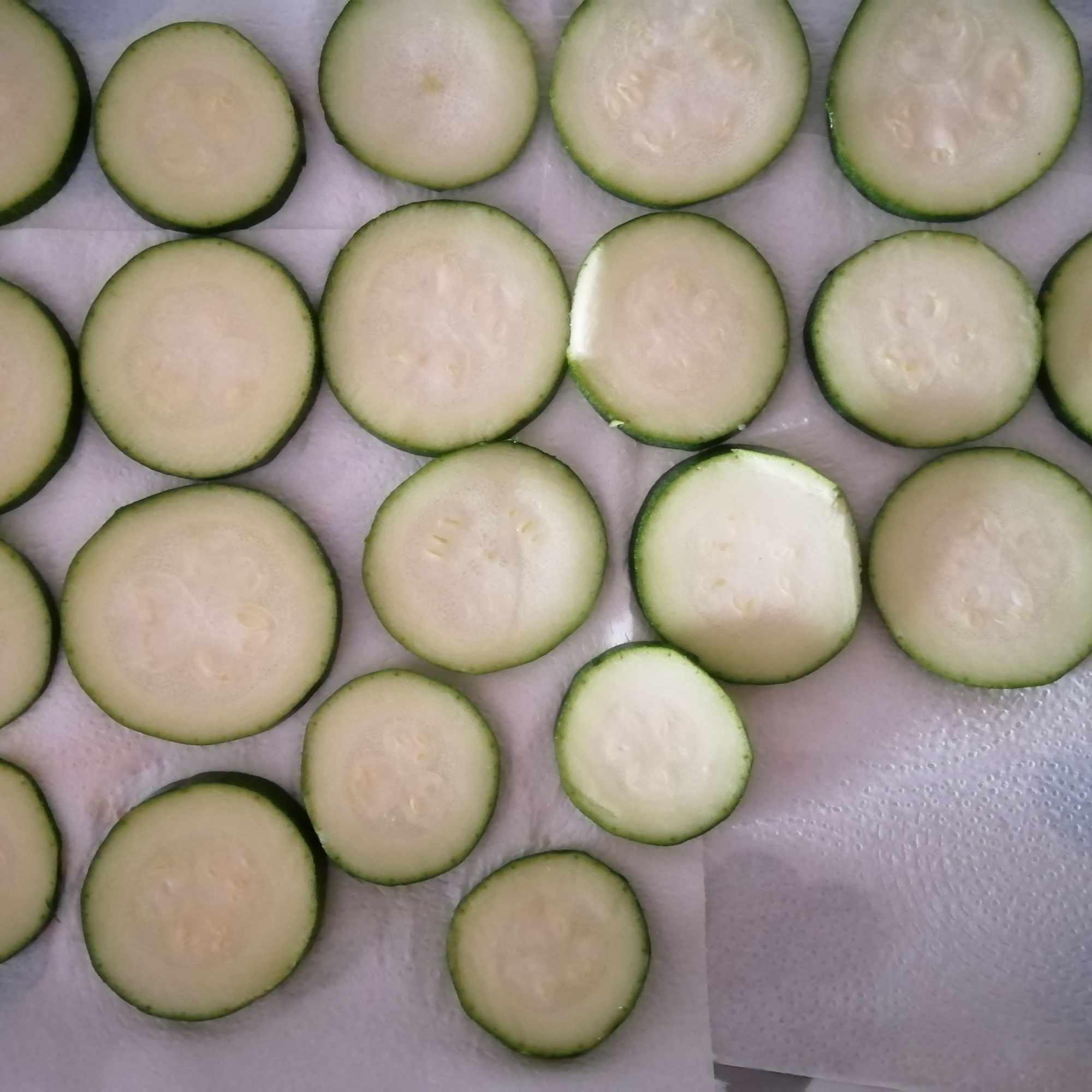 Corta los calabacines. En una superficie grande coloca papel absorbente y pon encima el calabacín. Cubre de nuevo con papel absorbente para eliminar el exceso de agua.
