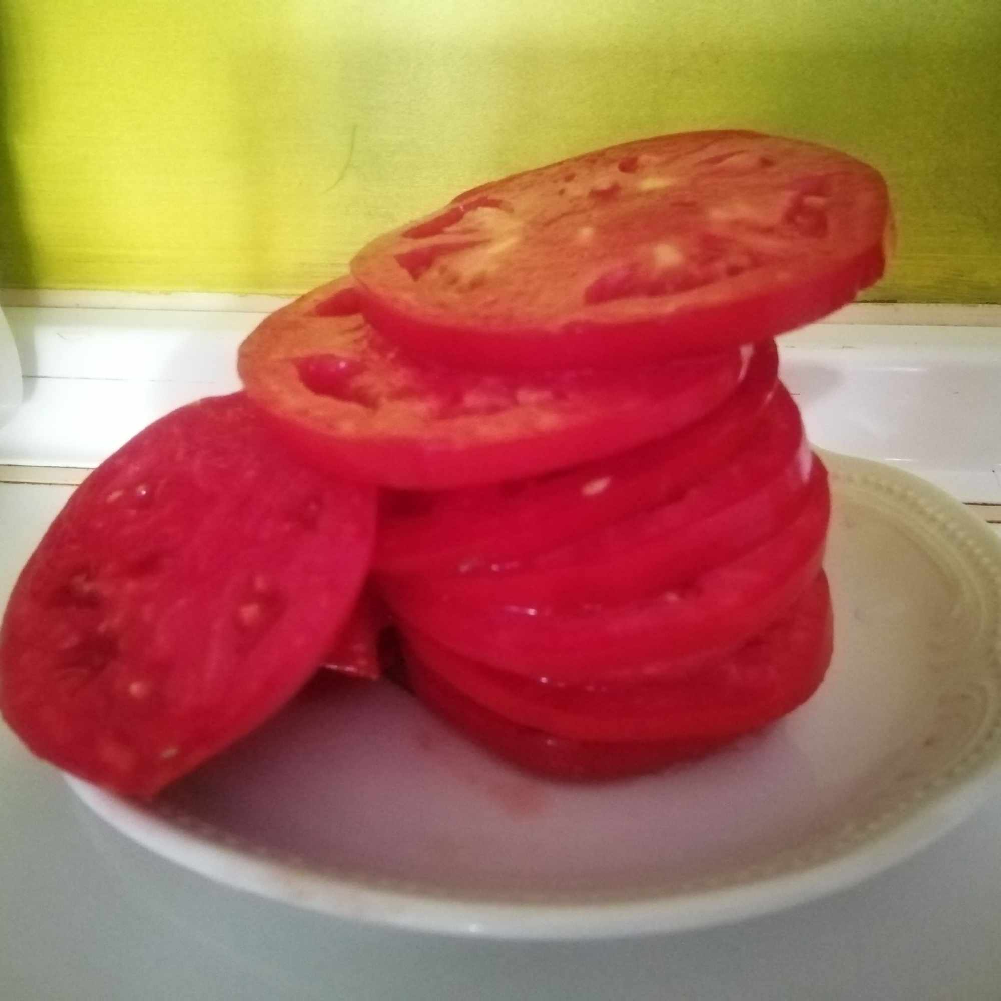 Corta los 3 tomates en rodajas, del mismo grosor que la berenjena y el calabacín y reserva.