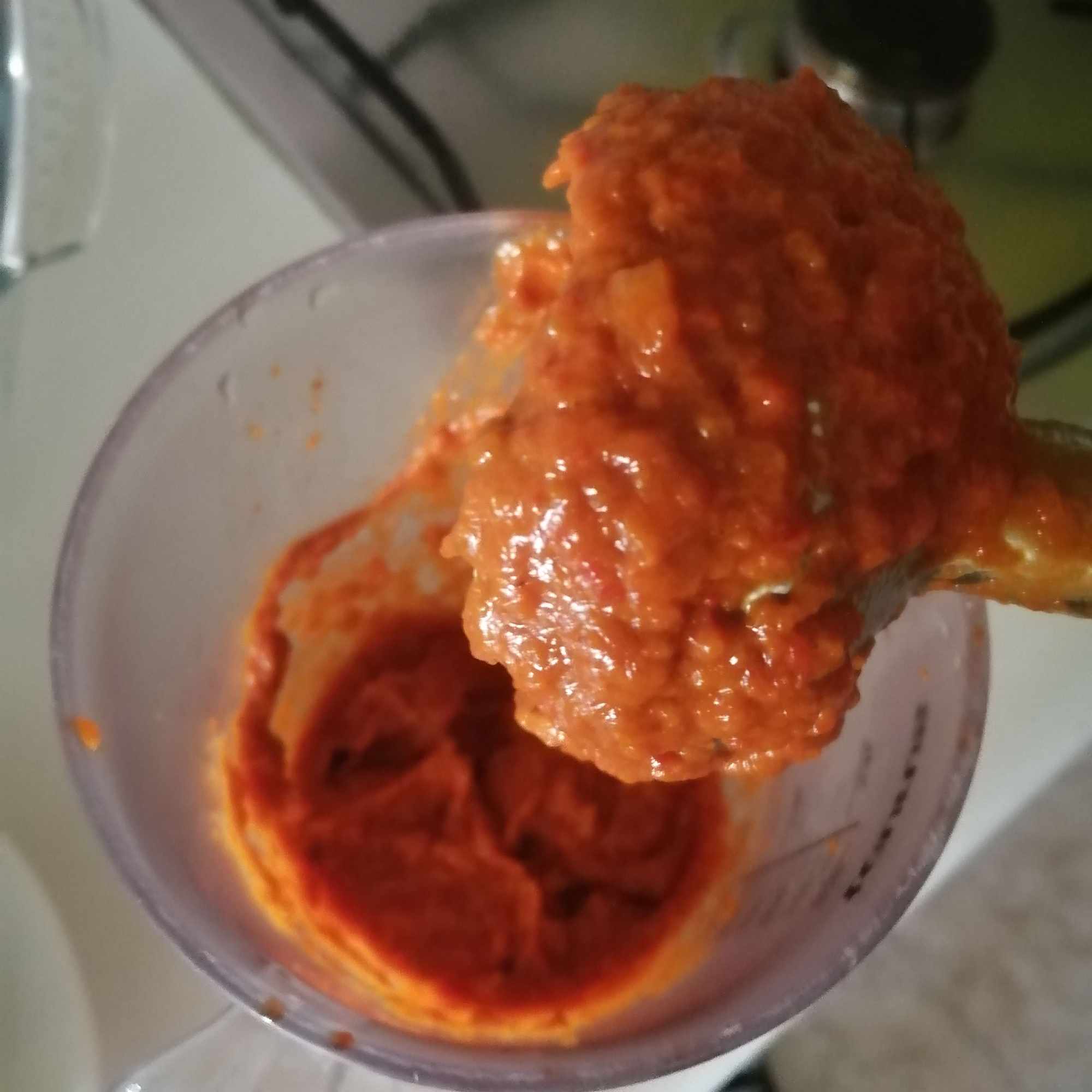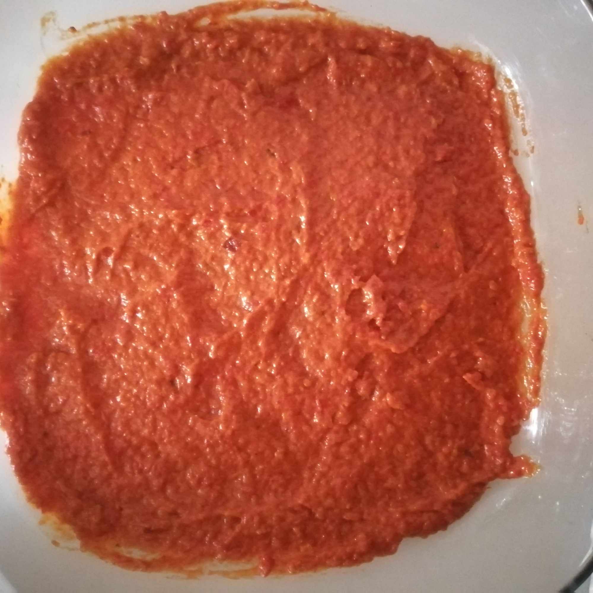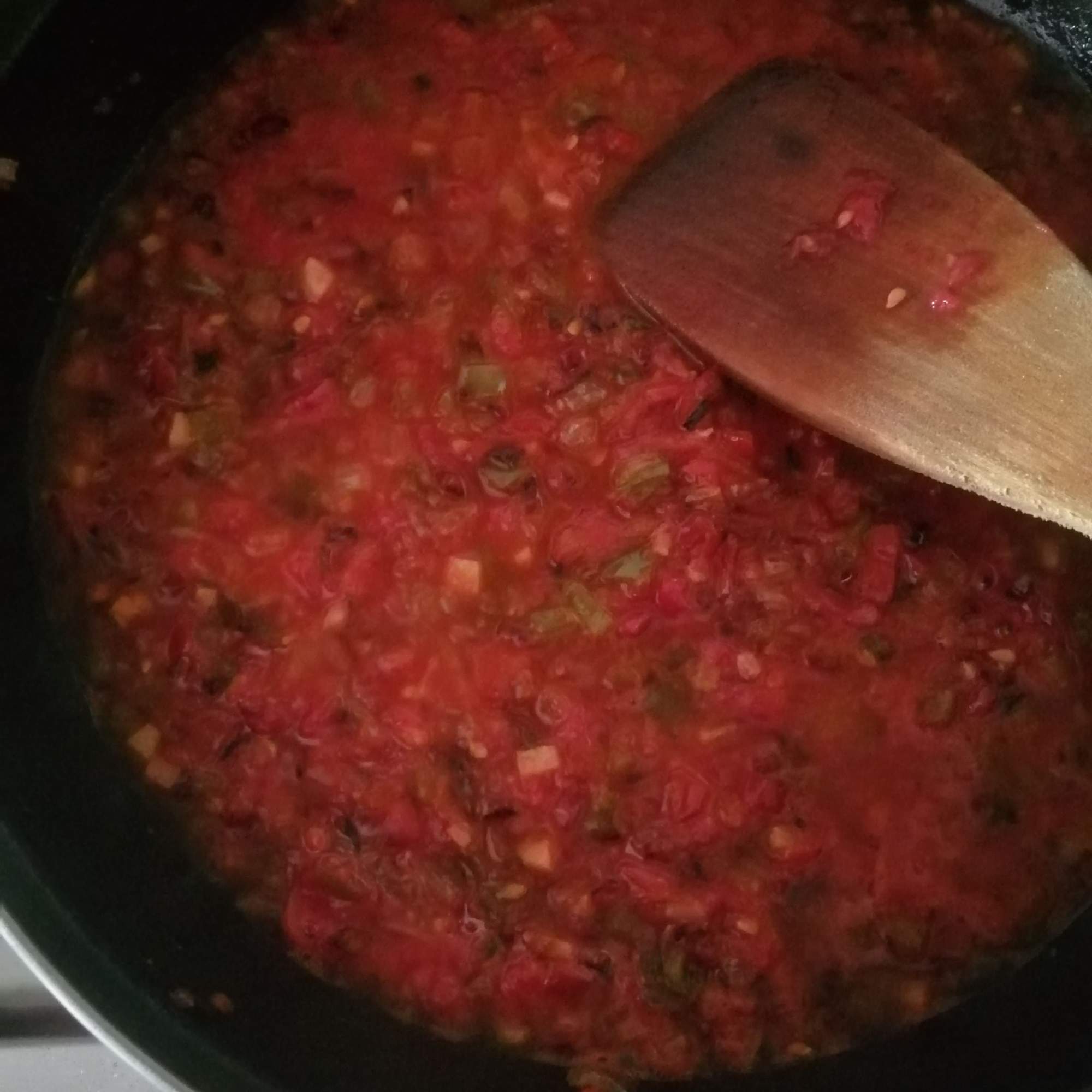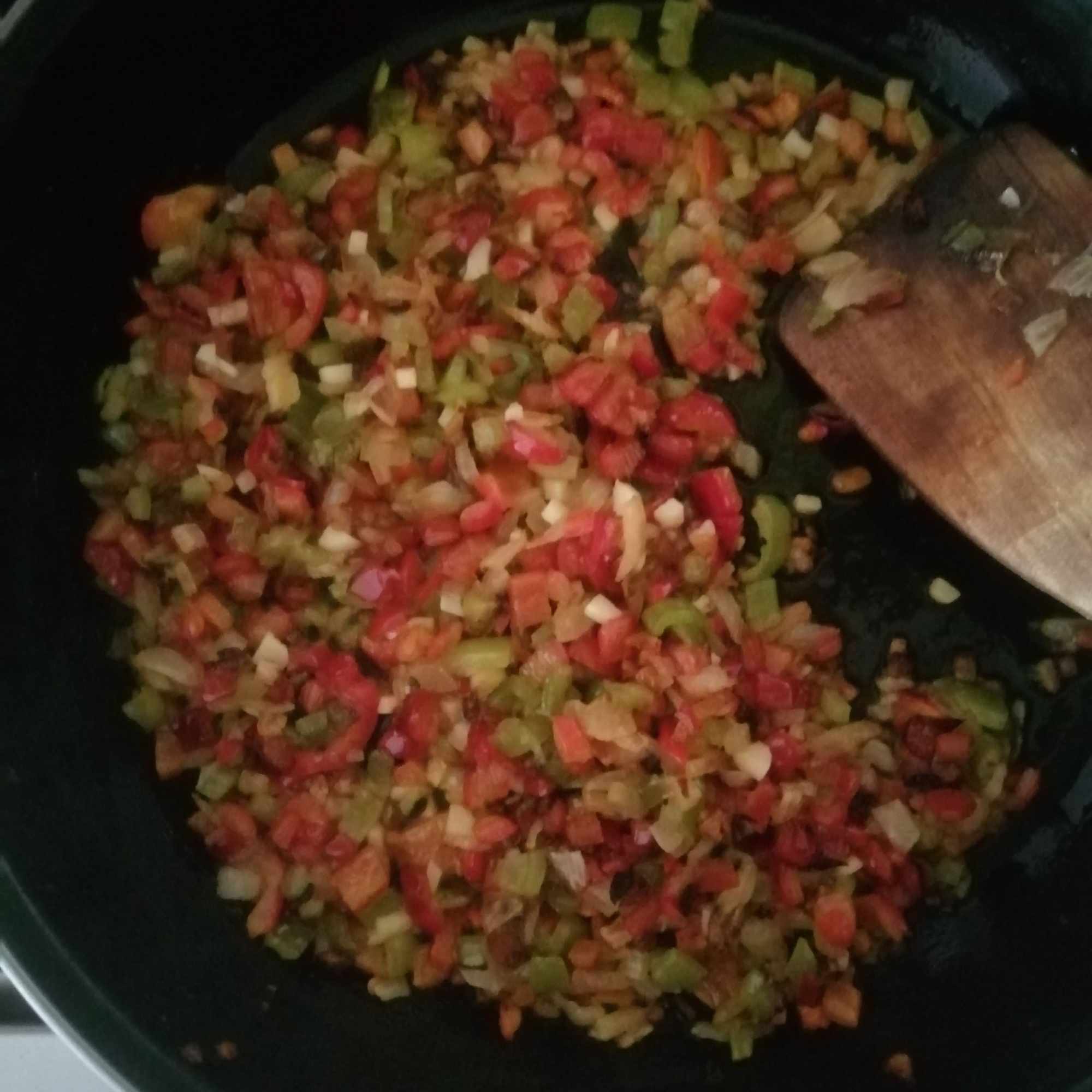 Pocha la cebolla a fuego suave y, cuando empiece a transparentar, añade el pimiento rojo y verde. Cocina hasta que estén tiernos, agrega el ajo y antes de que se dore, añade el tomate. Agrega una cucharada de azúcar para reducir la acidez del tomate y cocina unos minutos. Puedes dejar la salsa tal cual o pasarla por la batidora.