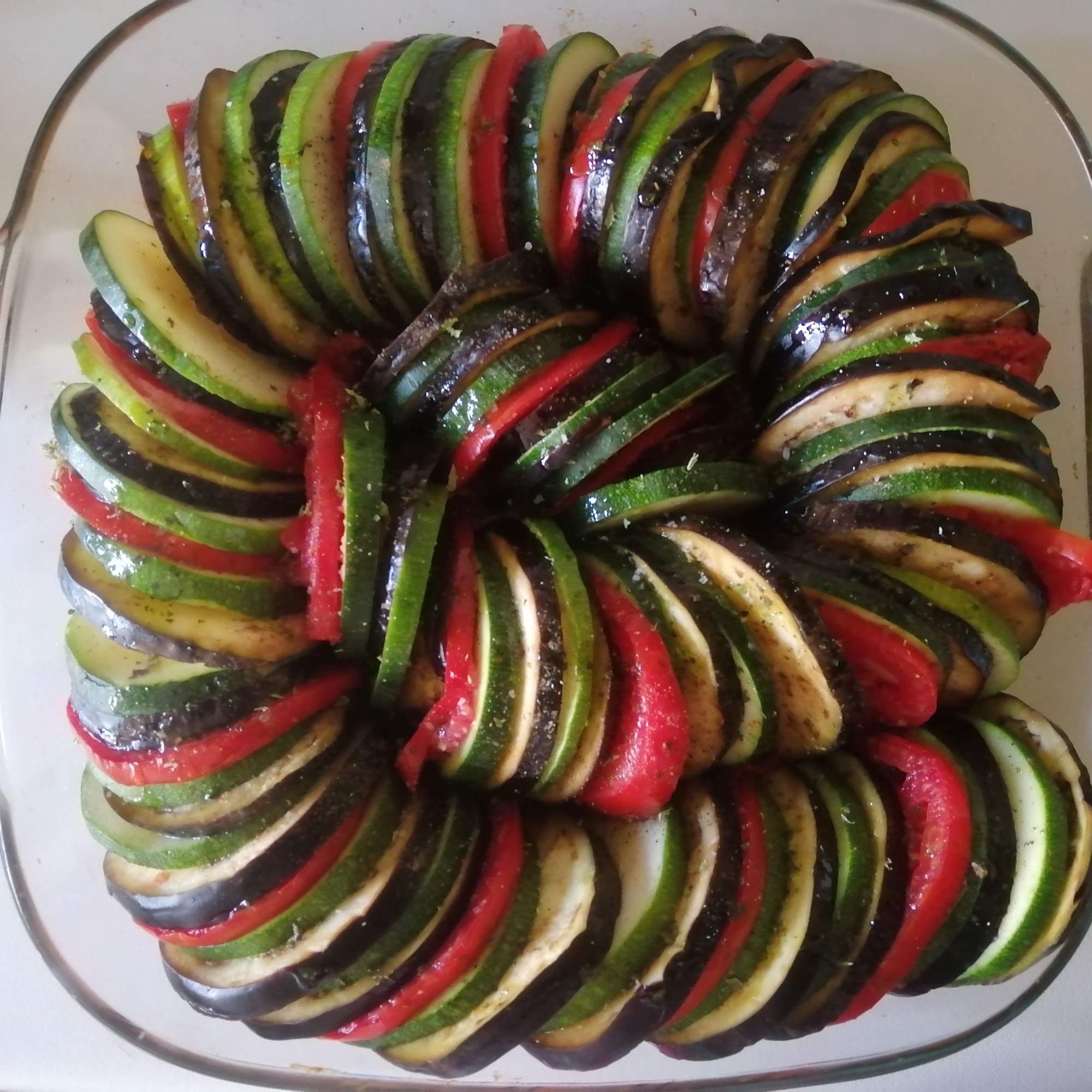 Precalienta el horno a 180 ºC. Cubre una fuente de horno con la salsa de tomate. Alterna capas de berenjena, calabacín y tomate y colócalas con cuidado sobre la salsa hasta cubrir toda la fuente (si es redonda será mucho más fácil). Por último, mezcla el aceite y las hierbas aromáticas y rocía las verduras, salmpenta y hornea durante 1 hora (te recomiendo estar pendiente para que no se dore demasiado). Al cabo de este tiempo, cubre la fuente con papel albal y termina de cocinar durante 30 minutos más.