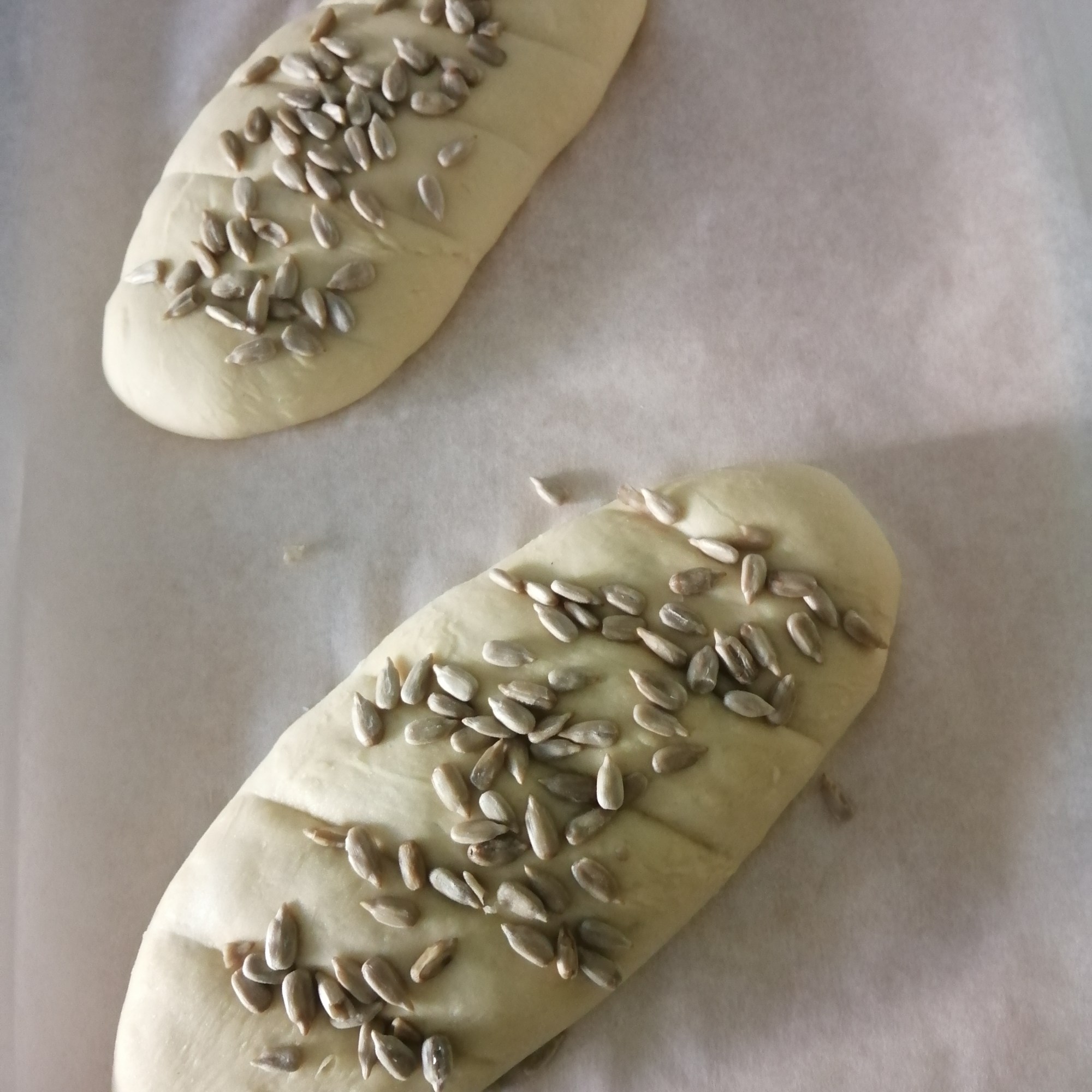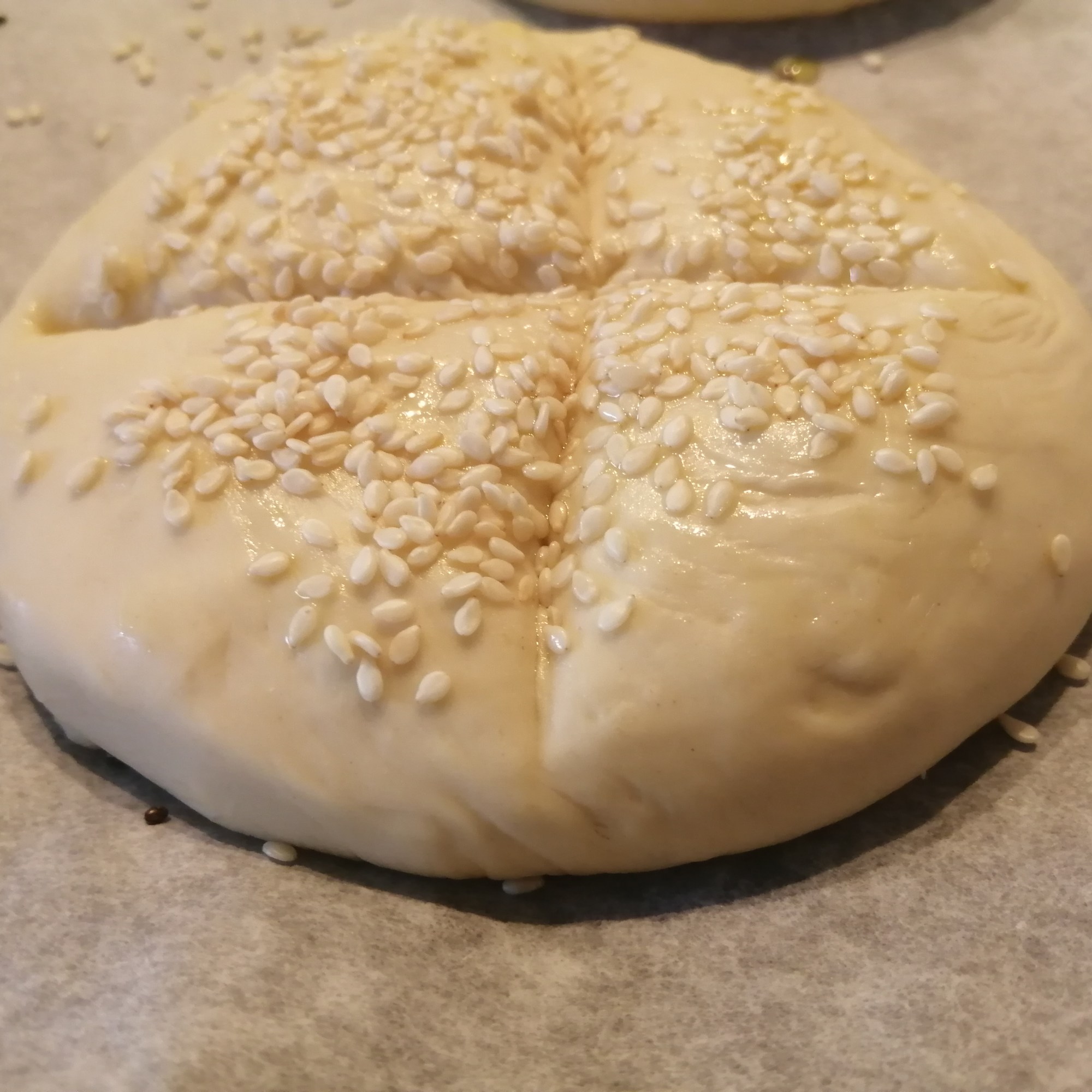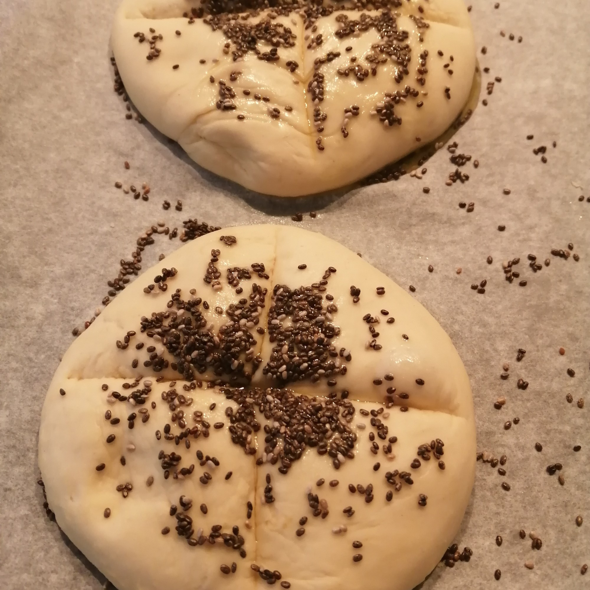 Corta la masa en porciones iguales. Espolvorea la mesa con harina y haz pequeñas bolitas. Pinta la superficie con un poco de aceite, con ayuda de un pincel de cocina, y espolvorea las semillas. Coloca sobre una bandeja y deja reposar otra media hora, cubiertas con un paño limpio.