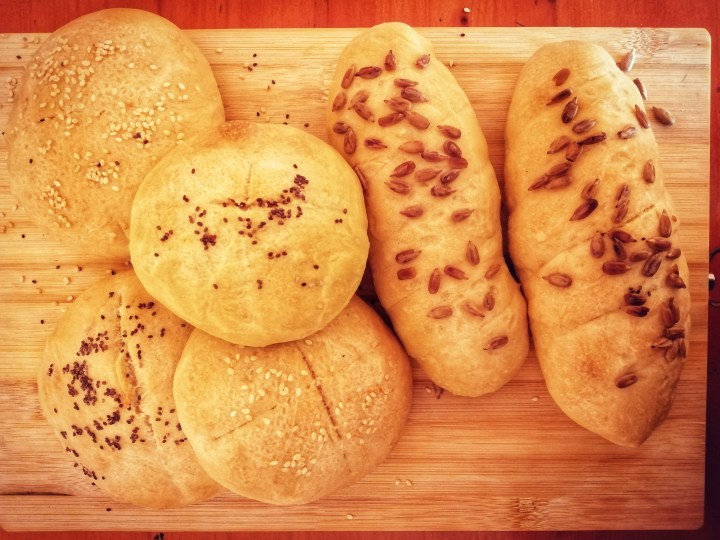 Precalienta el horno a 200º arriba y abajo. Hornea los panes durante unos 15-20 minutos o hasta que estén un poco dorados en la superficie. Deja enfriar sobre una rejilla (yo, como no tengo, utilizo una tostadora de esas planas).