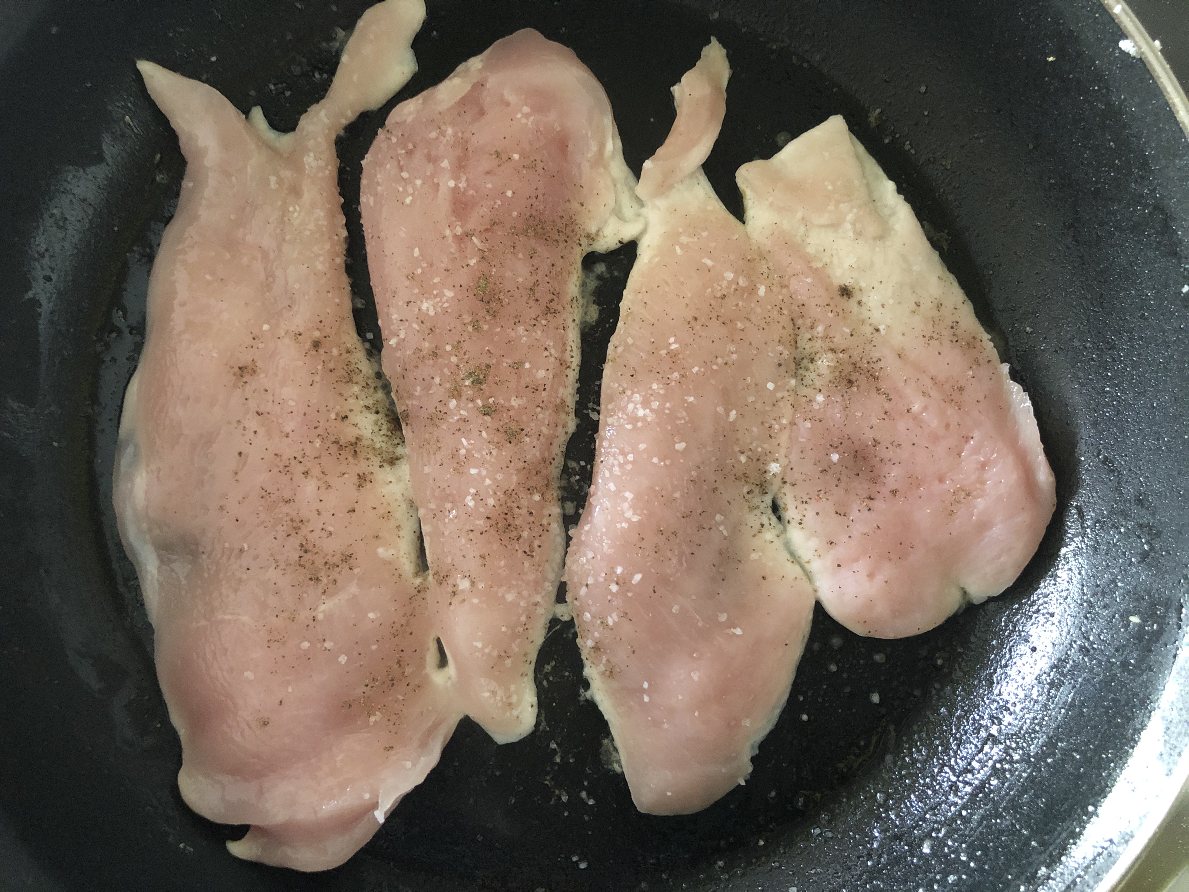 Para empezar, salpimentaremos las pechugas de pollo. Después, pon un poco de aceite en una sartén y cocina las pechugas (vuelta y vuelta). Retira a un plato con papel absorbente para eliminar el exceso de aceite y reserva.