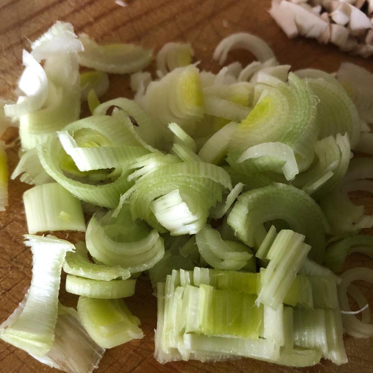 Mientras se cuece la avena preparamos el sofrito. Pica todas las verduras en brunoise: cebolla, puerro, champiñones y setas.
