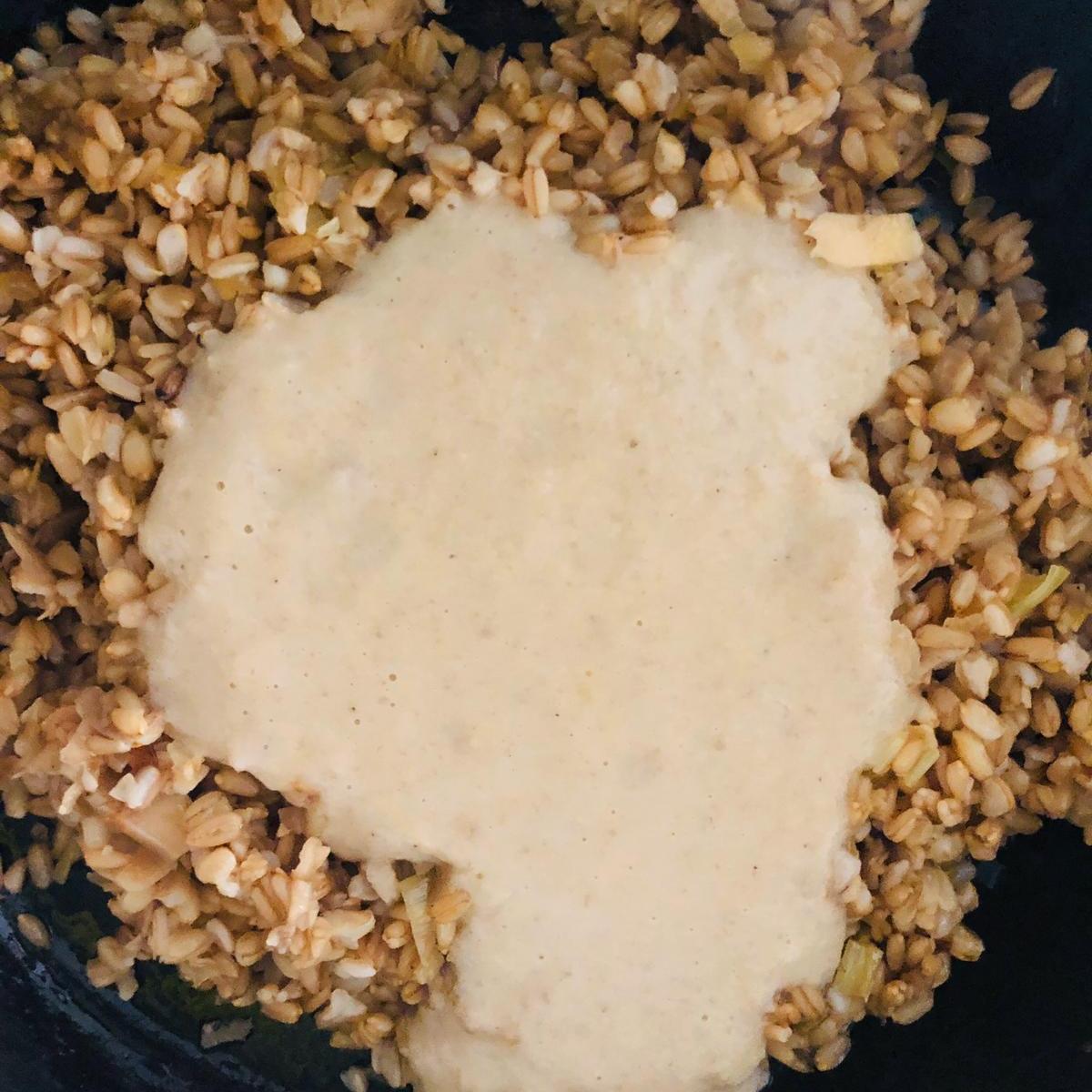 Divide el sofrito en dos partes. Pon una de ellas en el vaso de la batidora junto con la leche y tritura bien. La otra mitad la vamos a mezclar con la avena, a fuego medio, durante un par de minutos. Agrega la crema de champiñones y cocina durante 5 minutos más. A mí me gusta reducir la salsa hasta que quede una textura cremosa. Si te gusta más líquida, añade más leche.