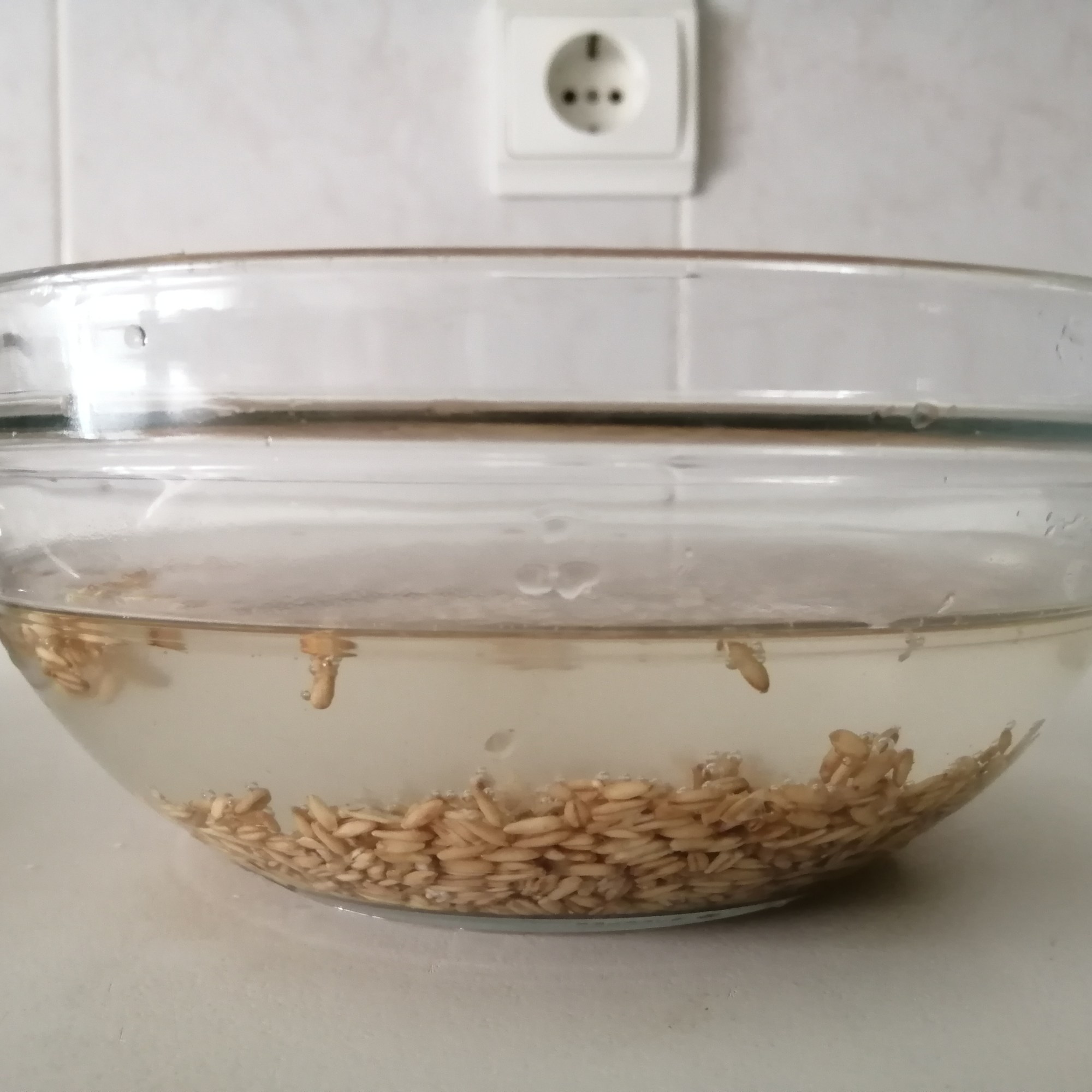 Previamente debemos poner la avena en remojo. Para ello, la noche anterior, la lavamos muy bien y la dejamos en un recipiente con abundante agua. Al día siguiente, retiramos el agua y aclaramos bien.