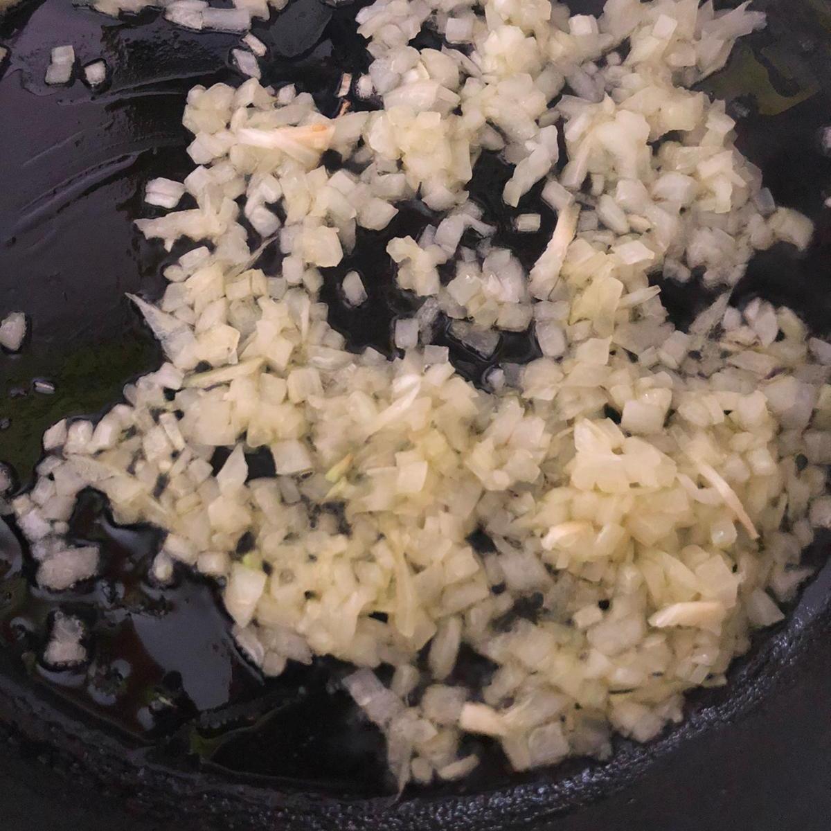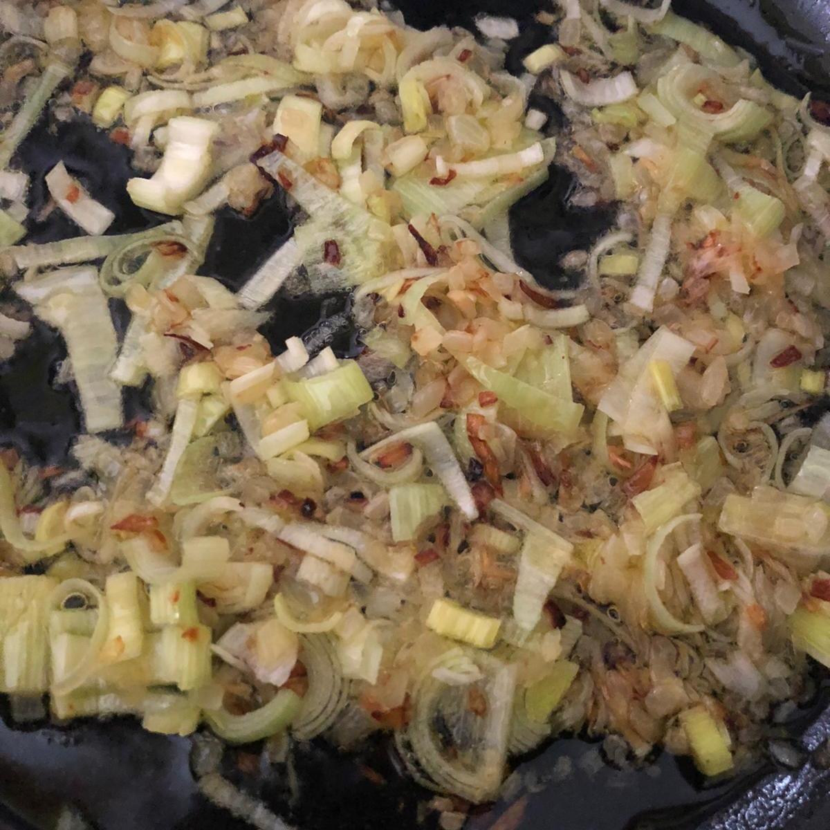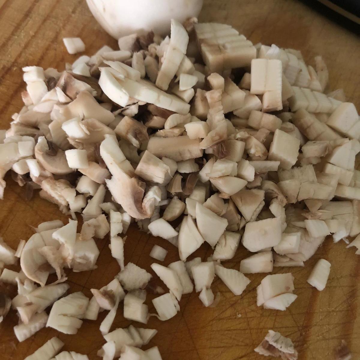 Pon un poco de aceite en una sartén honda y pocha la cebolla. Cuando empiece a estar transparente, agrega el puerro. Haz lo mismo con los champiñones y las setas. Salpimenta al gusto. Una vez listo el sofrito, retira del fuego y deja enfriar un poco.