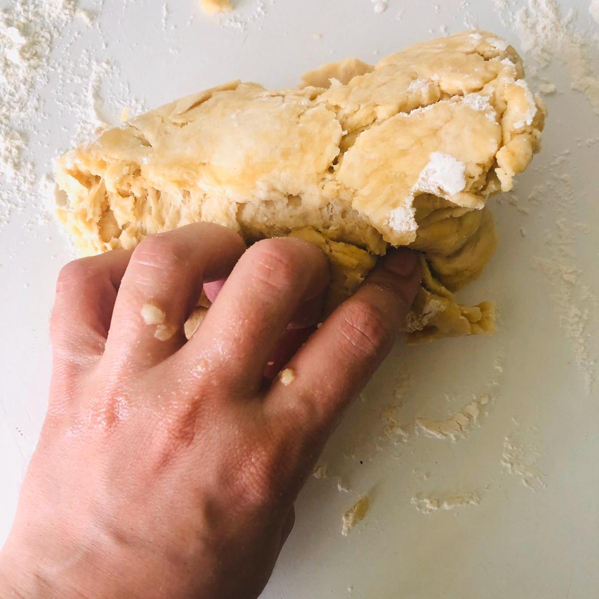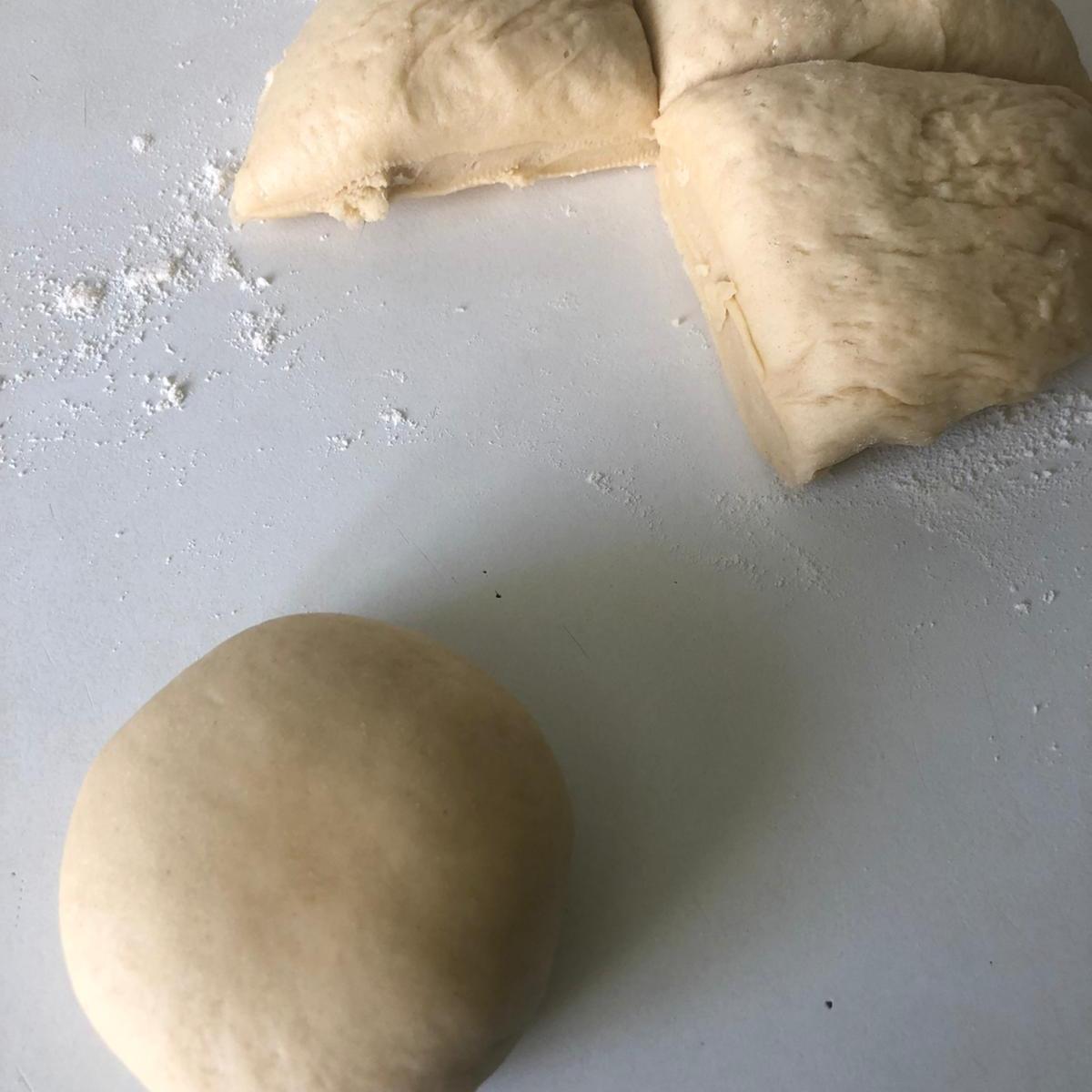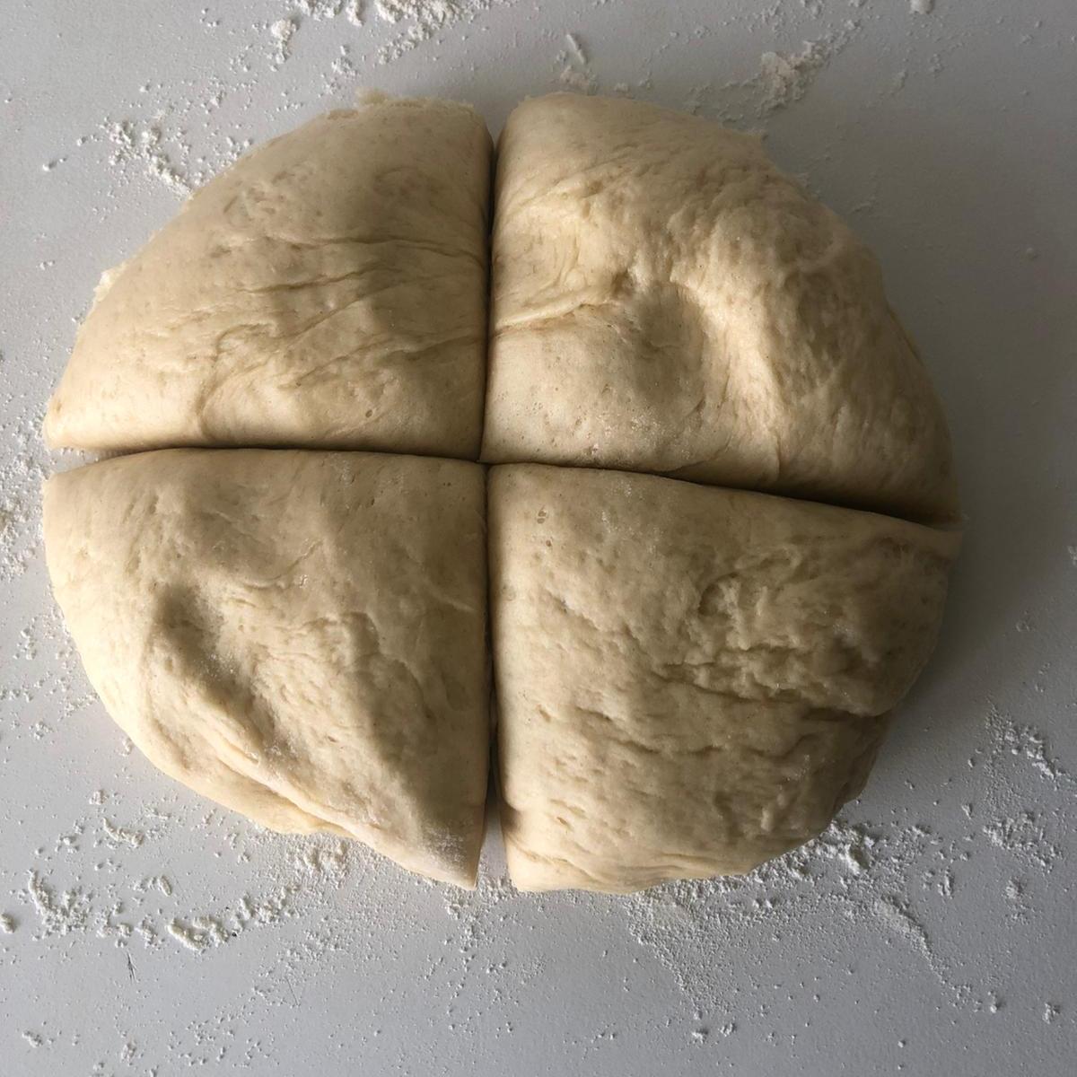 Espolvorea un poco de harina sobre la superficie de trabajo y vuelca la masa. Divide en porciones.