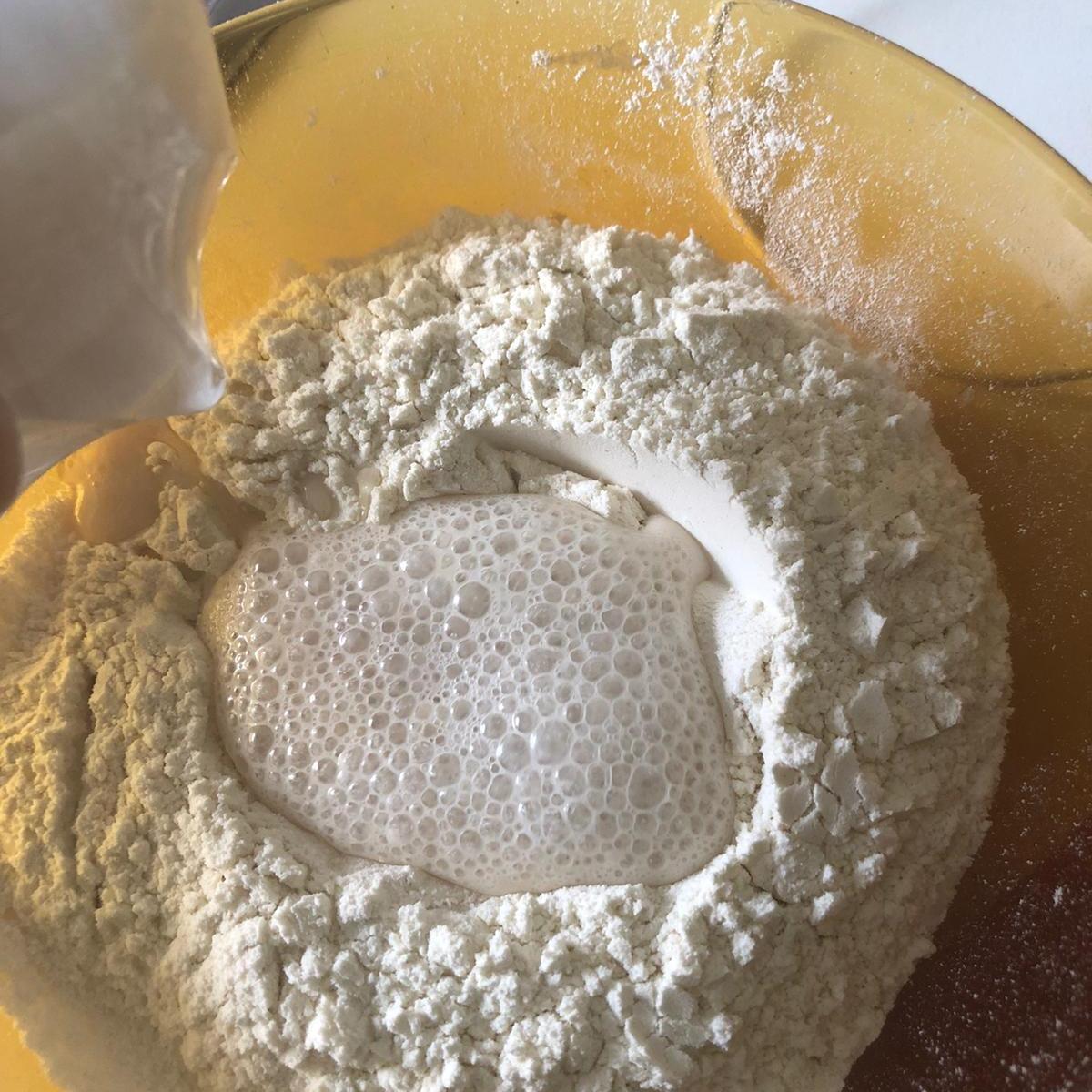 Tamiza la harina en un recipiente grande y haz un agujero en el centro. Añade la sal por los bordes y vierte la leche en el centro. Mezcla con una cuchara hasta que adquiera una textura similar a la de la foto.