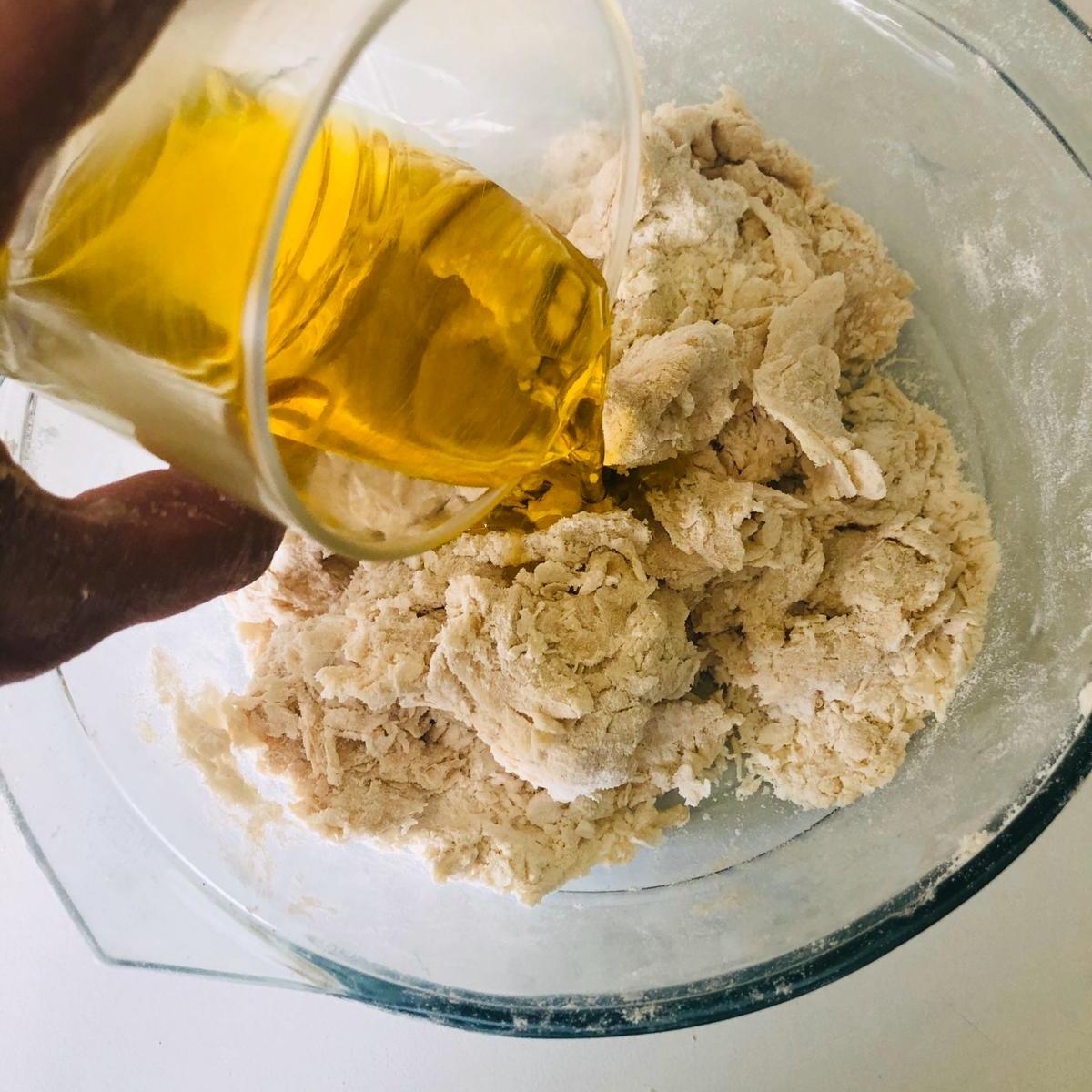Agrega el aceite y mezcla todo bien. Cuando no puedas más, espolvorea con harina la superficie de trabajo y amasa durante unos 5-10 minutos, hasta obtener una masa suave y elástica.