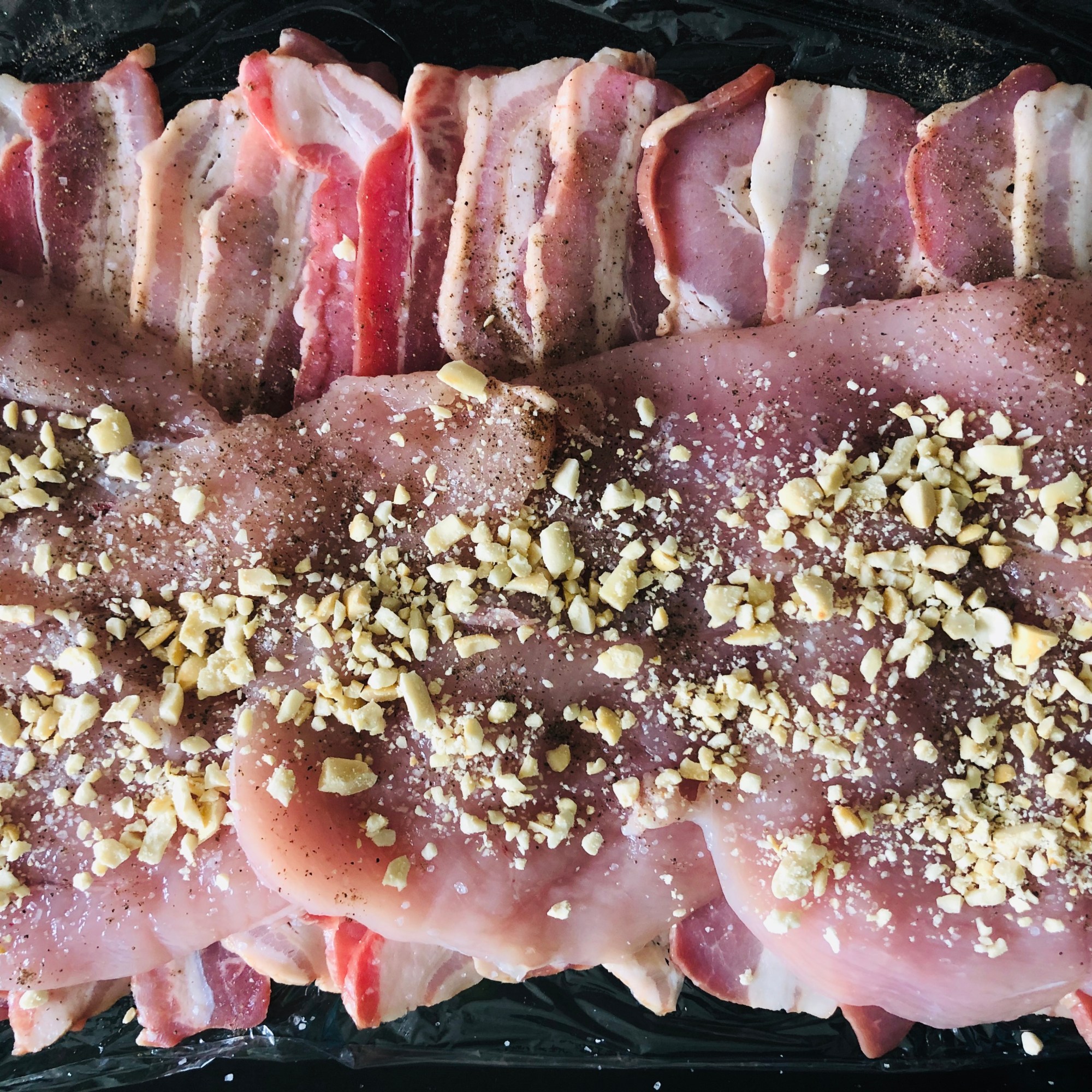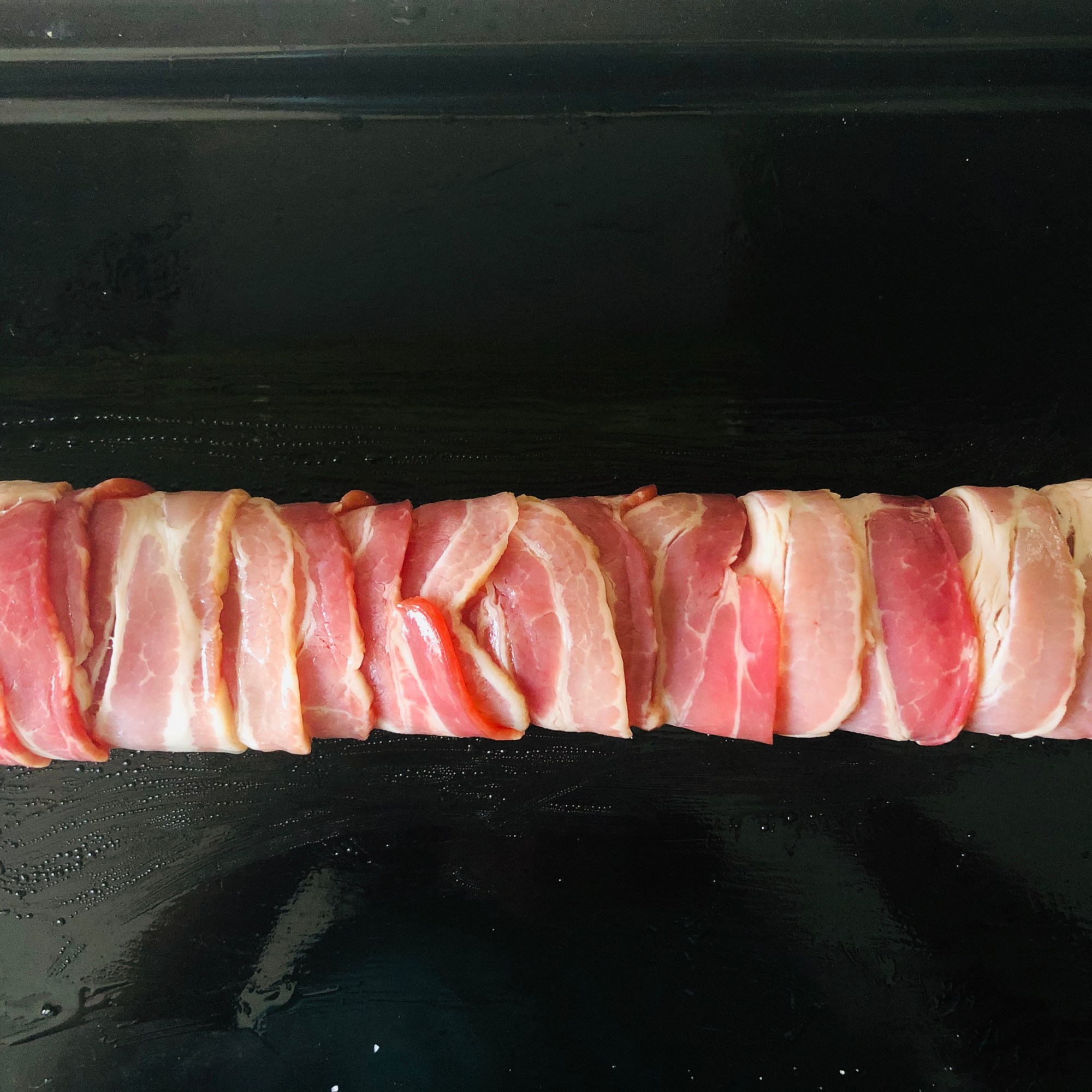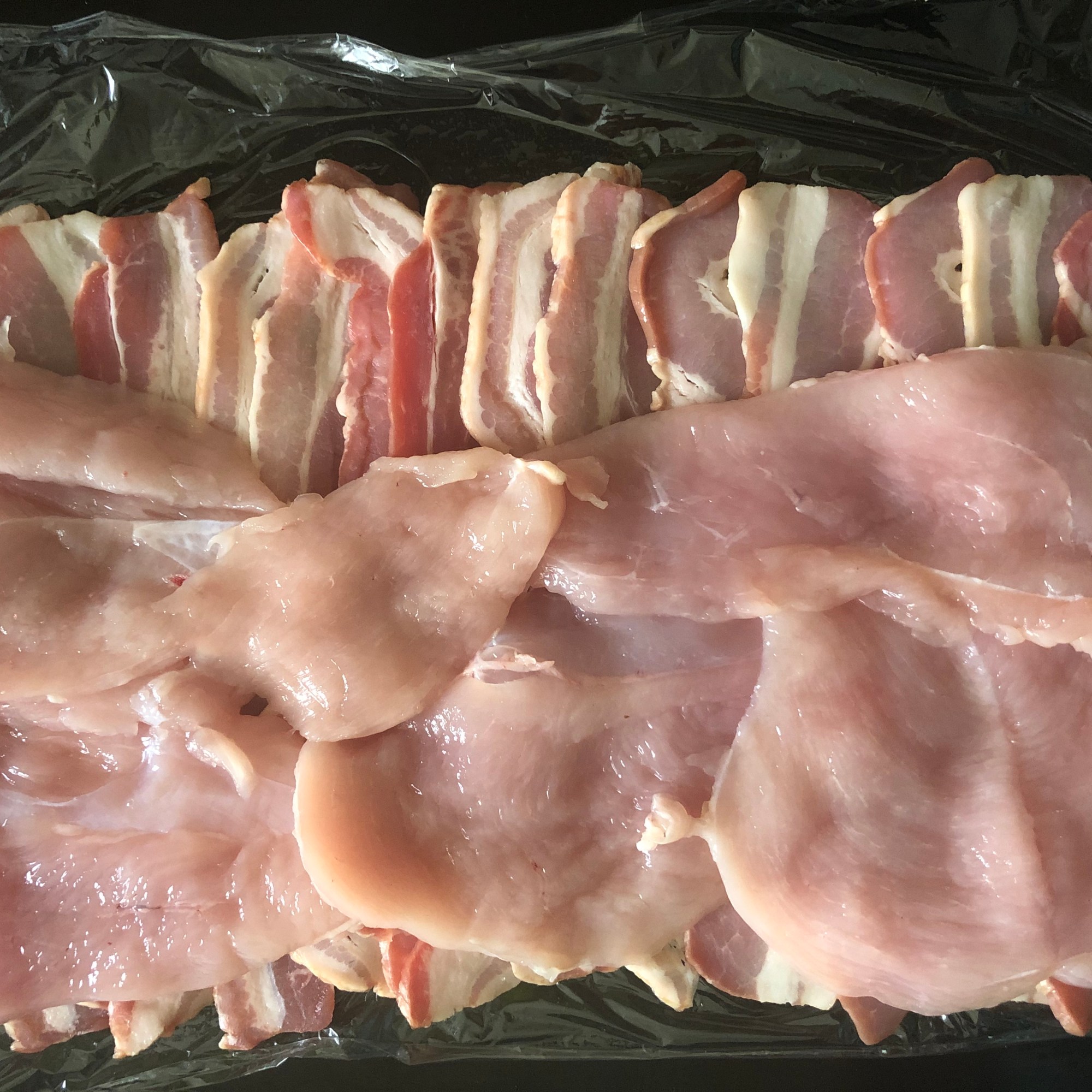 Coloca un papel film sobre la placa de horno. Coloca las tiras de bacon en vertical, de manera que queden un poco montadas unas sobre otras. Salpimenta las pechugas de pollo y colócalas sobre el bacon en horizontal, más o menos hasta la mitad (para poder cerrarlo después).