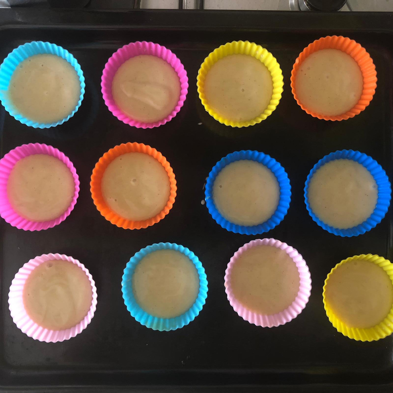 Vierte la mezcla en los moldes, hasta 2/3 de su capacidad y mete al horno. Baja la temperatura a 160ºC y cocina durante 30 minutos o hasta que tus magdalenas estén bien doraditas por arriba.