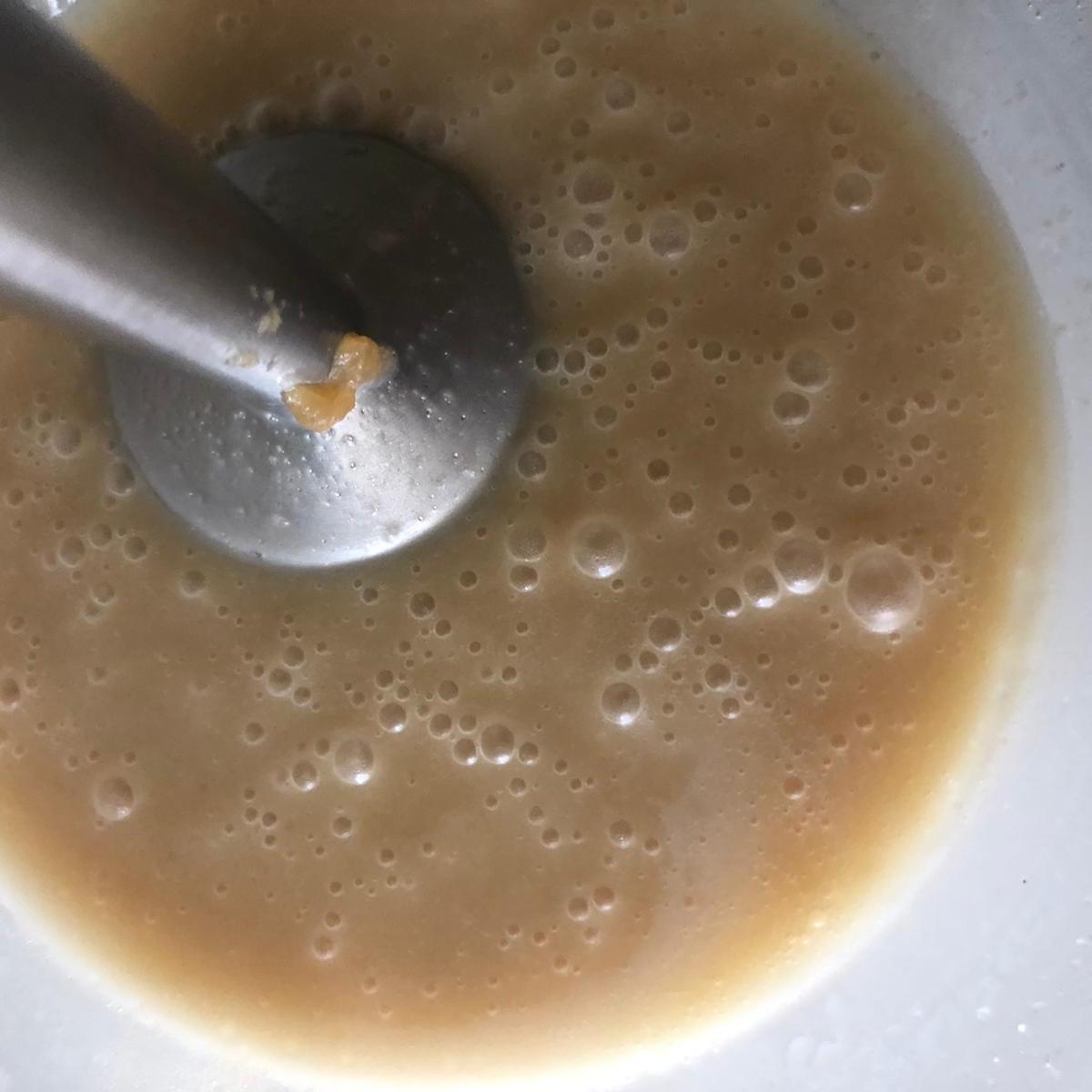 En un recipiente vierte el aceite y añade el azúcar. Mezcla bien con la batidora. Añade la leche y la compota e integra todo bien.