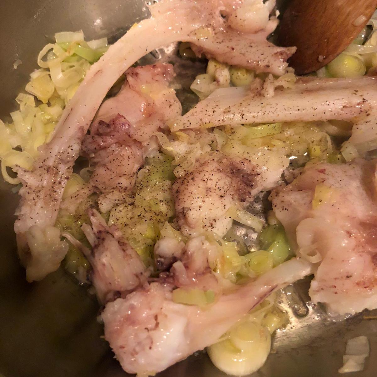 Prepara el fondo de verduras y pescado. Lava el apio y corta en rodajas finas. Calienta un poco de aceite en una cazuela y rehoga a fuego bajo. Cuando esté tierno, añade el rape. Puedes quitarle la espina o cocerlo entero y retirarla después. Sofríe todo durante unos minutos. Ralla el tomate y añade a la cazuela. Salpimenta. Agrega el litro de agua o caldo y cuece a fuego bajo-medio hasta que reduzca.