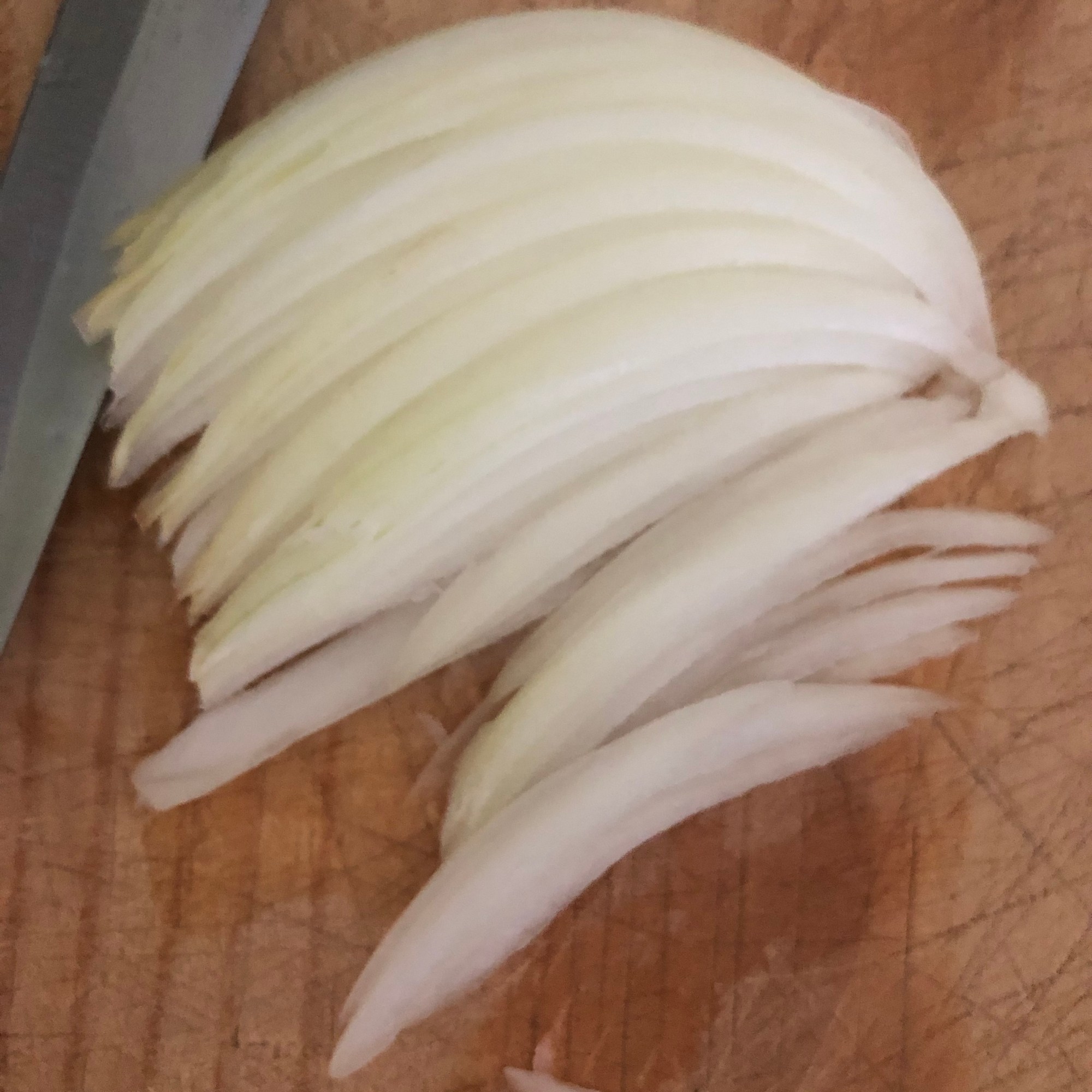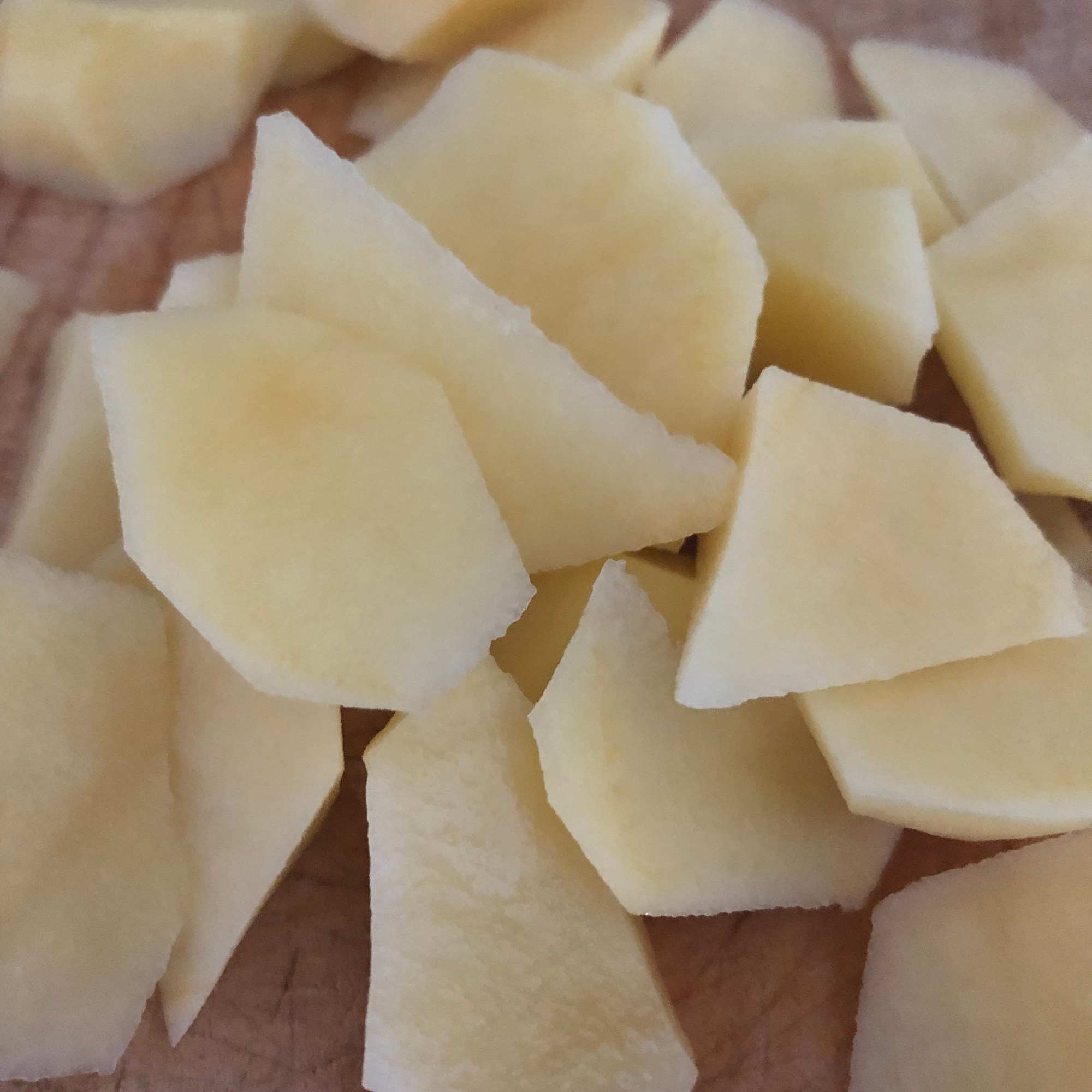 Corta la cebolla en juliana, la calabaza en cubos medianos y la patata en láminas de tamaño mediano.