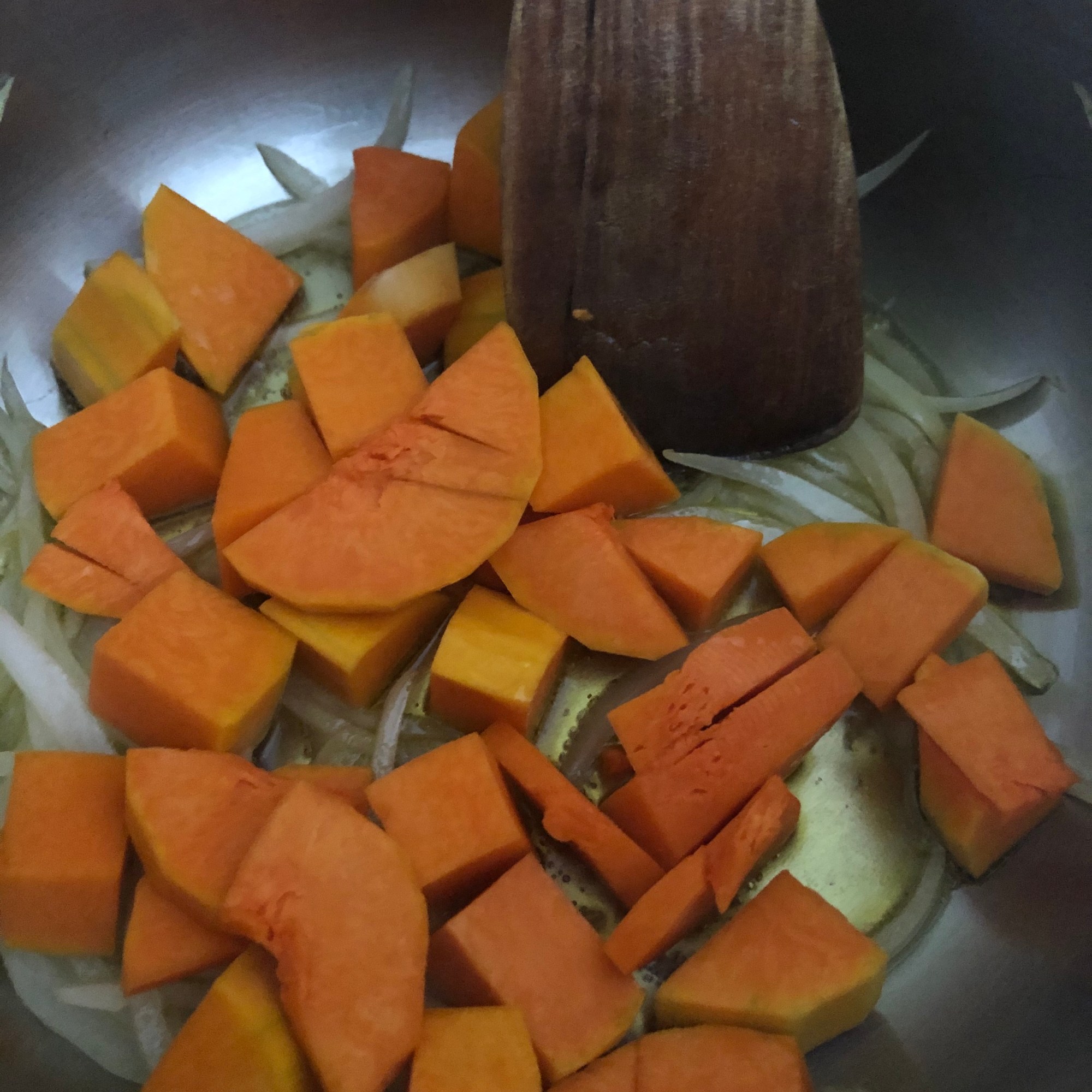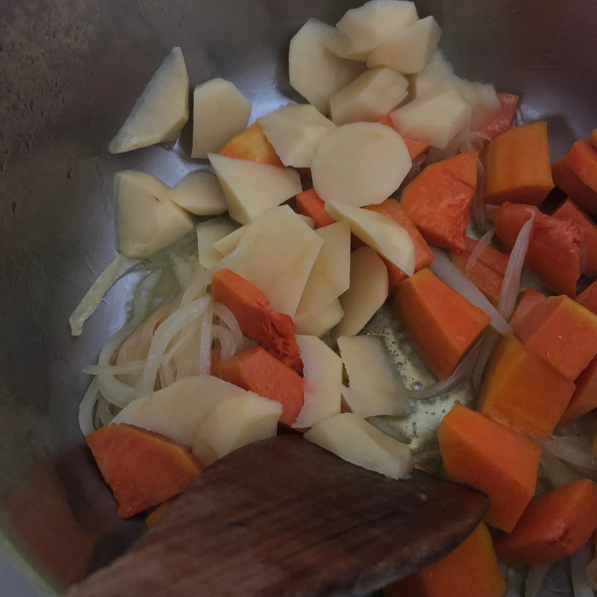 Pon un poco de aceite en una cazuela y sofríe la cebolla a fuego lento hasta que cambie de color. Añade la calabaza y cocina por unos minutos. Después agrega la patata y cocina todo junto.