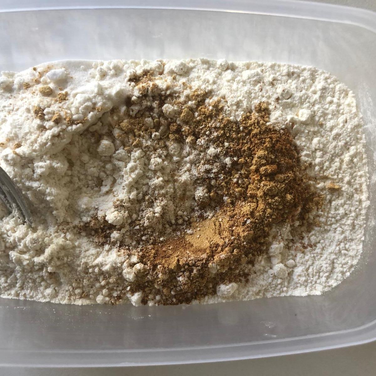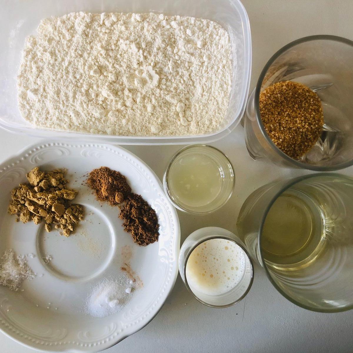 En un recipiente grande mezcla los ingredientes secos (menos el azúcar): harina, especias (jengibre, nuez moscada y canela), bicarbonato y sal.