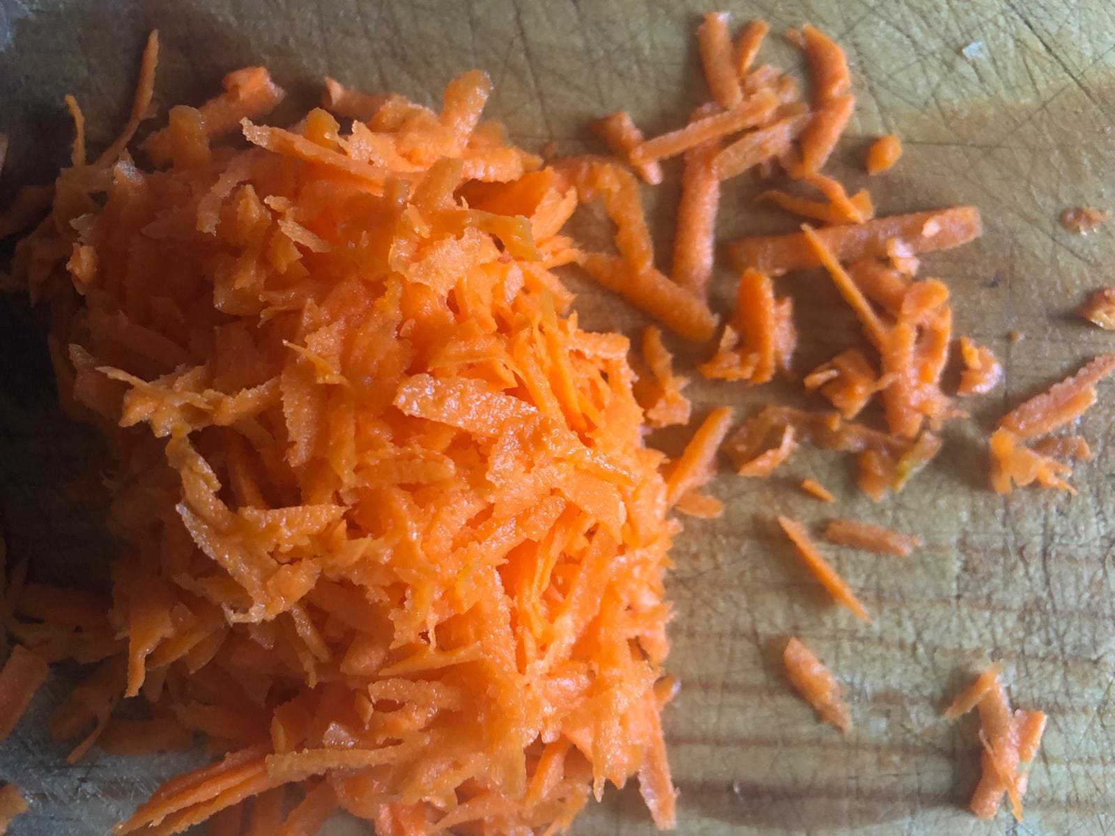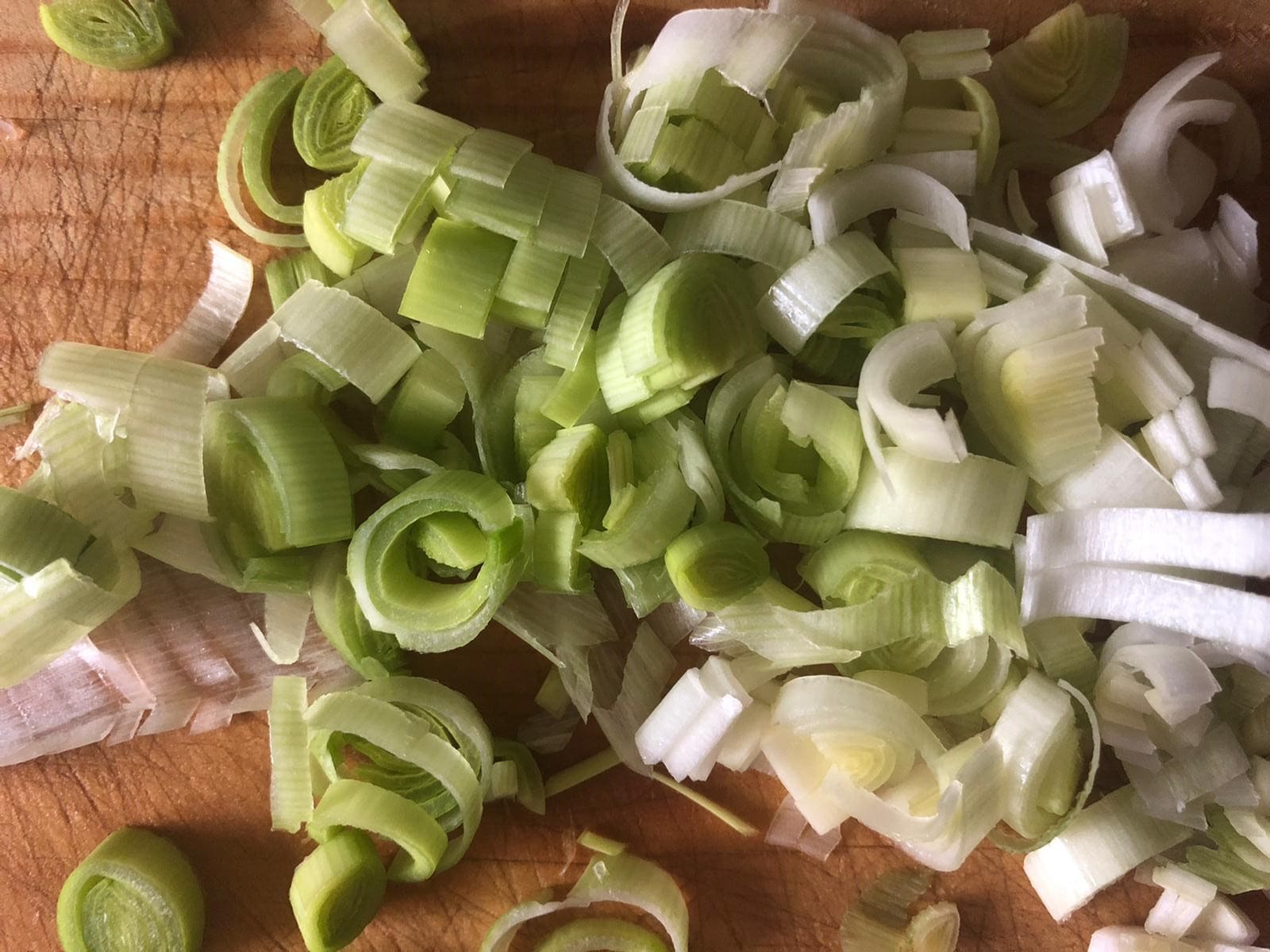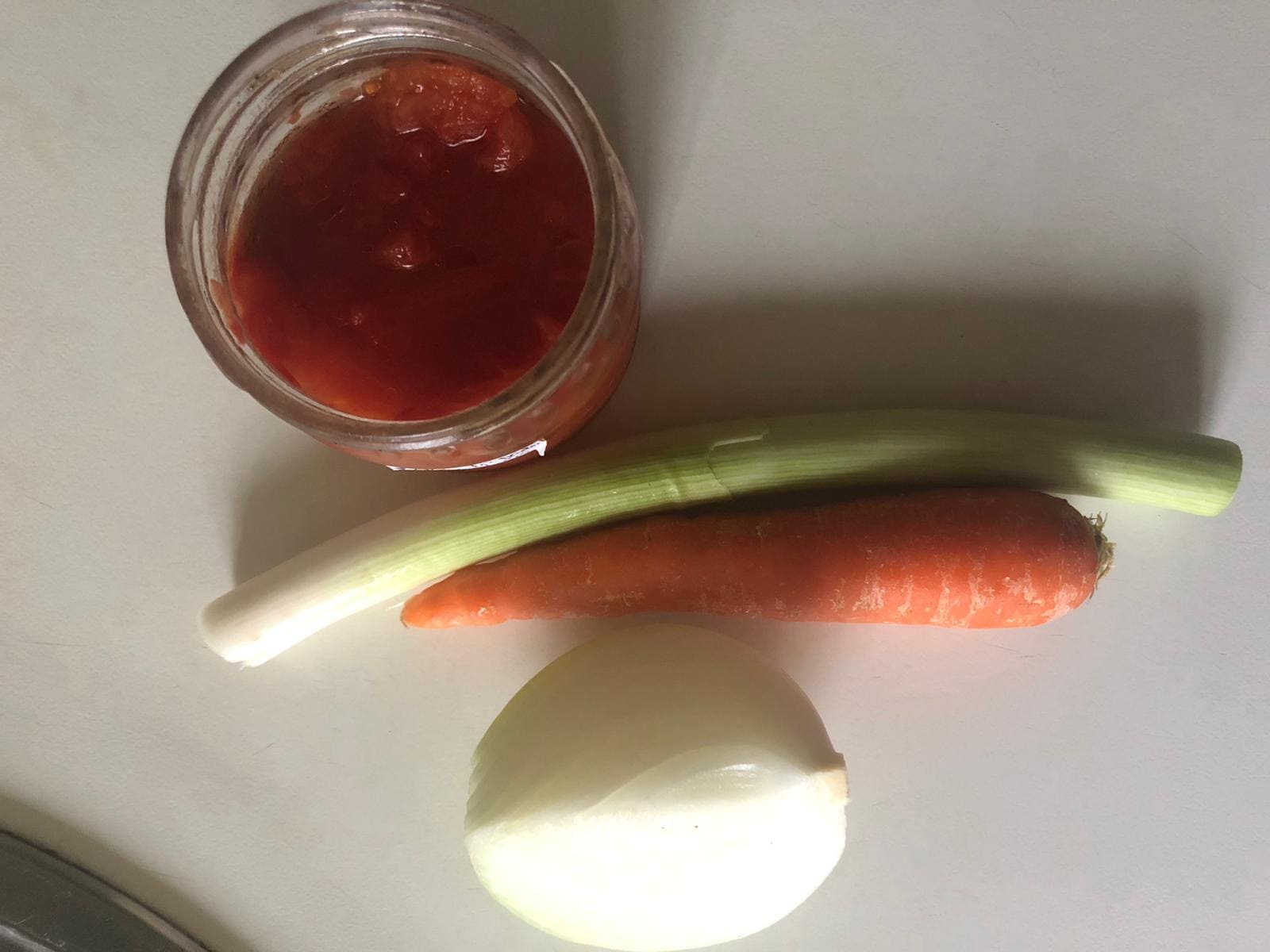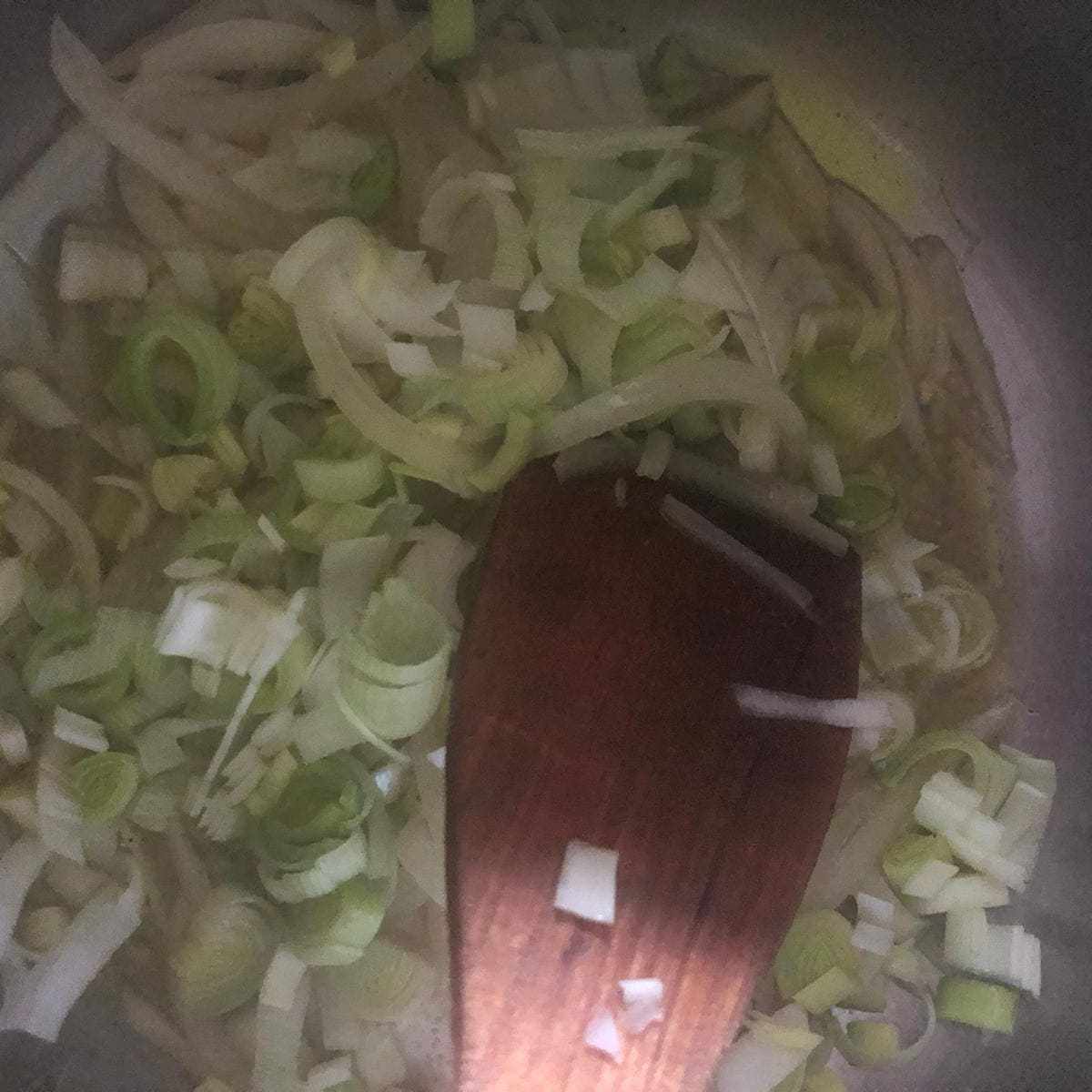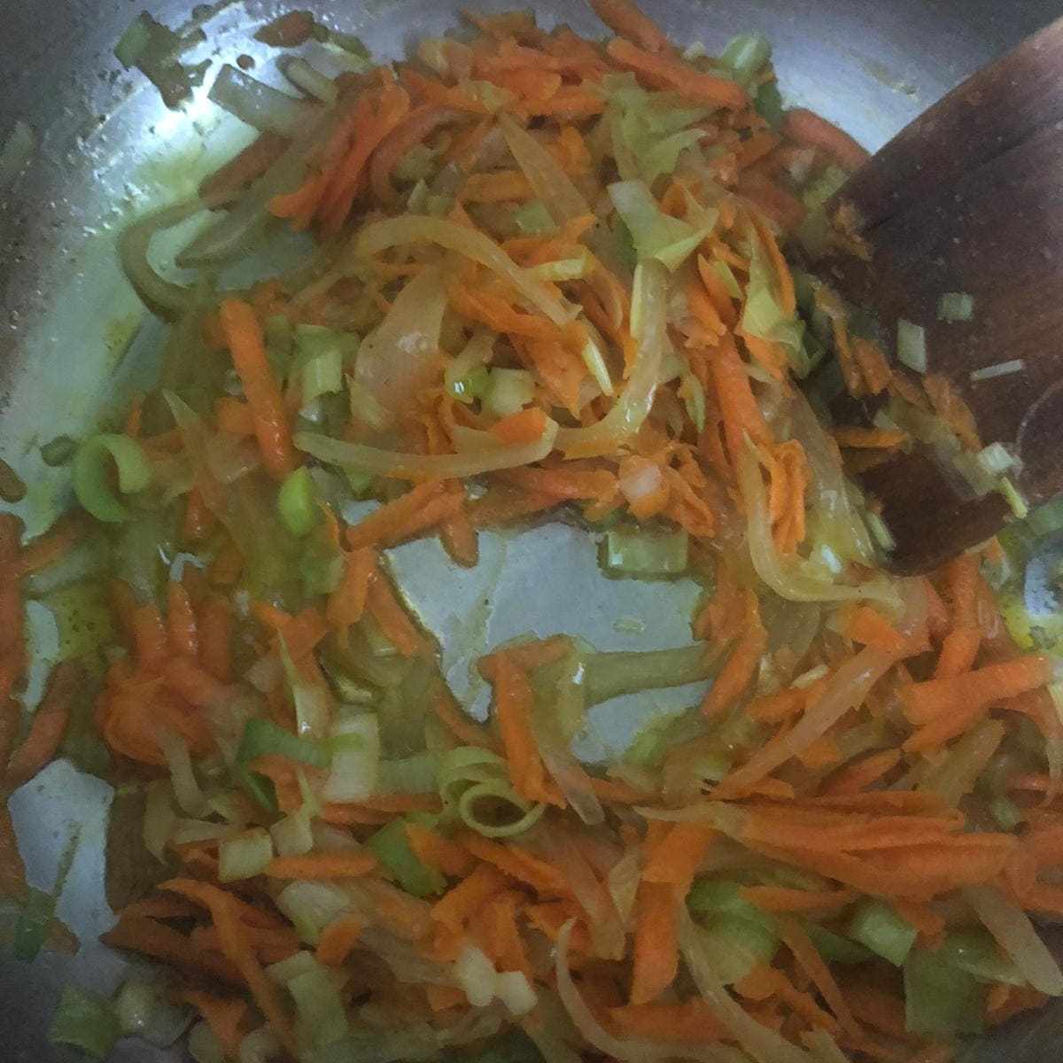 Prepara el fondo de verduras. Lava y pica todos los ingredientes: cebolla en juliana, puerro en rodajas finas, ralla la zanahoria y el tomate.