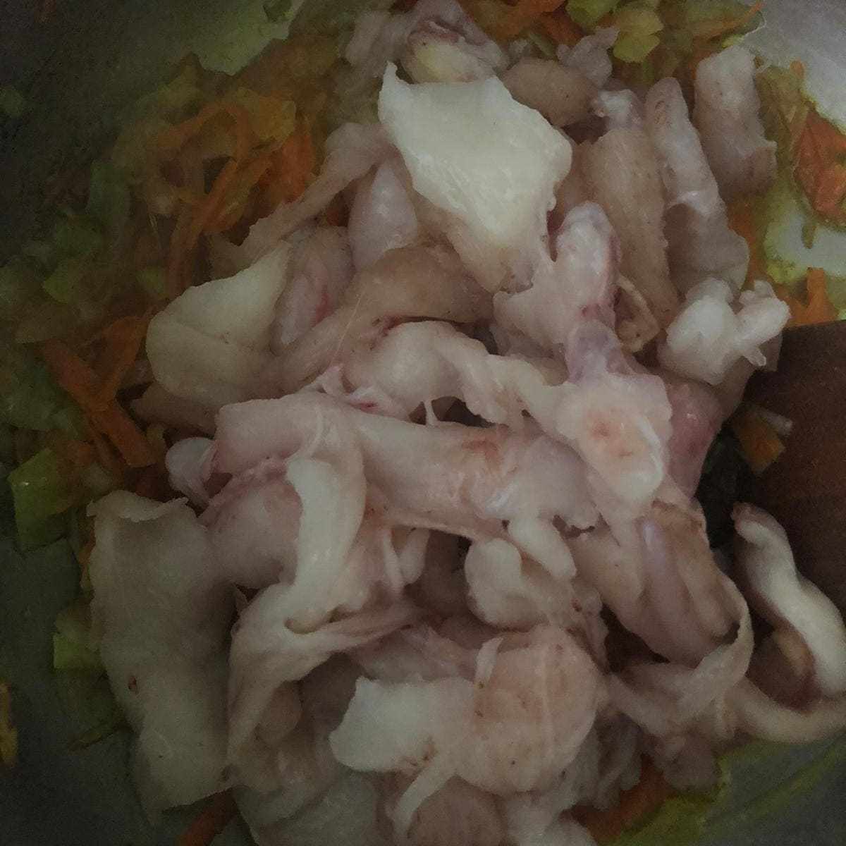 Calienta un poco de aceite en una cazuela y sofríe la cebolla a fuego bajo. Cuando empiece a estar transparente añade el puerro y cocina durante unos minutos. Agrega la zanahoria y sofríe hasta que esté blandita. Por último, añade el rape y los langostinos bien picaditos (reserva unos cuantos para decorar). Salpimenta y cocina todo junto.