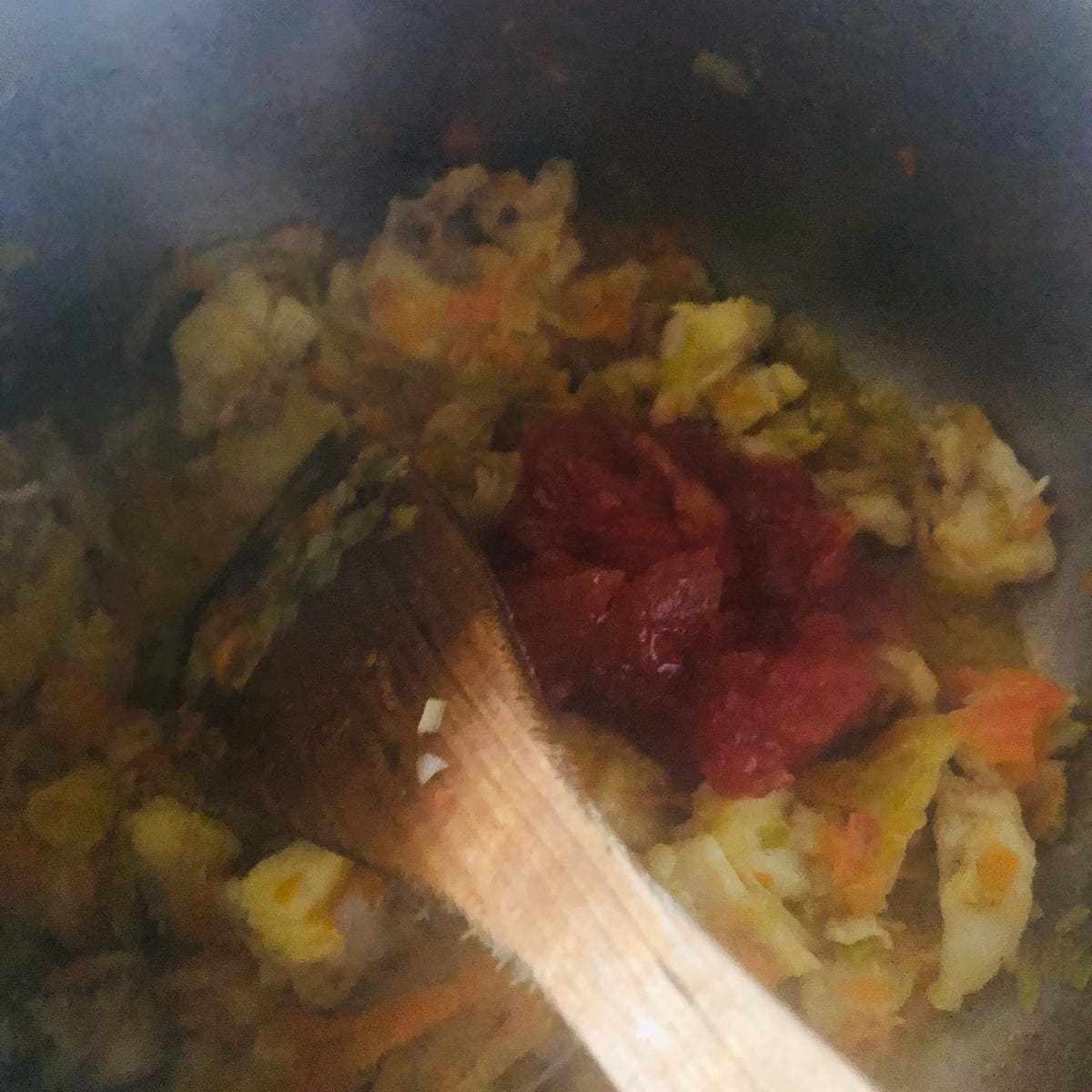 Agrega el tomate, la cuchardita de azúcar (para reducir la acidez) y el caldo y cuece unos 30 minutos. Tritura con una batidora potente (si es necesario puedes utilizar el chino).