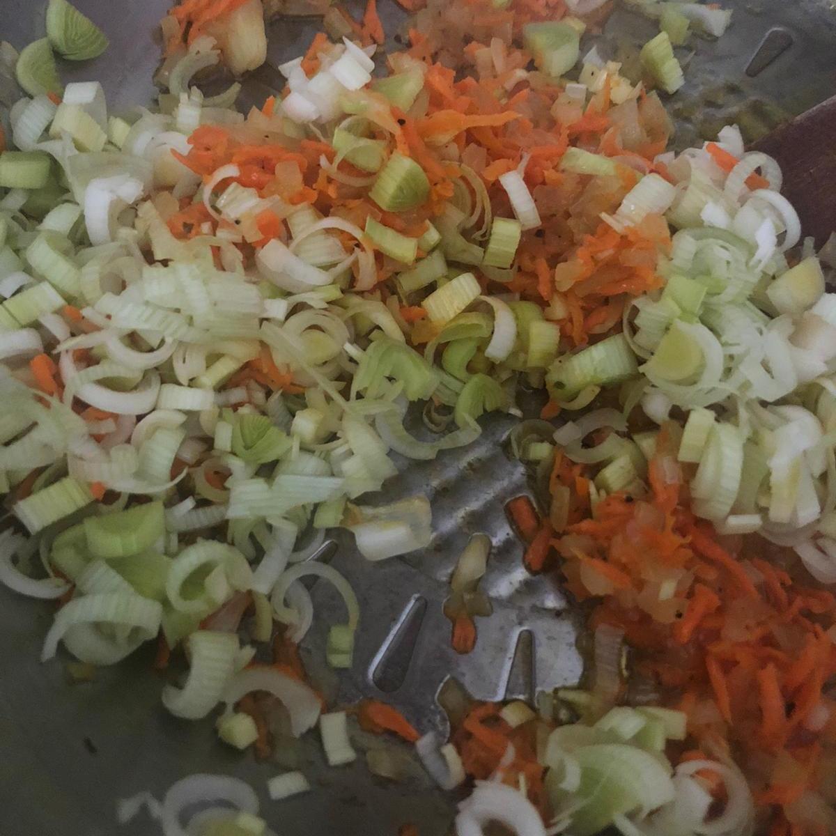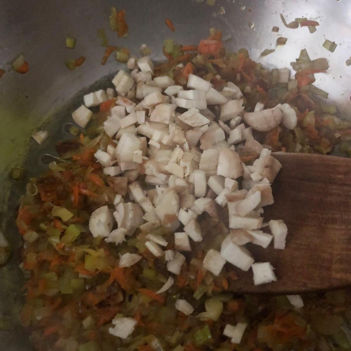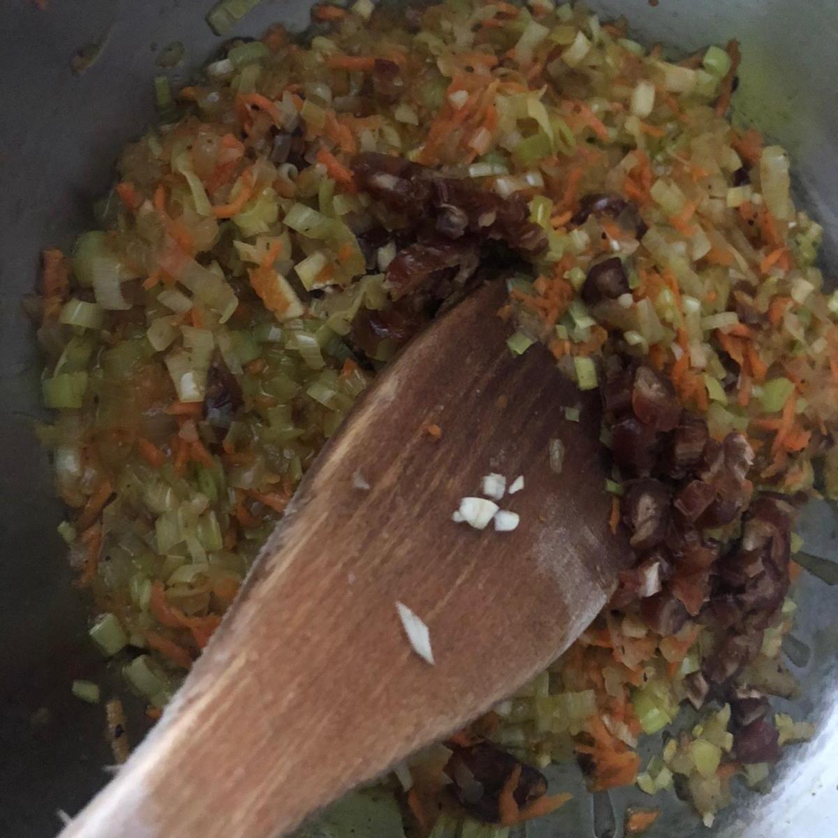 Calienta un poco de aceite en una sartén y pocha la cebolla a fuego lento. Cuando empiece a estar transparente añade el puerro y la zanahoria. Cocina unos minutos y agrega el ajo y los dátiles. Finalmente, añade los champiñones y las especias: sal, pimienta, orégano, nuez moscada y canela. Cocina unos 10 minutos.