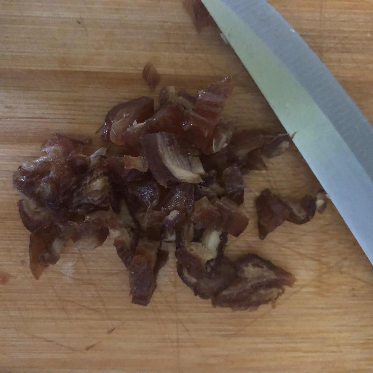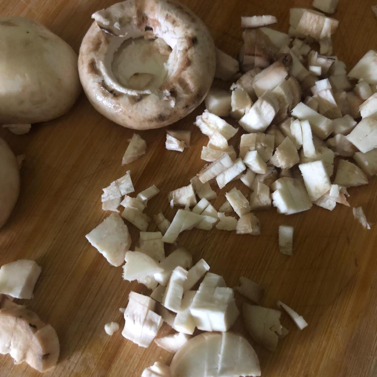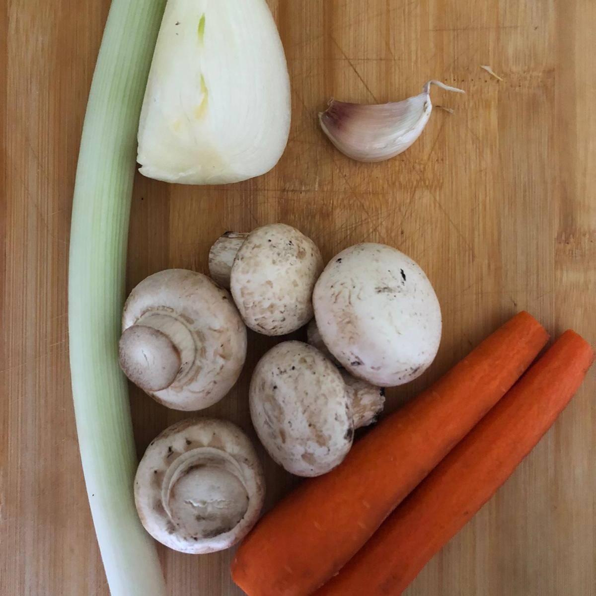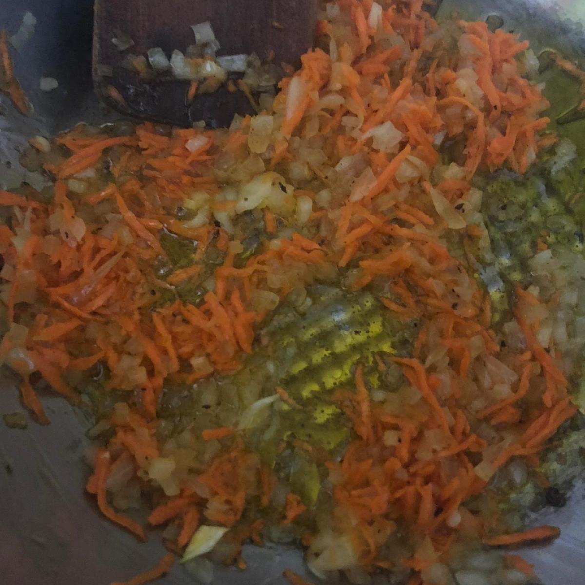 Calienta un poco de aceite en una sartén y pocha la cebolla a fuego lento. Cuando empiece a estar transparente añade el puerro y la zanahoria. Cocina unos minutos y agrega el ajo y los dátiles. Finalmente, añade los champiñones y las especias: sal, pimienta, orégano, nuez moscada y canela. Cocina unos 10 minutos.