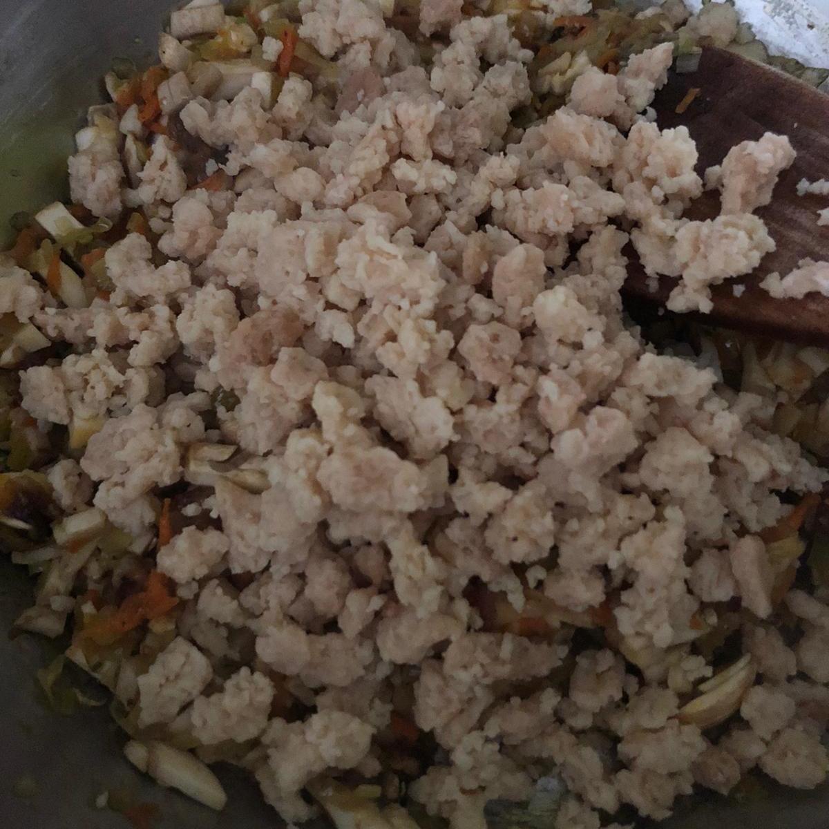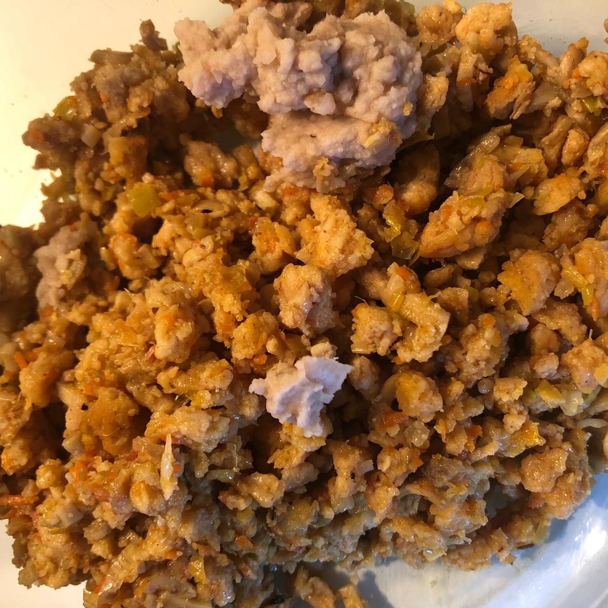 Barajaba la opción de hacerlo con soja texturizada, lentejas o una mezcla de ambas. Finalmente decidí hacerlo sólo con soja y añadir castañas para darle un poco de textura crujiente. Además, el sabor dulzón que le aporta es delicioso y “pega” perfectamente con esta temporada.