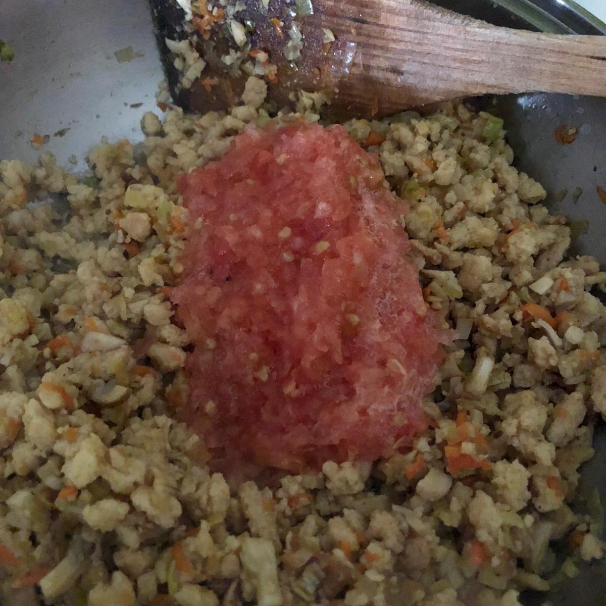 Mientras tanto escurre la soja, haciendo presión con tus manos. Agrega a la sartén junto con el tomate rallado e integra todo bien.