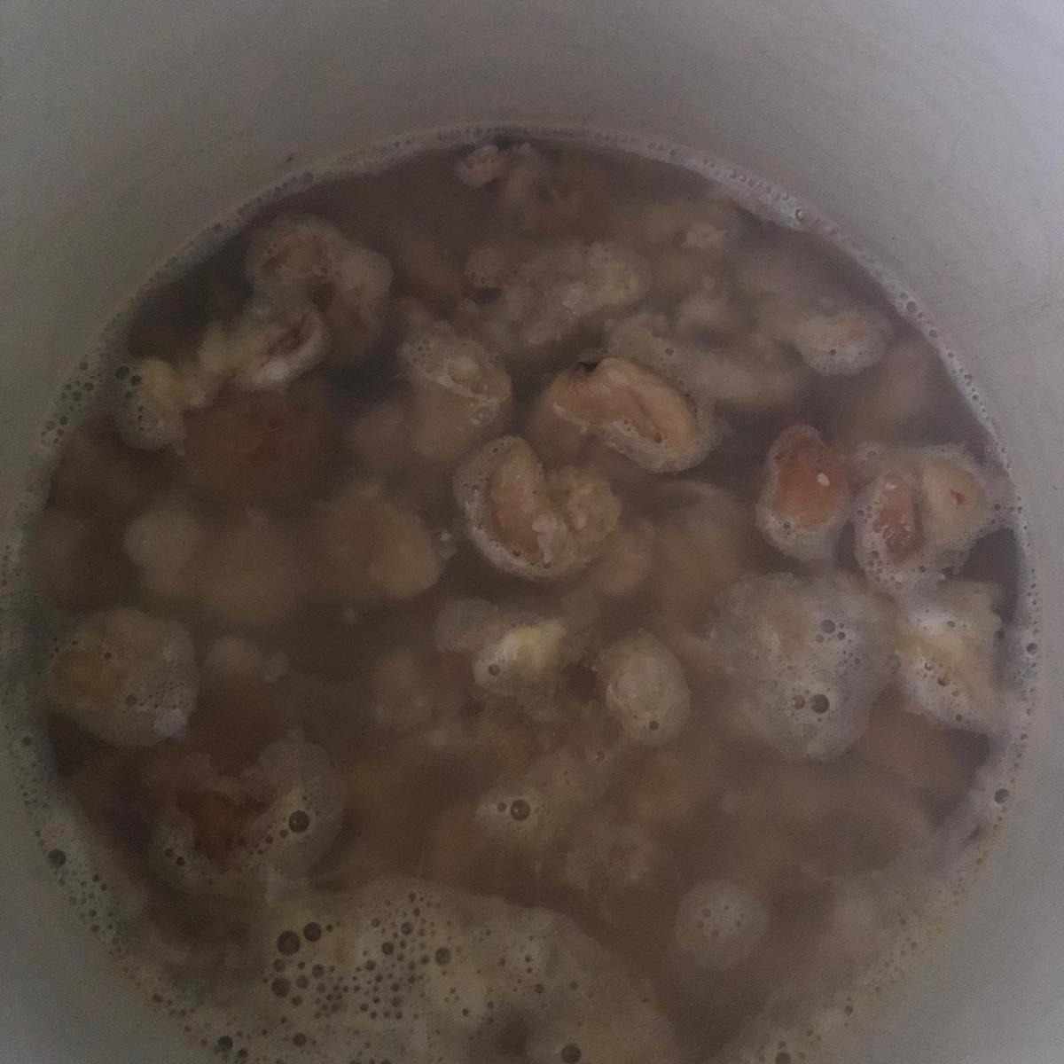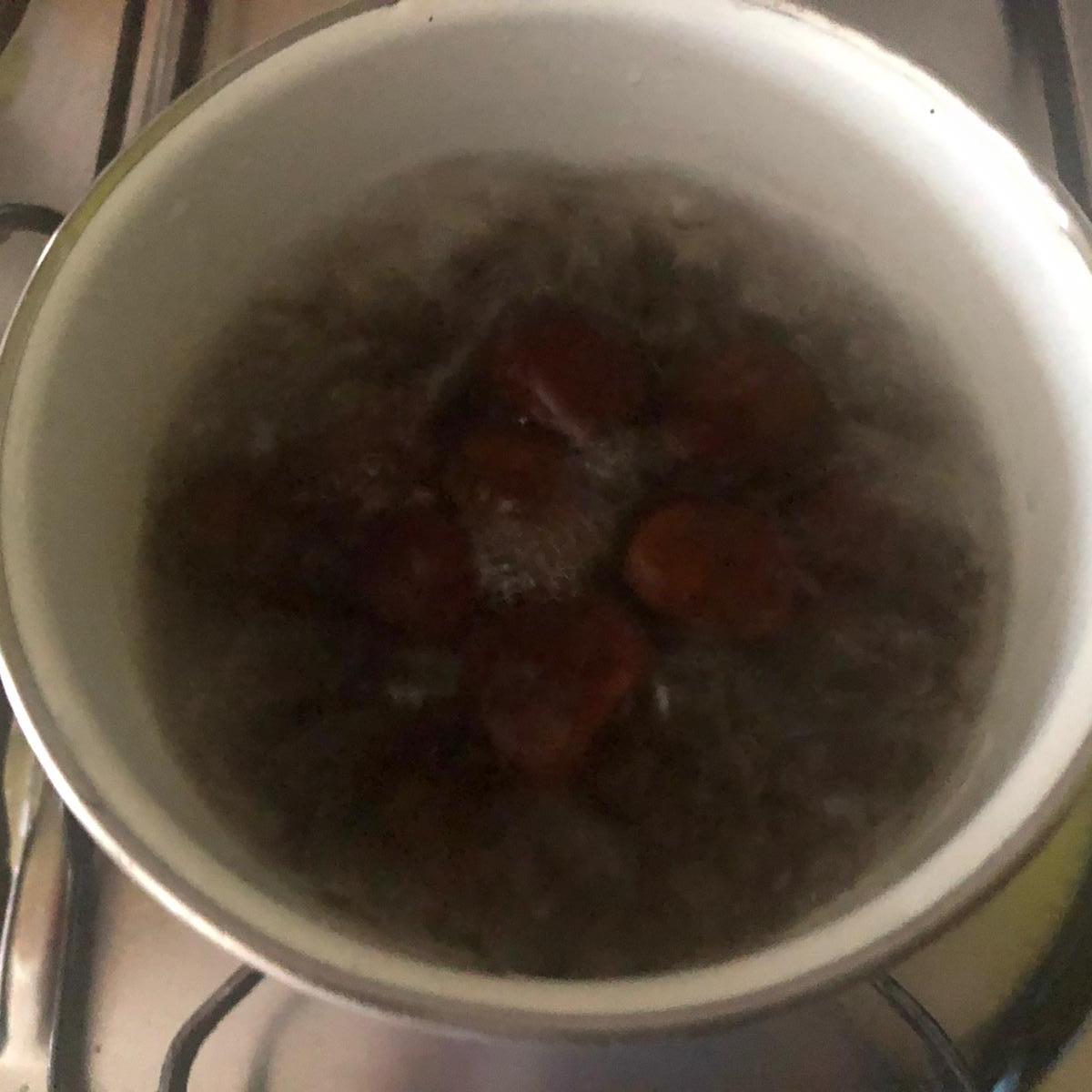 Prepara las castañas. Pon agua a hervir en una cazuela. Haz un corte en el culo de las castañas y añade al agua hirviendo. Cuece durante 20 minutos y escurre. Antes de que se enfríen retira la cáscara. Una vez tengas las castañas listas ponlas de nuevo en una cazuela con un vaso de agua limpia y cuece otros 20 minutos a fuego mínimo, hasta que estén blanditas (si necesitan agua, añade un poco más). Reserva.