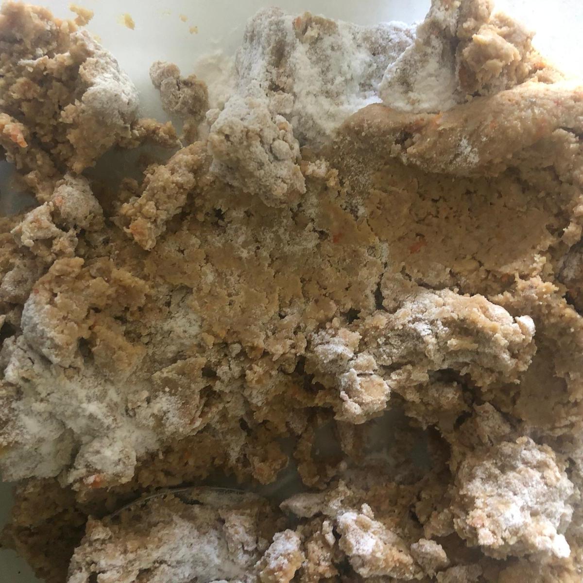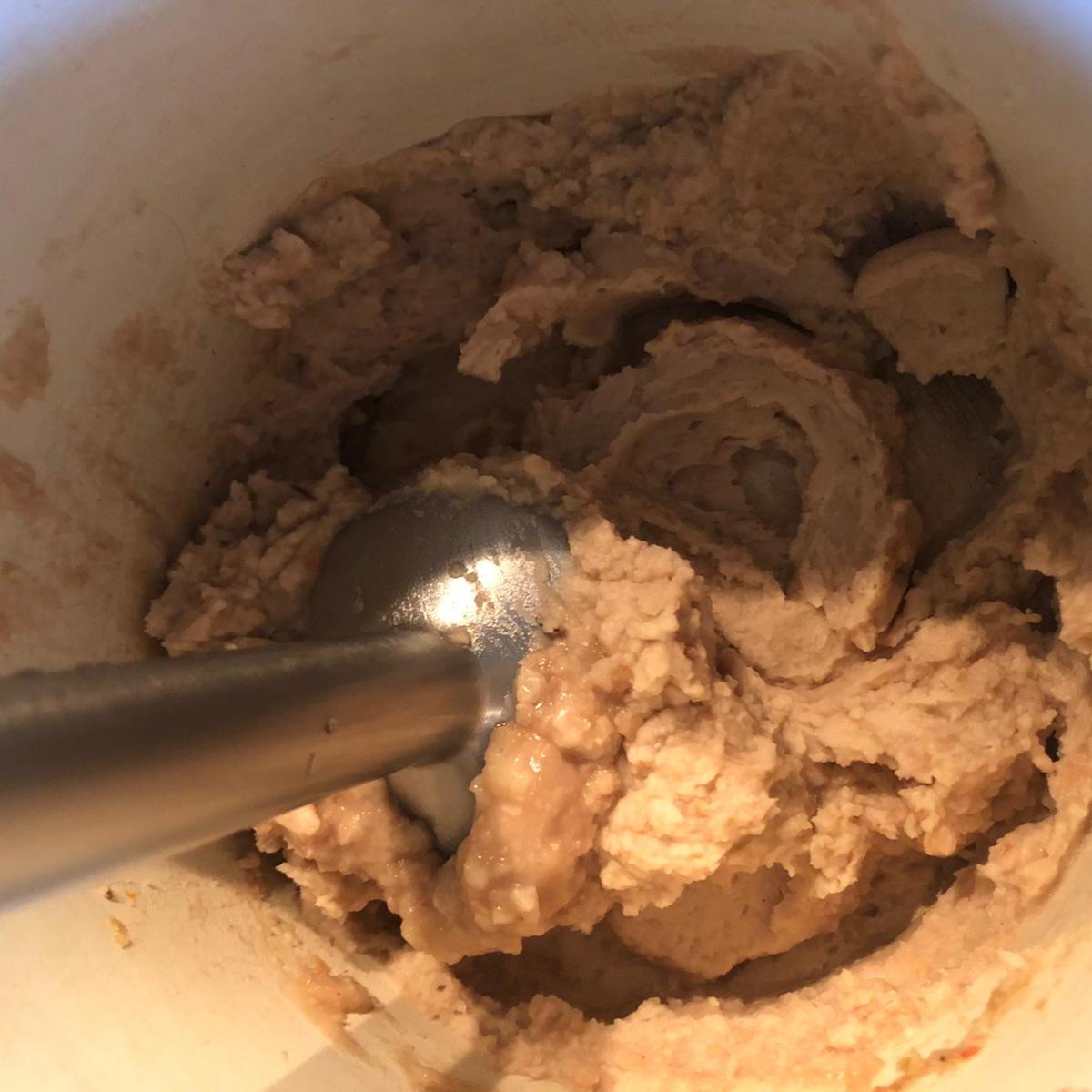 Deja enfriar un poco la salsa y tritura con la batidora (no hace falta pasarla mucho, sólo lo justo para poder manipular la soja). En un recipiente aparte, tritura las castañas. Mezcla todo. Añade la harina e integra bien.