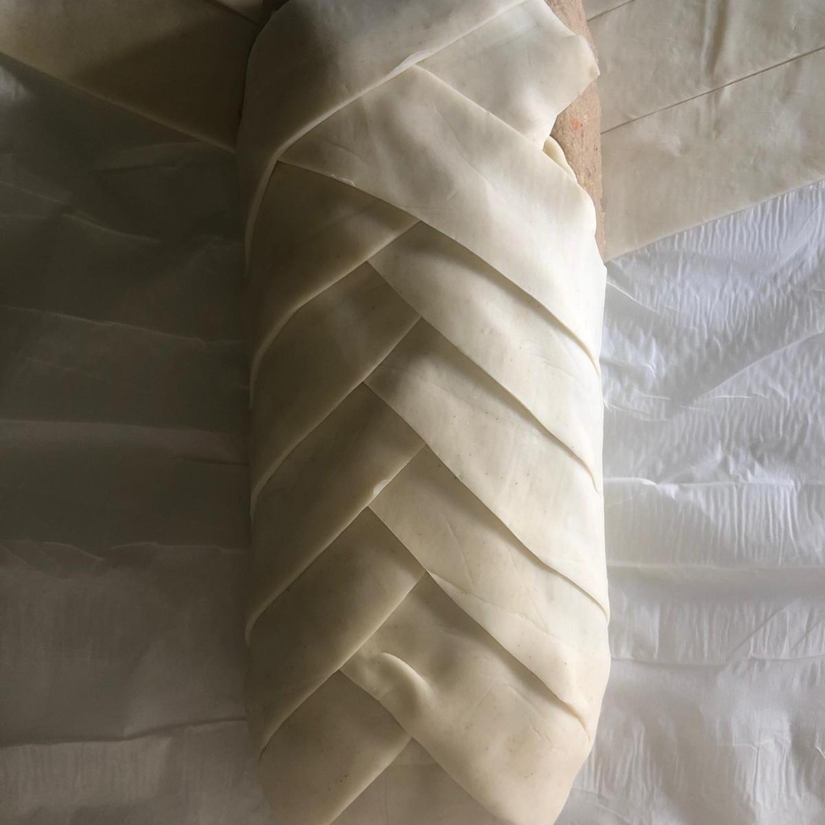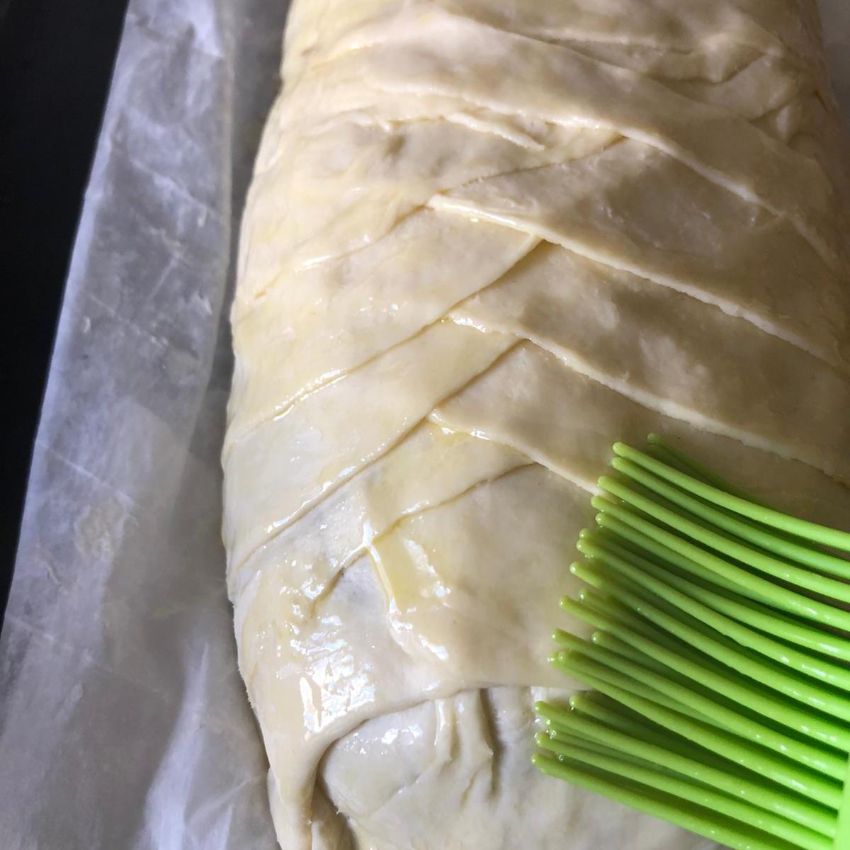 Desenrolla el hojaldre y estíralo un poco con un rodillo. Coloca el rollo de soja en el centro y haz unos cortes longitudinales en la placa de hojaldre para hacer la trenza (te dejo este vídeo). En un vaso mezcla el aceite, la leche y el sirope de agave. Con un pincel barniza el hojaldre.