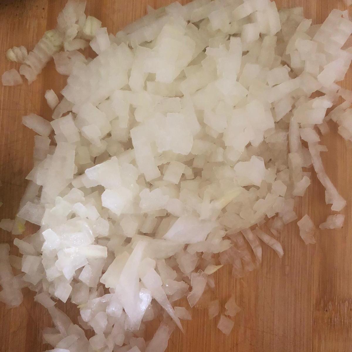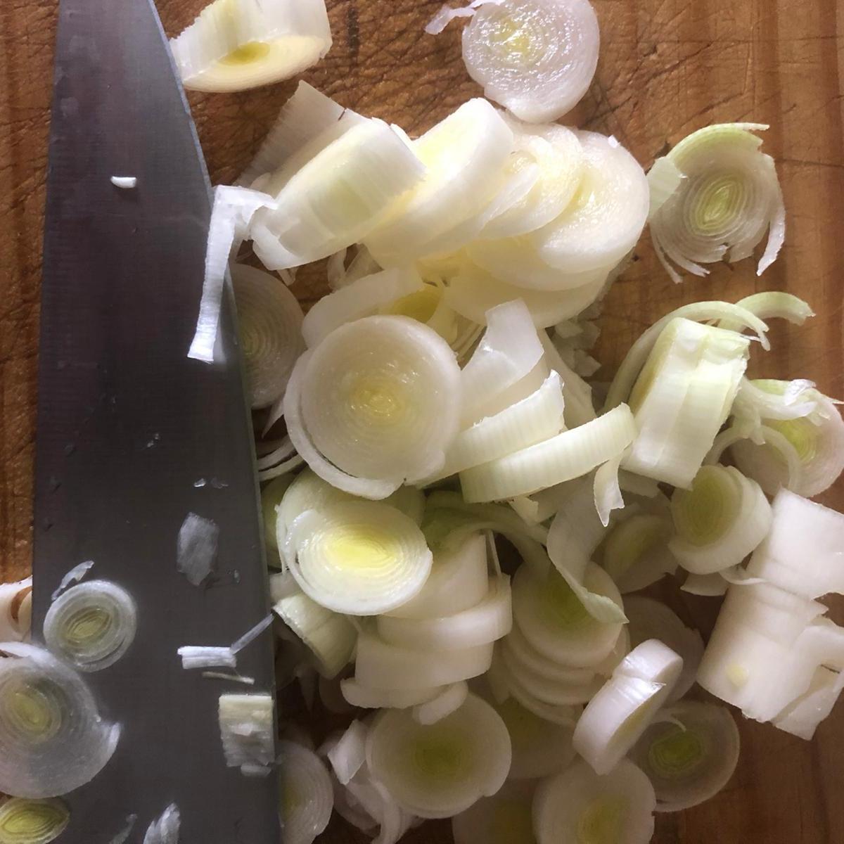 Limpia y prepara las verduras para el relleno. Pica la cebolla, los champiñones y el ajo en brunoise. Quita el hueso de los dátiles y pícalos pequeños. Haz un corte longitudinal en el puerro, lava y corta en rodajas finas. Ralla el tomate.